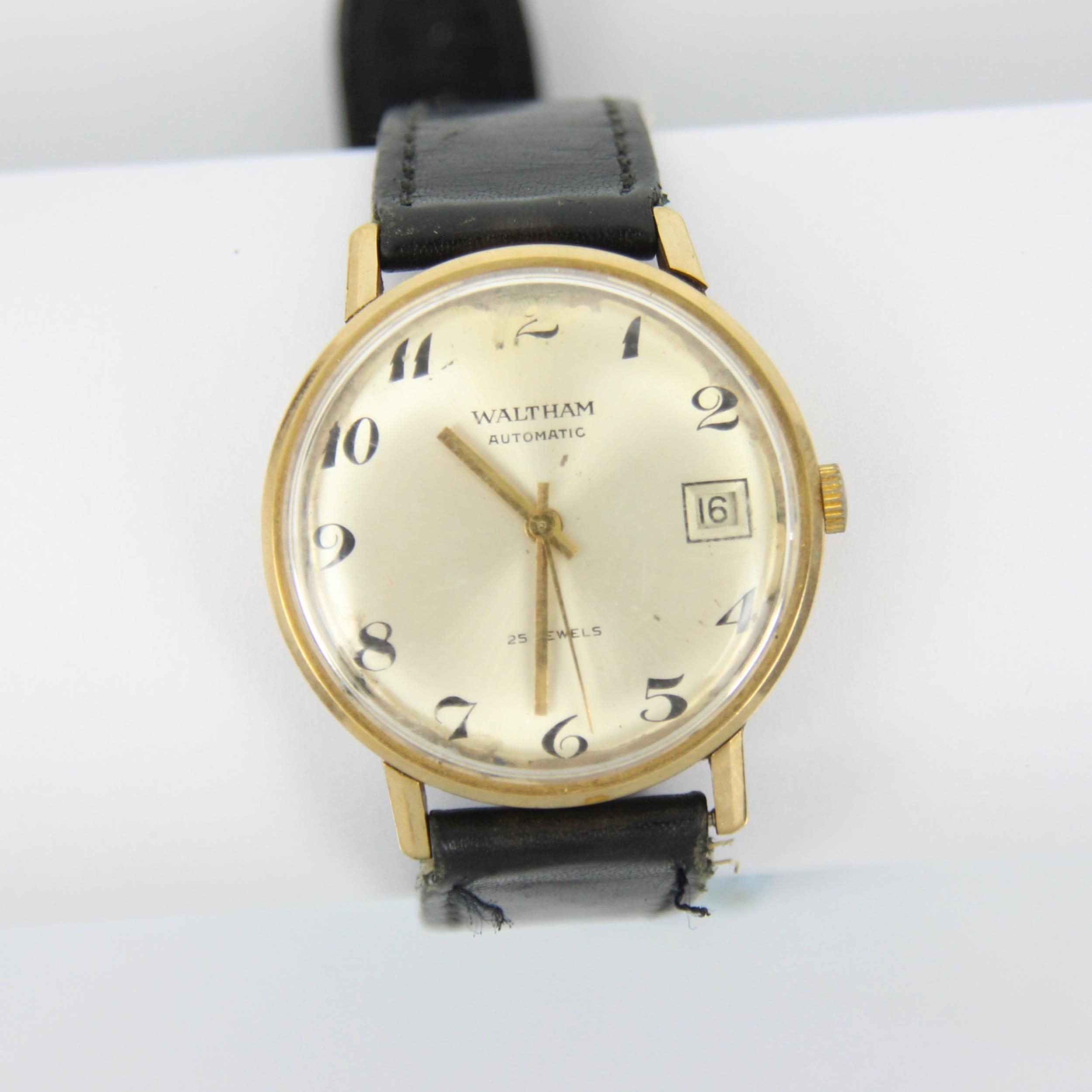 A 9ct gold cased Waltham 'automatic' wristwatch, the circular cream coloured dial with Arabic numerals and date aperture to 3 o'clock, set to a plain polished case, 3.5cm wide, upon an associated leather strap, 23cm long, gross weight 30gms (including movement and strap)