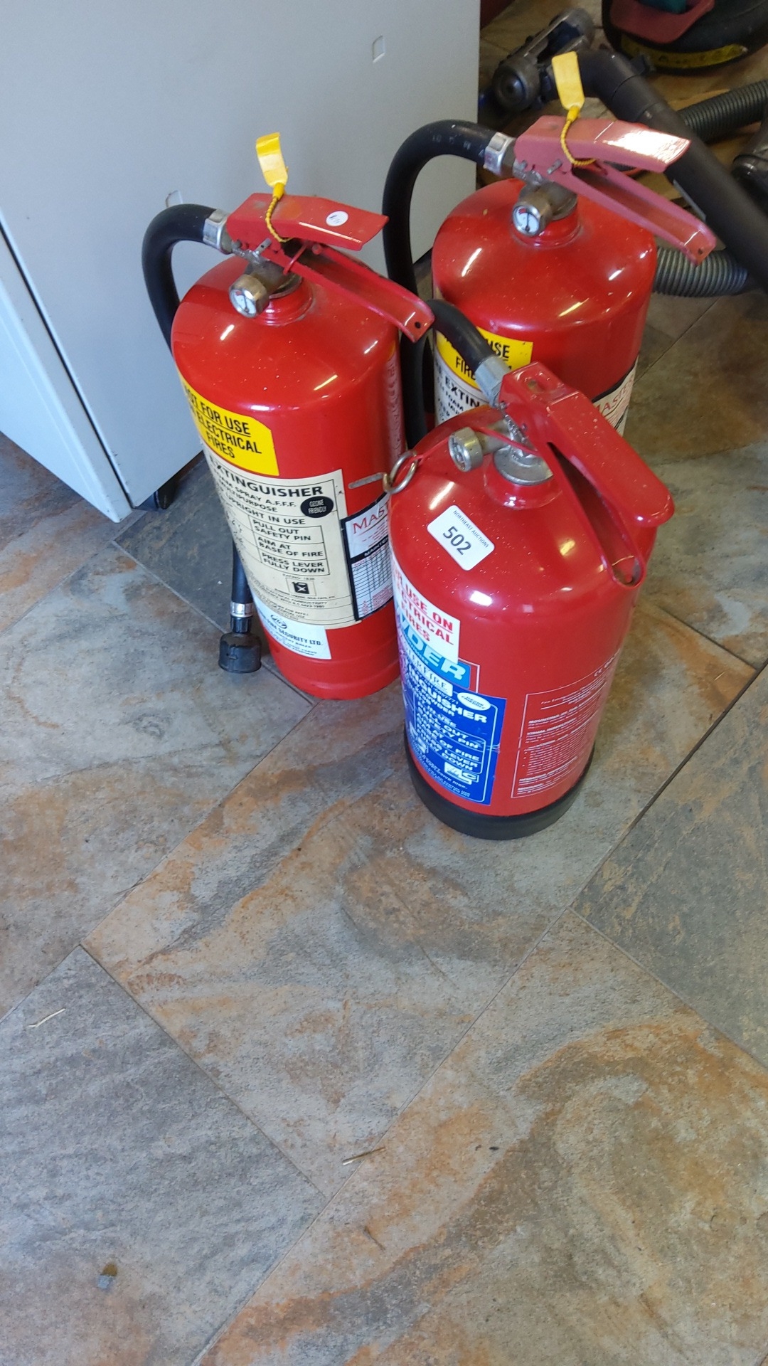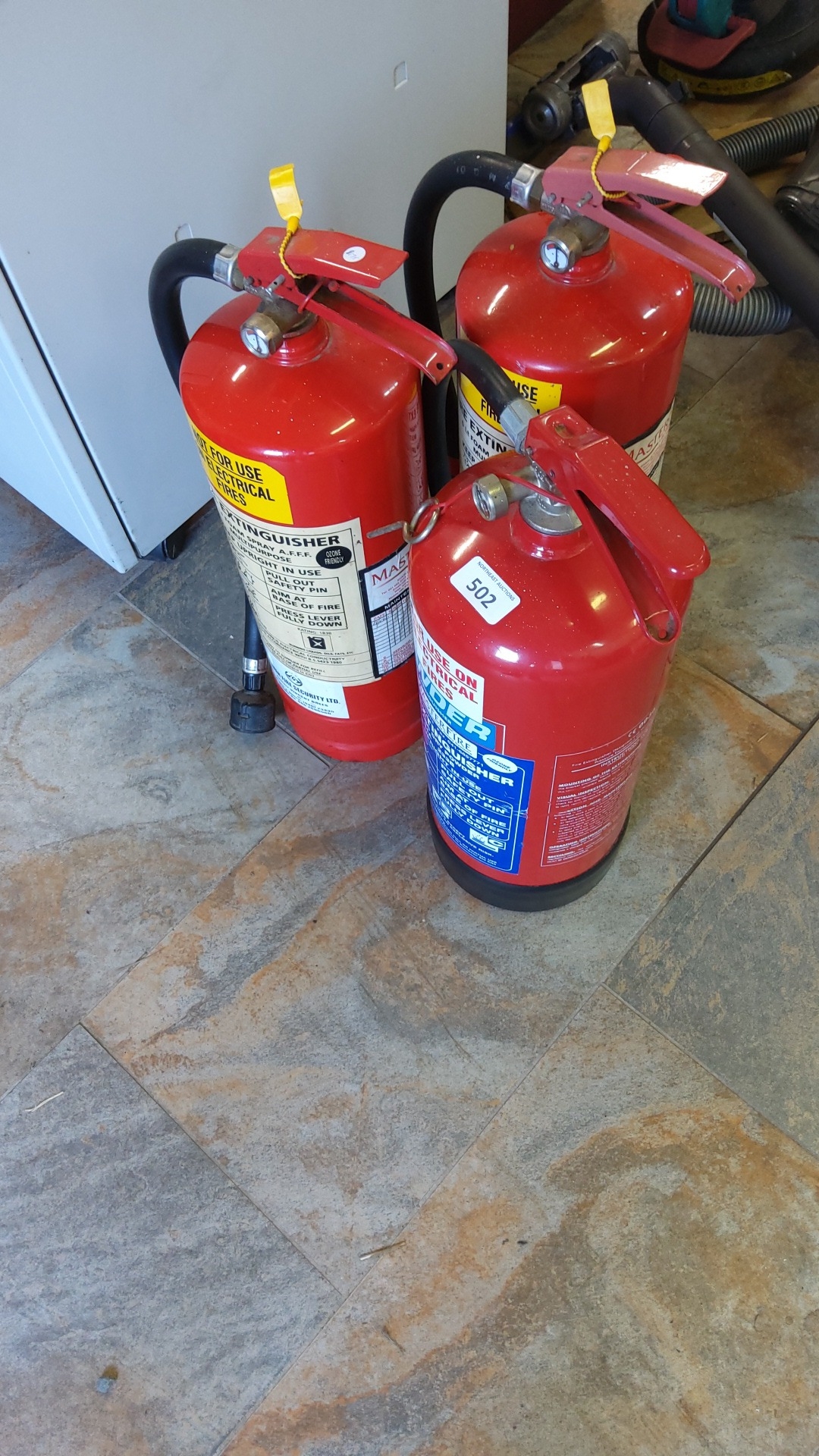 A group of portable fire extinguishers, red-painted cylinders with lever handles, pressure gauges, hoses, and instruction labels including ‘For use on electrical fires’ panels; one bearing a ‘Powder’ designation.(need refilled)