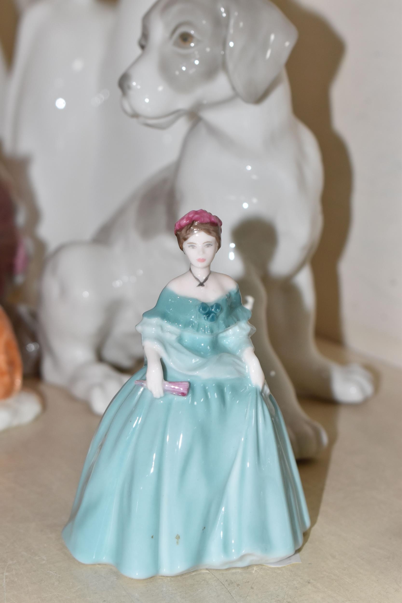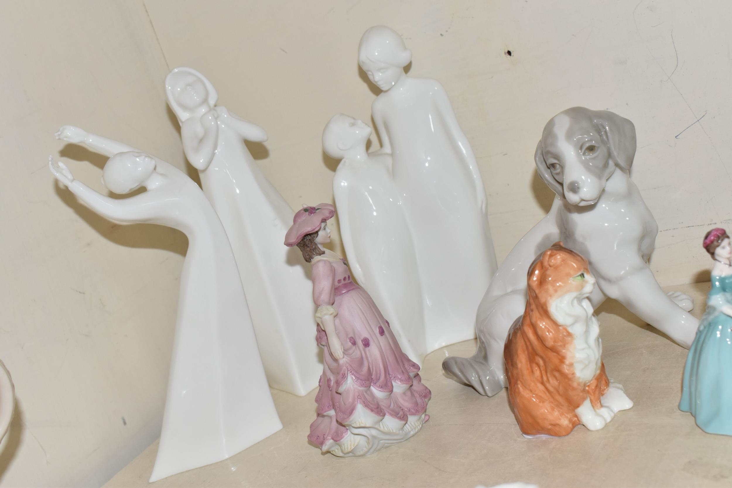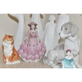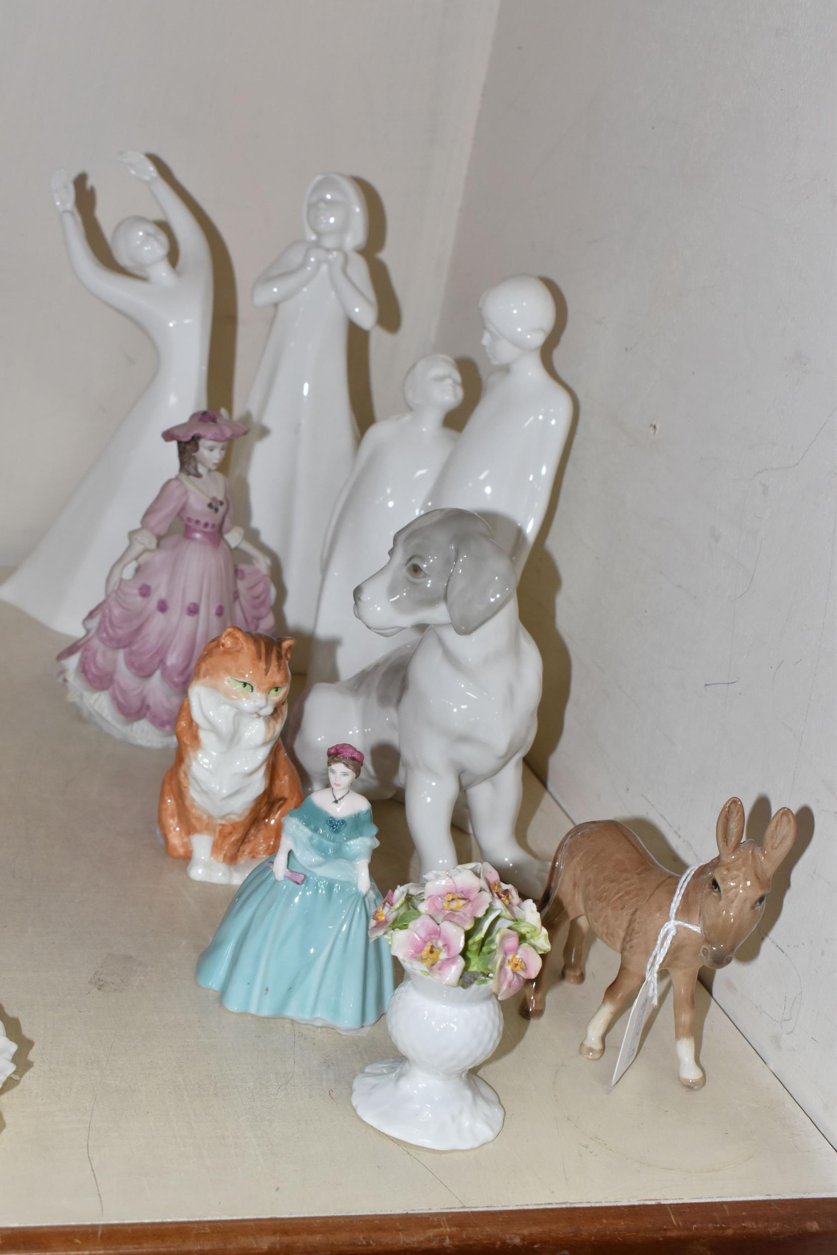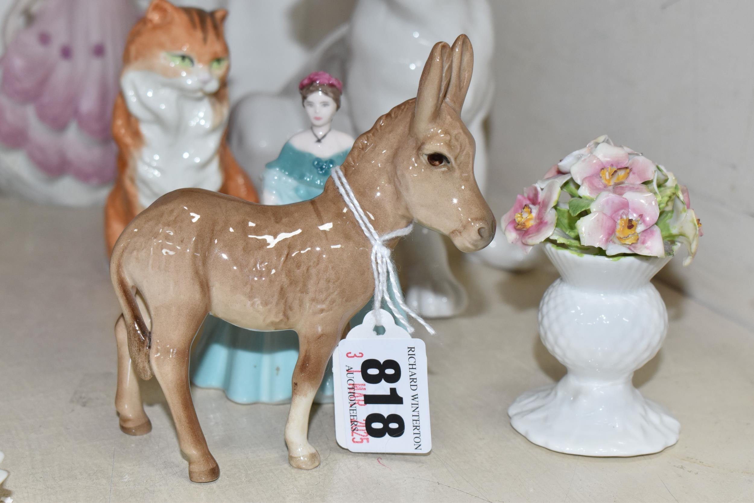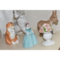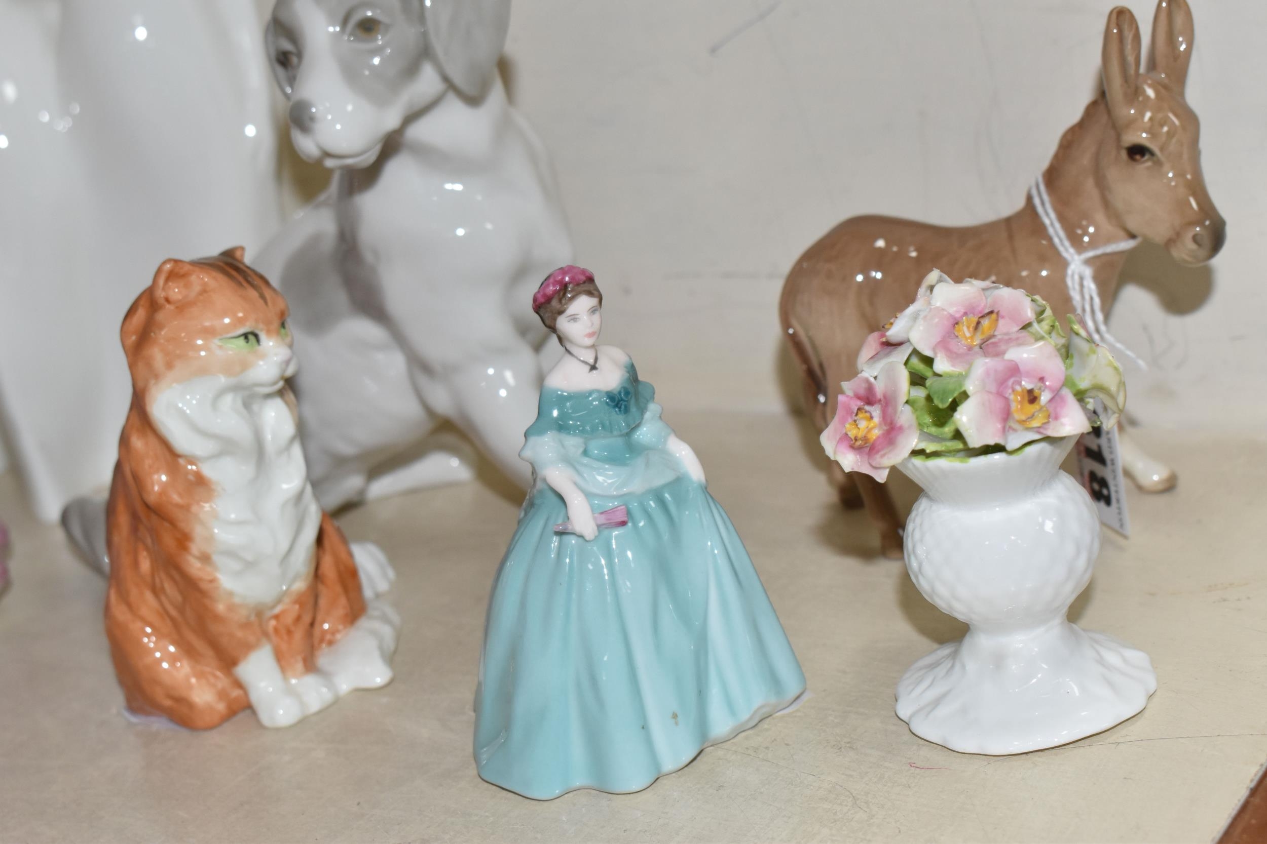 A GROUP OF CERAMIC FIGURES, comprising a Beswick Donkey Foal no 2110, a Royal Worcester Long Haired Cat no 3615, a Nao seated dog, Royal Doulton 'Images' figures: Thankful HN3129, Brother and Sister HN3460 and Awakening HN2875 (tiny nibbles around bases), Coalport Beau Monde: Elizabeth and Coalport Flora figurines, together with a Coalport modelled flower ornament (multiple chips and losses) (9) (Condition Report: most pieces appear ok, specific obvious damage as stated)