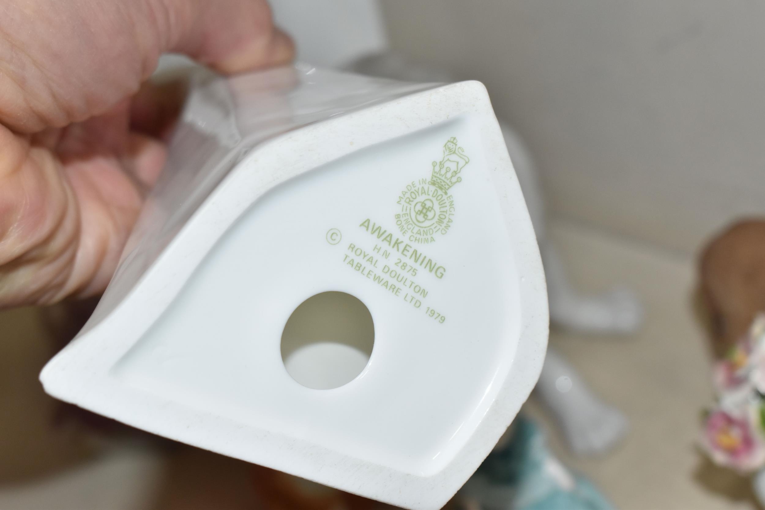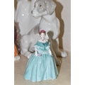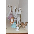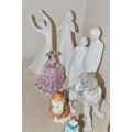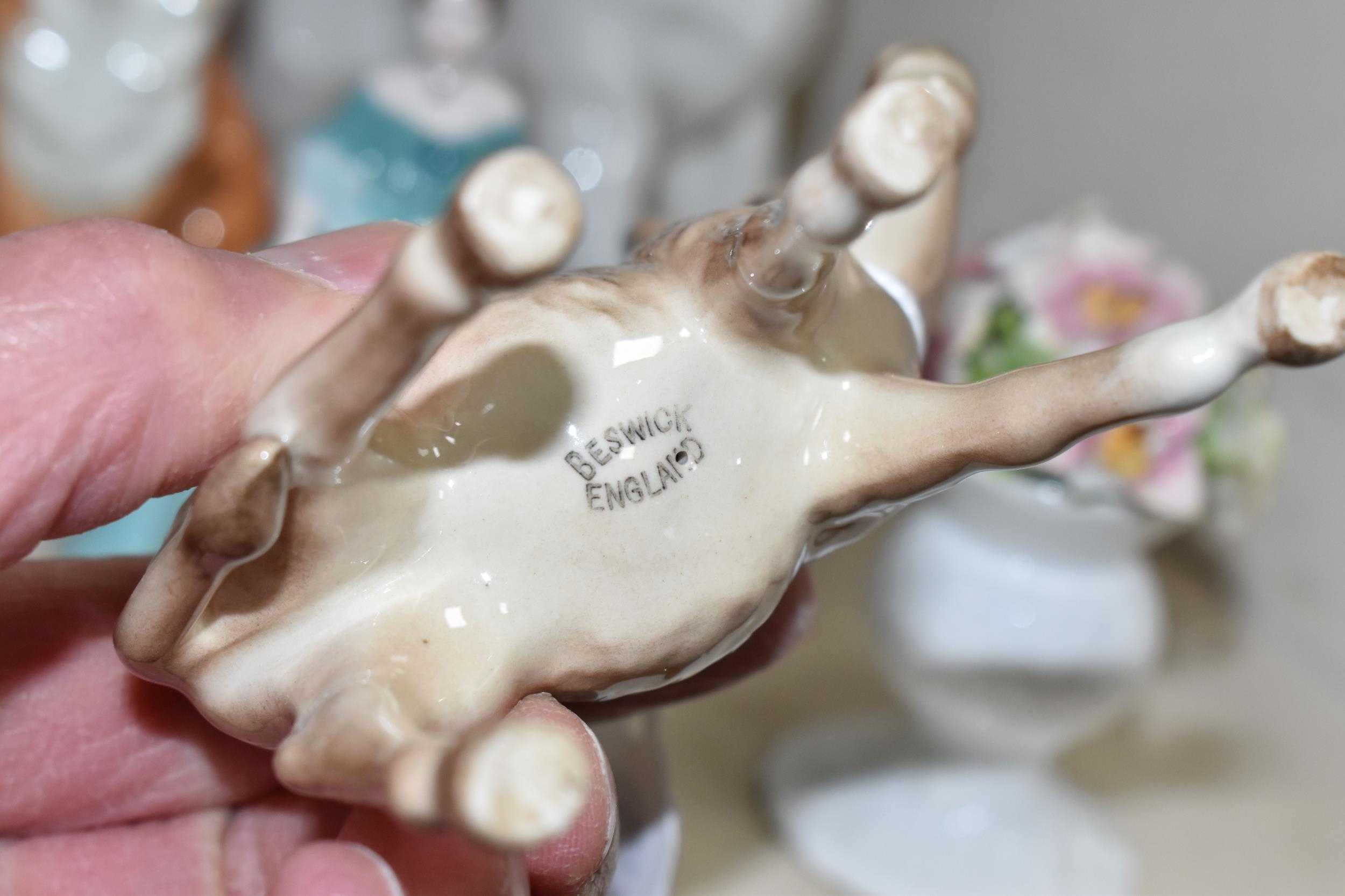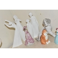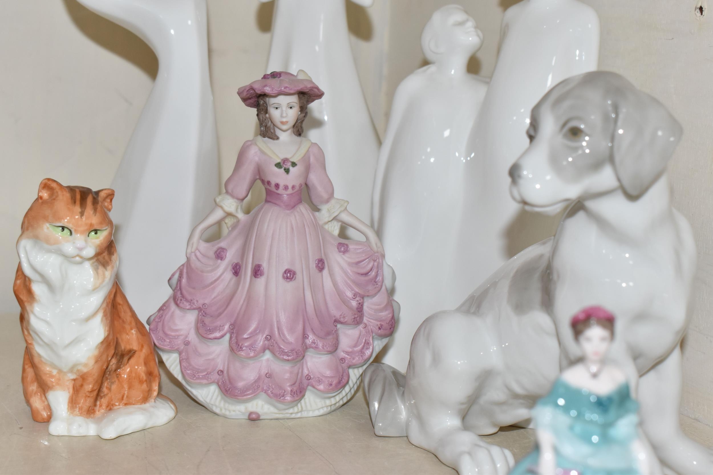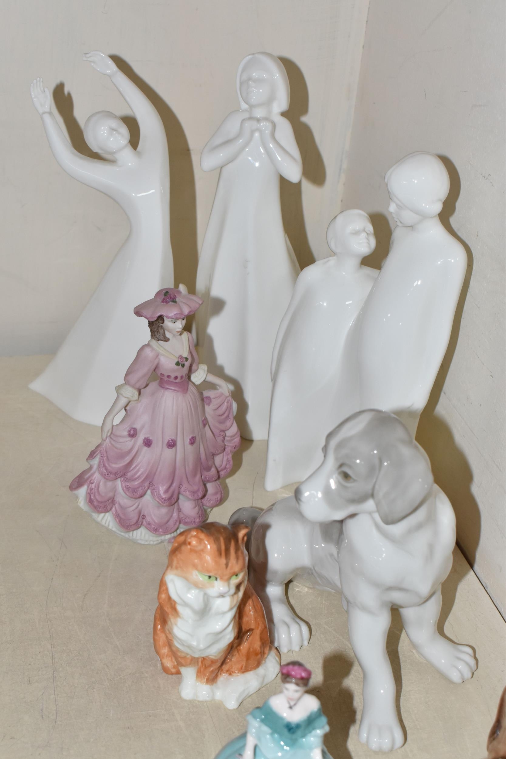 A GROUP OF CERAMIC FIGURES, comprising a Beswick Donkey Foal no 2110, a Royal Worcester Long Haired Cat no 3615, a Nao seated dog, Royal Doulton 'Images' figures: Thankful HN3129, Brother and Sister HN3460 and Awakening HN2875 (tiny nibbles around bases), Coalport Beau Monde: Elizabeth and Coalport Flora figurines, together with a Coalport modelled flower ornament (multiple chips and losses) (9) (Condition Report: most pieces appear ok, specific obvious damage as stated)