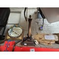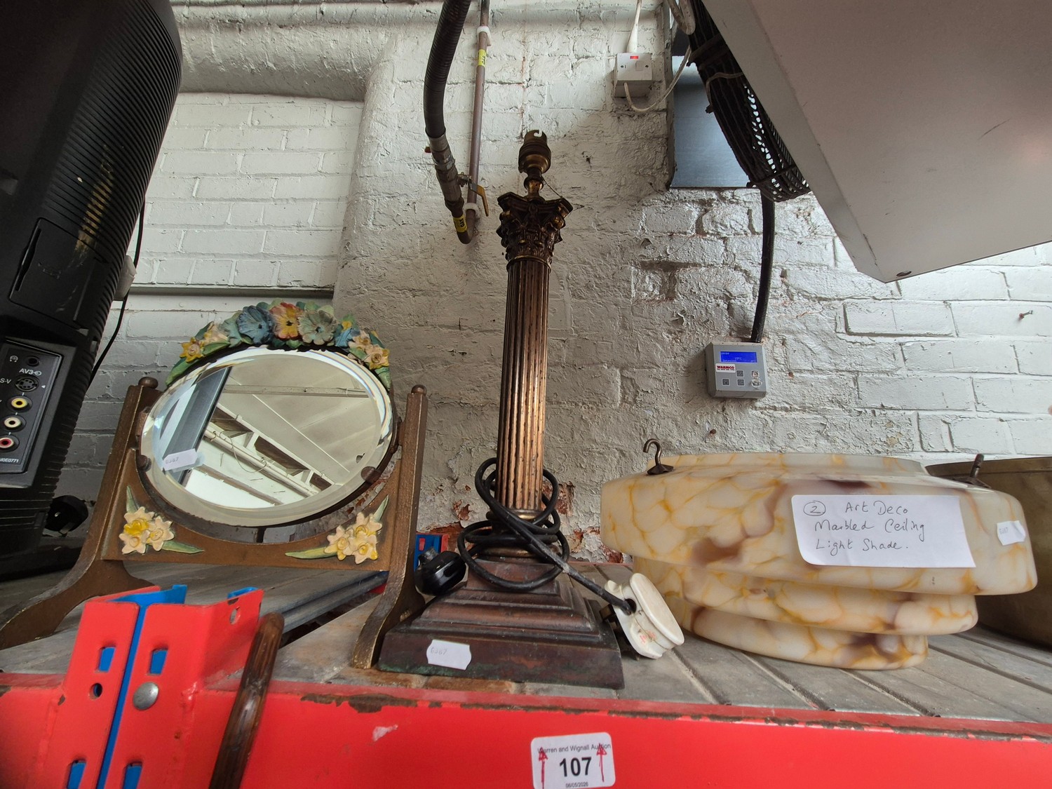 An art deco marbled ceiling light shade, a brass column table lamp, and a Barbola mirror