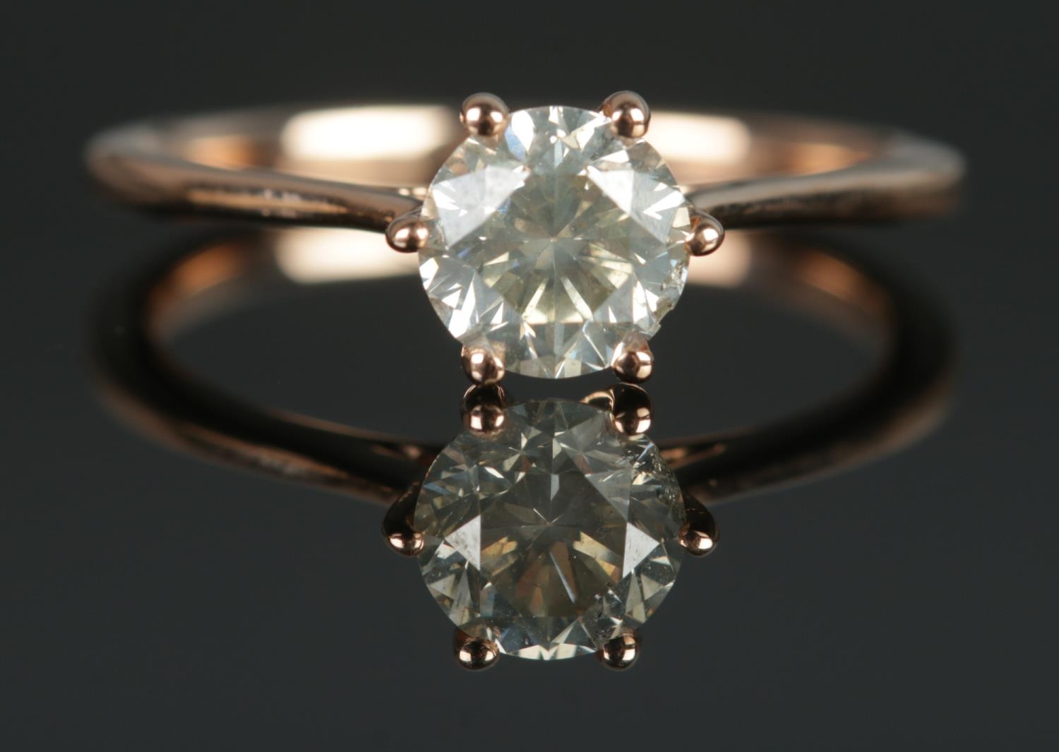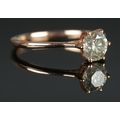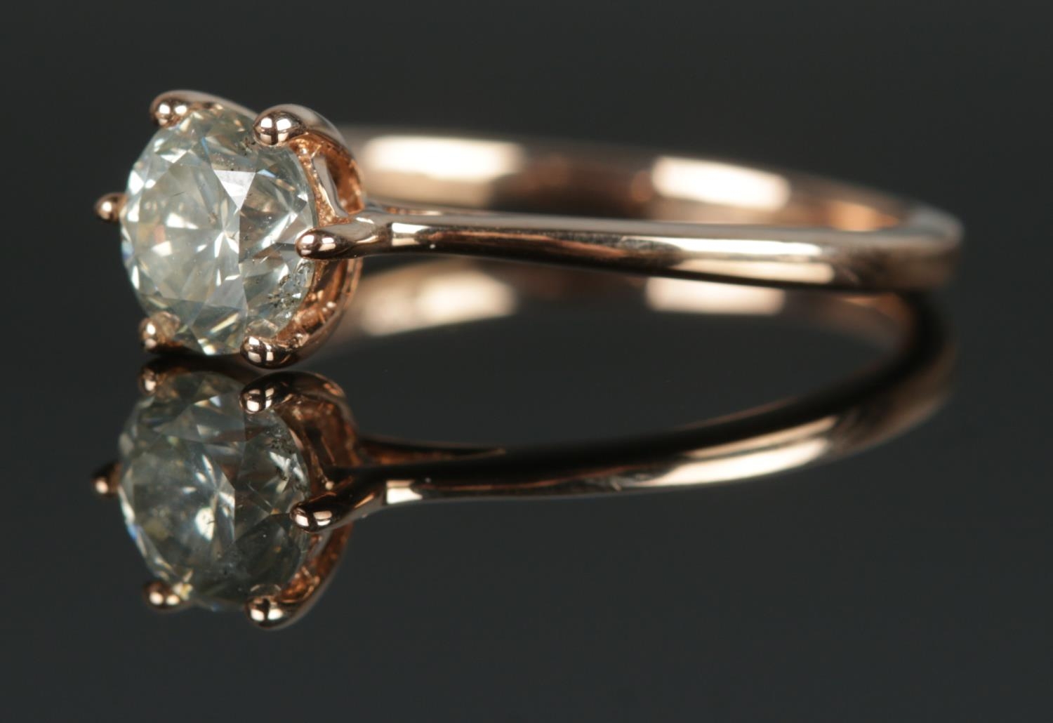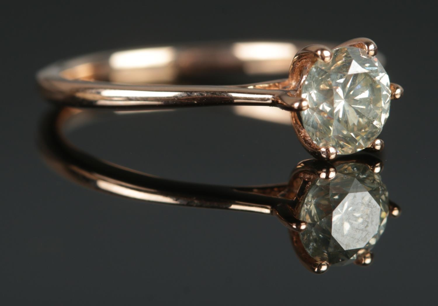 An 18ct rose gold diamond solitaire ring in claw setting. Diamond 0.92ct. Size M. 2.37g.