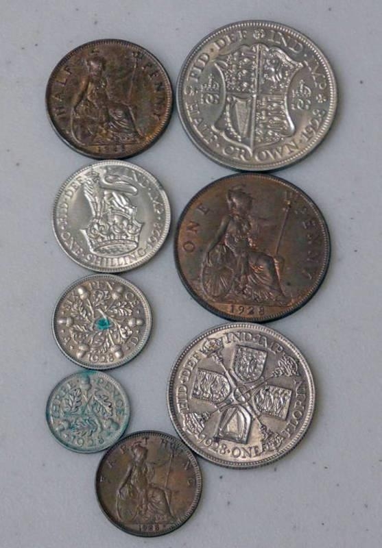 EIGHT 1928 GEORGE V COINS FARTHING TO HALF CROWNS