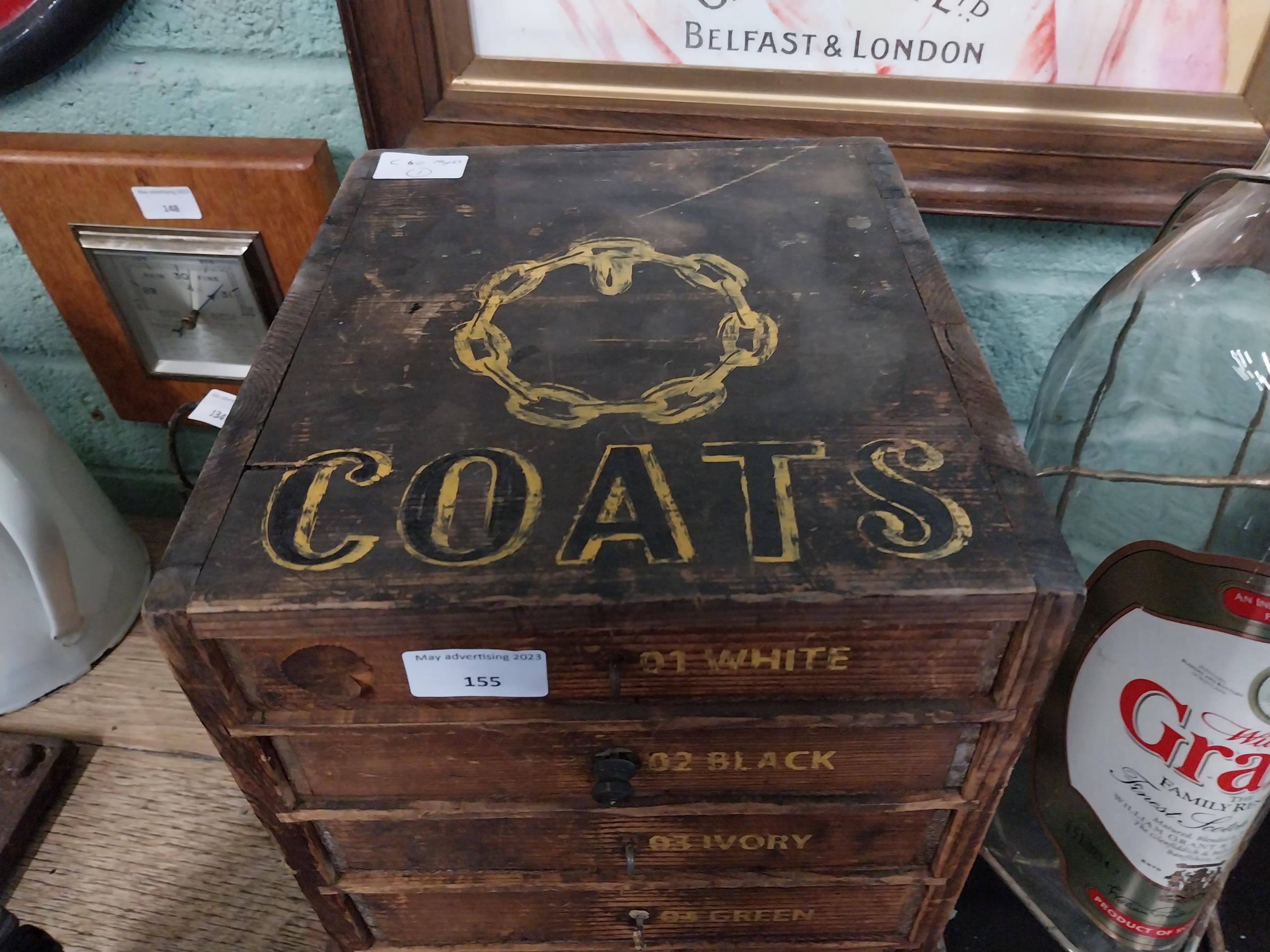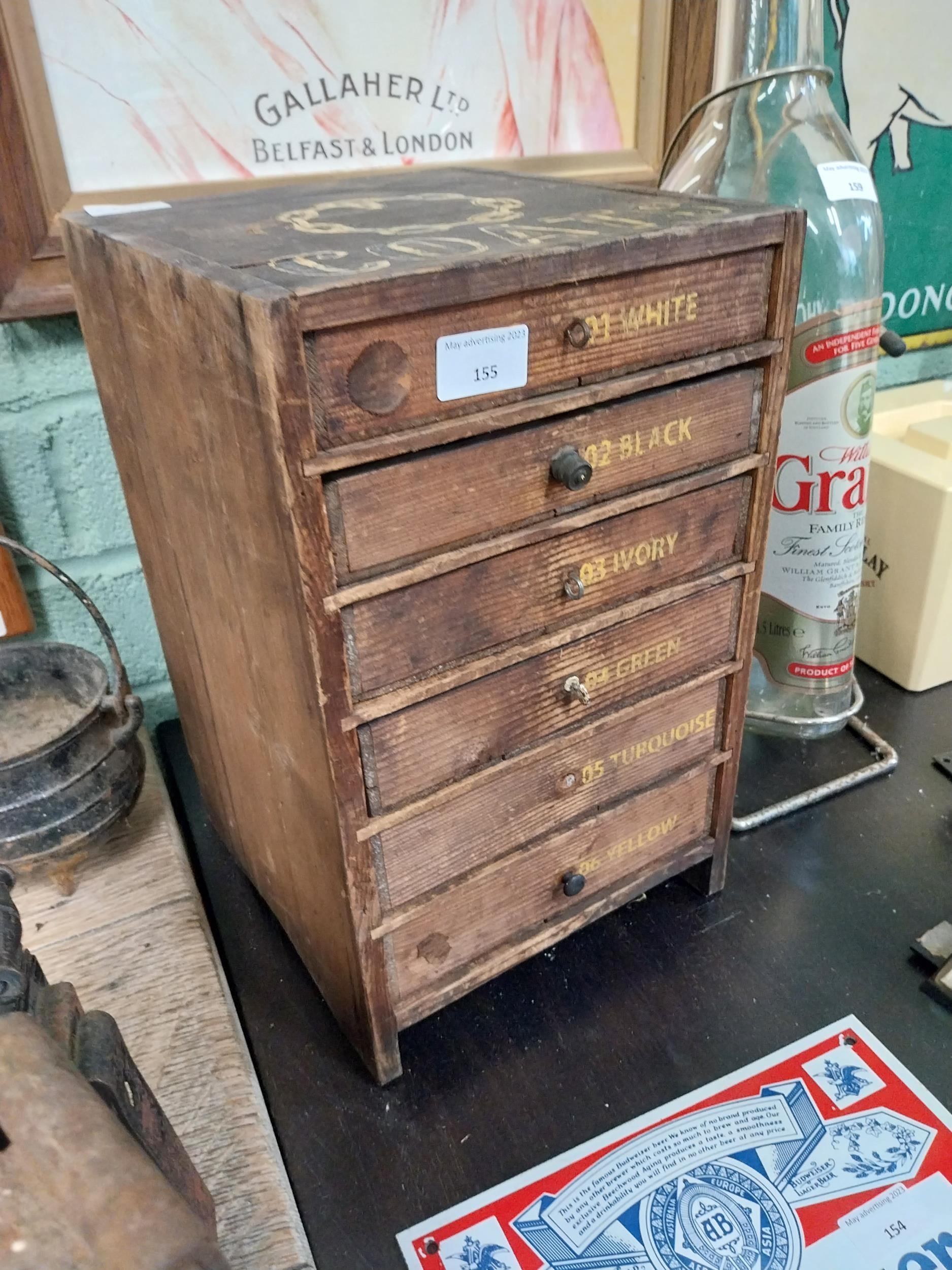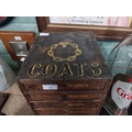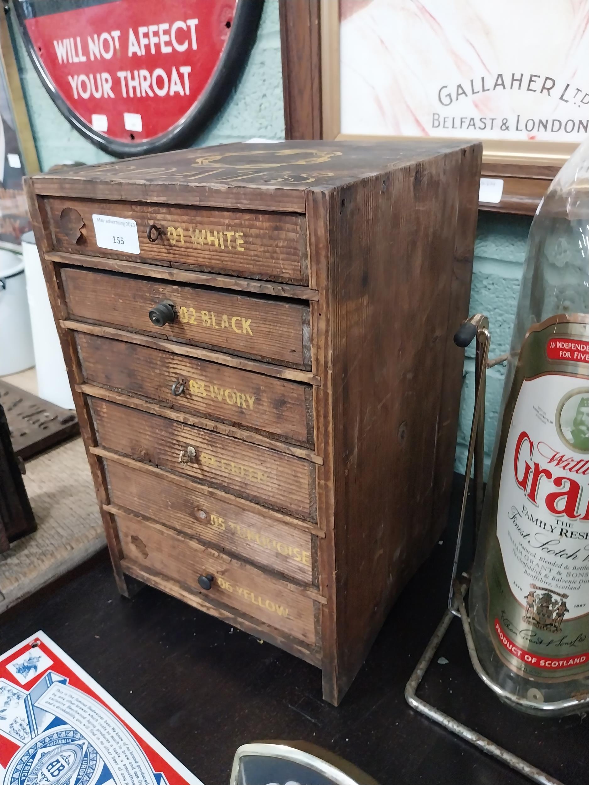 Coats pine counter display cabinet with six graduated drawers. {36 cm H x 24 cm W x 27 cm D}