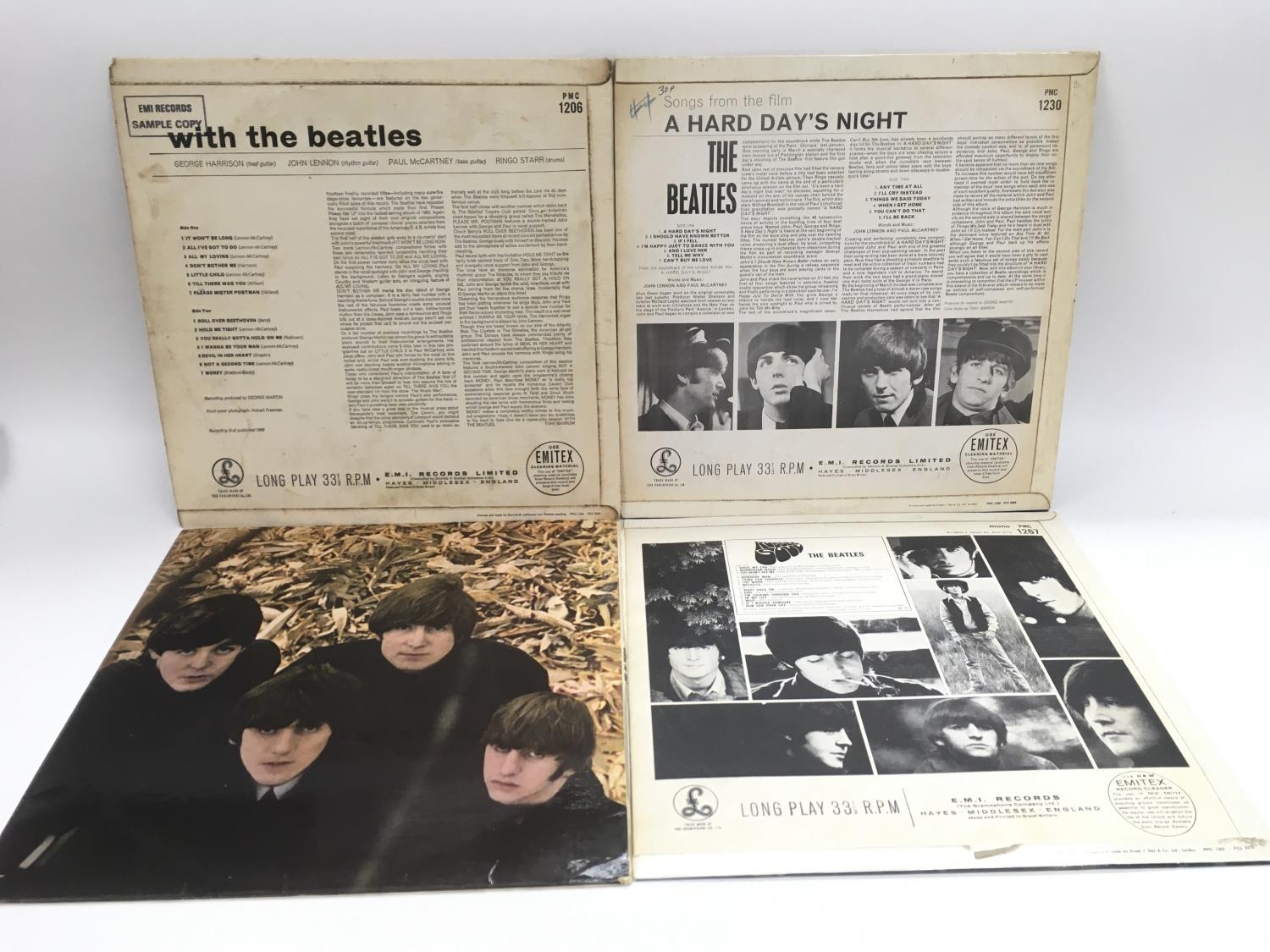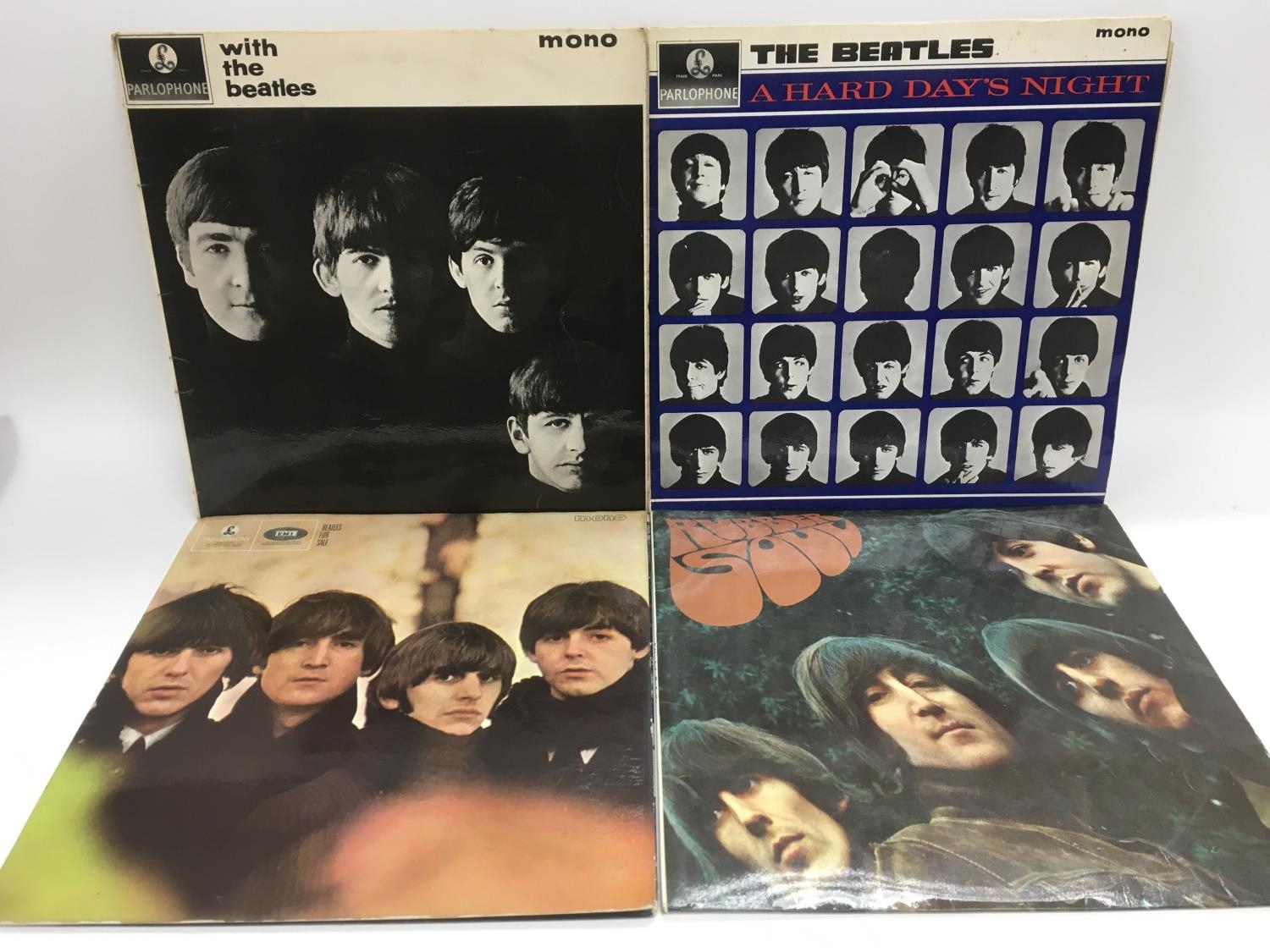 Four early UK issue Beatles LPs comprising 'With The Beatles', 'A Hard Day's Night', 'Beatles For Sale' and 'Rubber Soul'. Back cover of 'With The Beatles' is stamped 'EMI Records sample copy'. Conditions vary from Good to VG+.