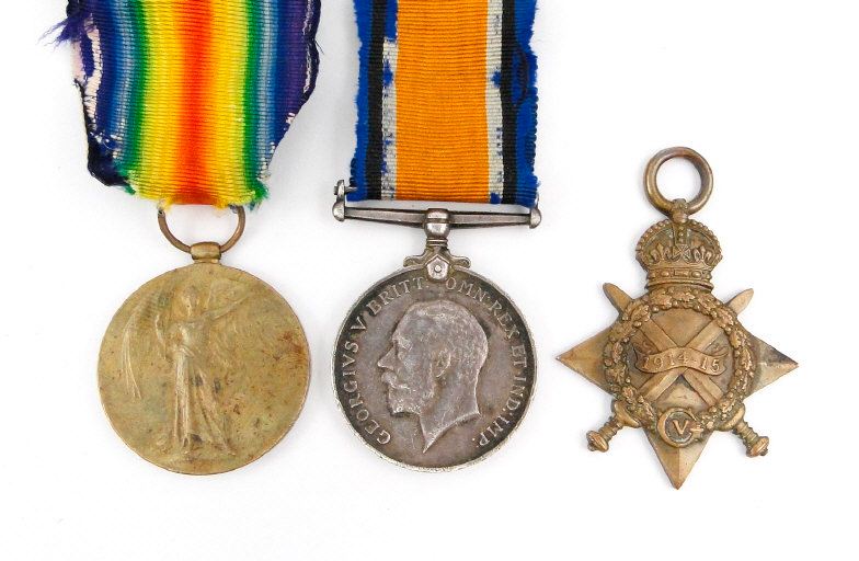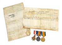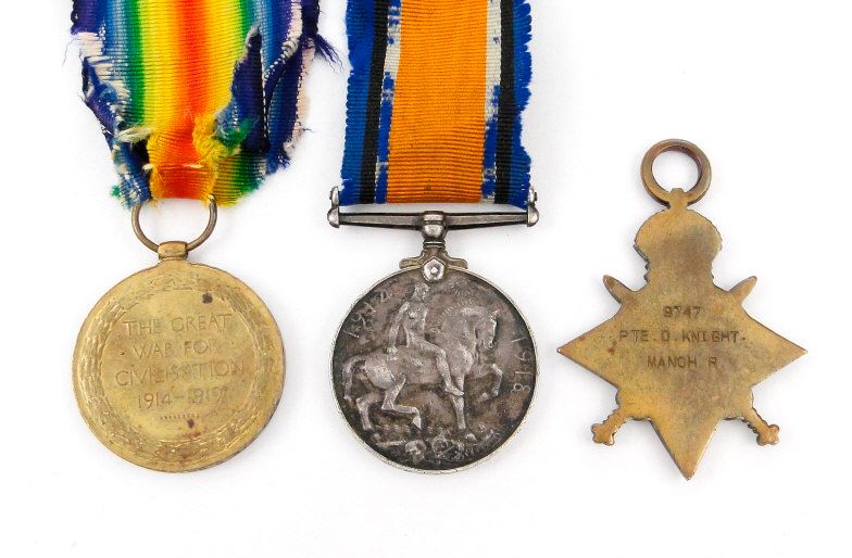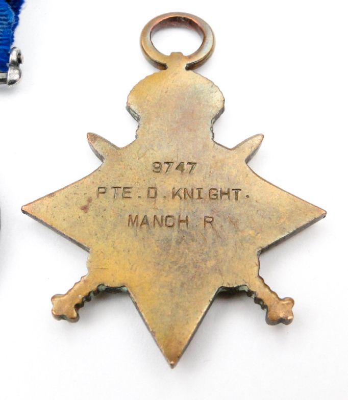 World War I British military medal group comprising 1914-18 War medal, Victory medal and 1914-15 Star, together with photocopied ancestry medals, the medals marked 9747 PTE.D.KNIGHT.MANCH.R. to the rims