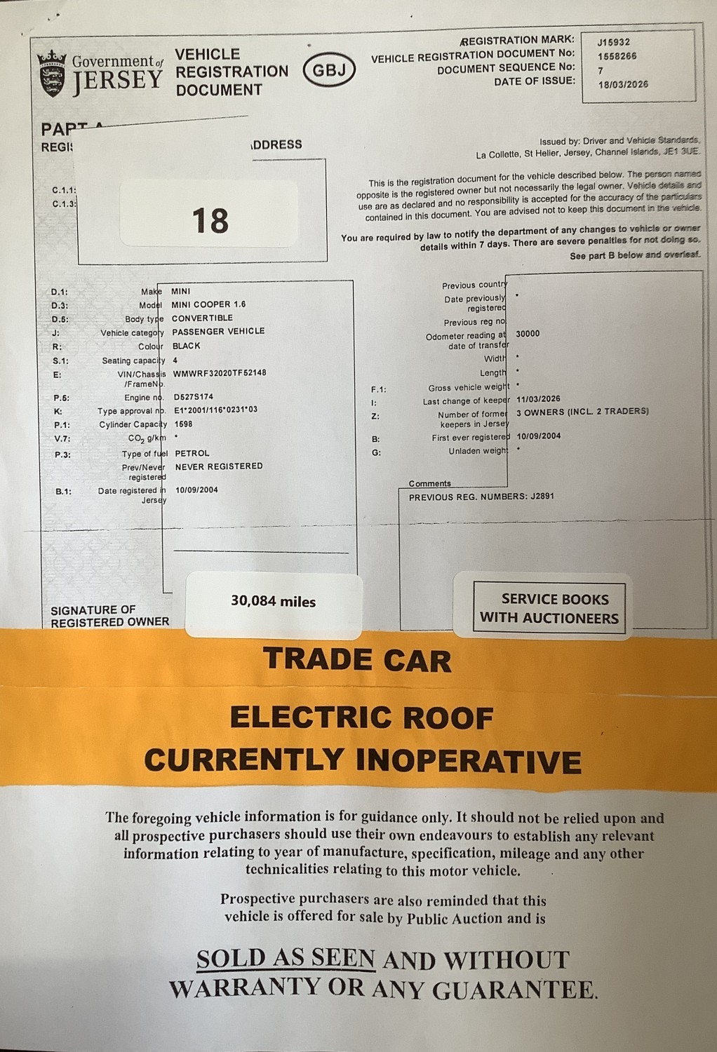 A 2004 Mini Cooper 1.6 convertible J15932 (petrol/manual), odometer reading 30,084 miles - Trade car
