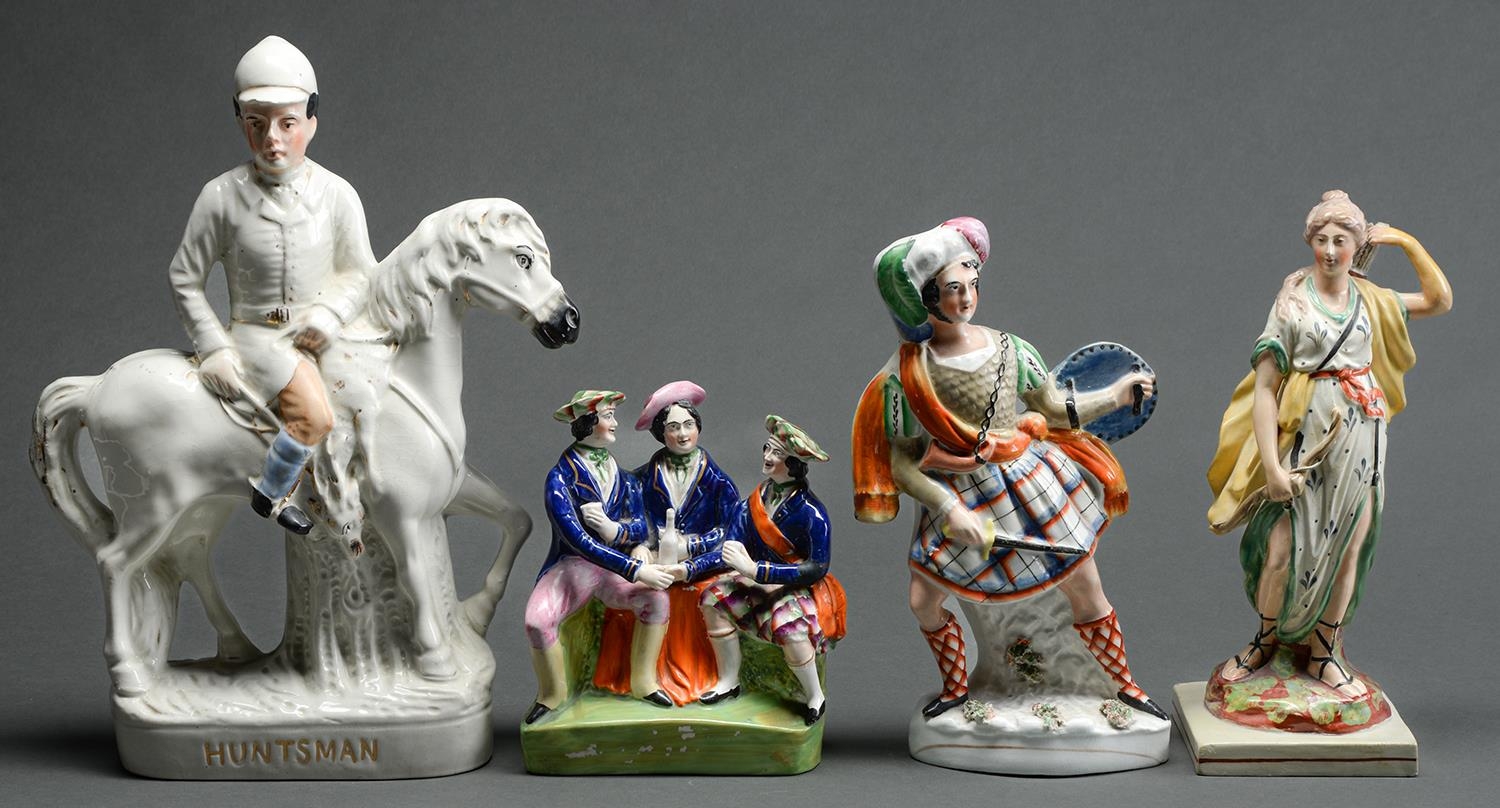 A Staffordshire earthenware figure of Diana, c1820, with overglaze enamel painted decoration on square base with rust enamel lines, 30cm h and three Staffordshire flatbacks, 19th c (4)