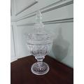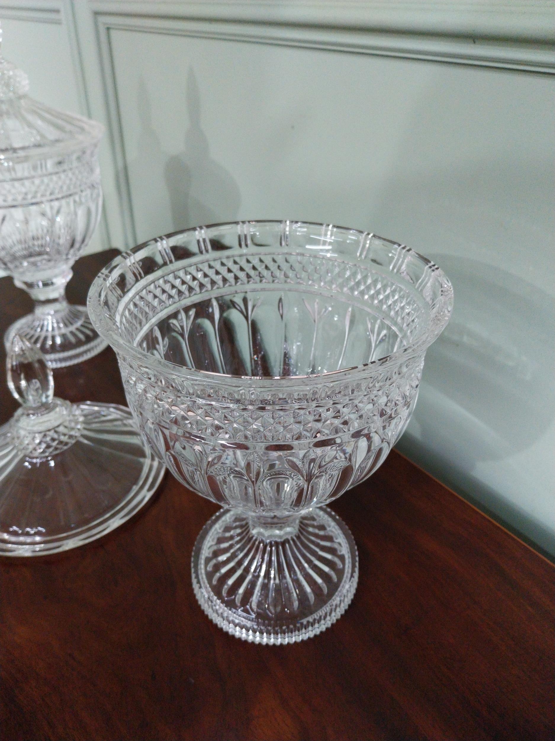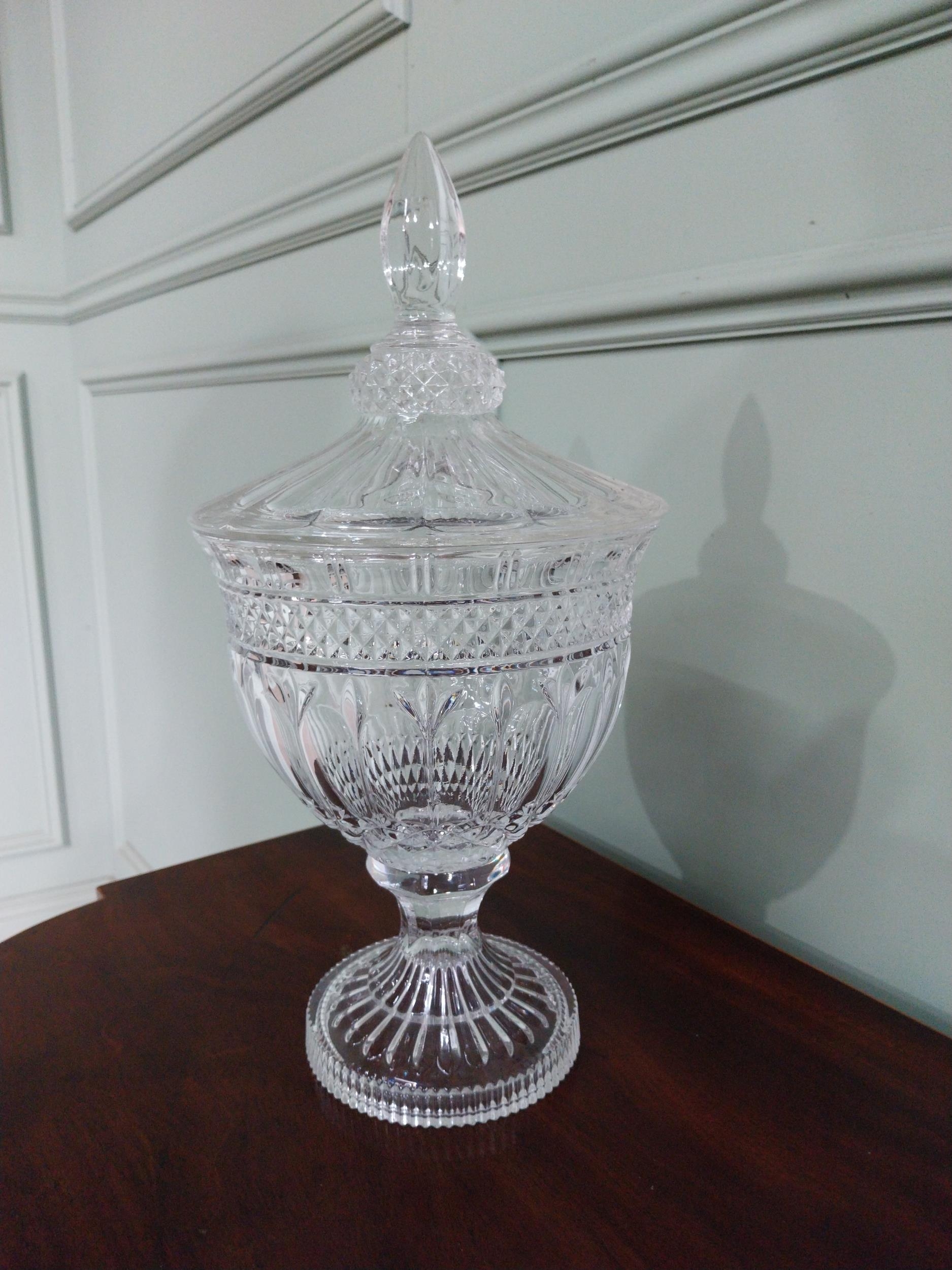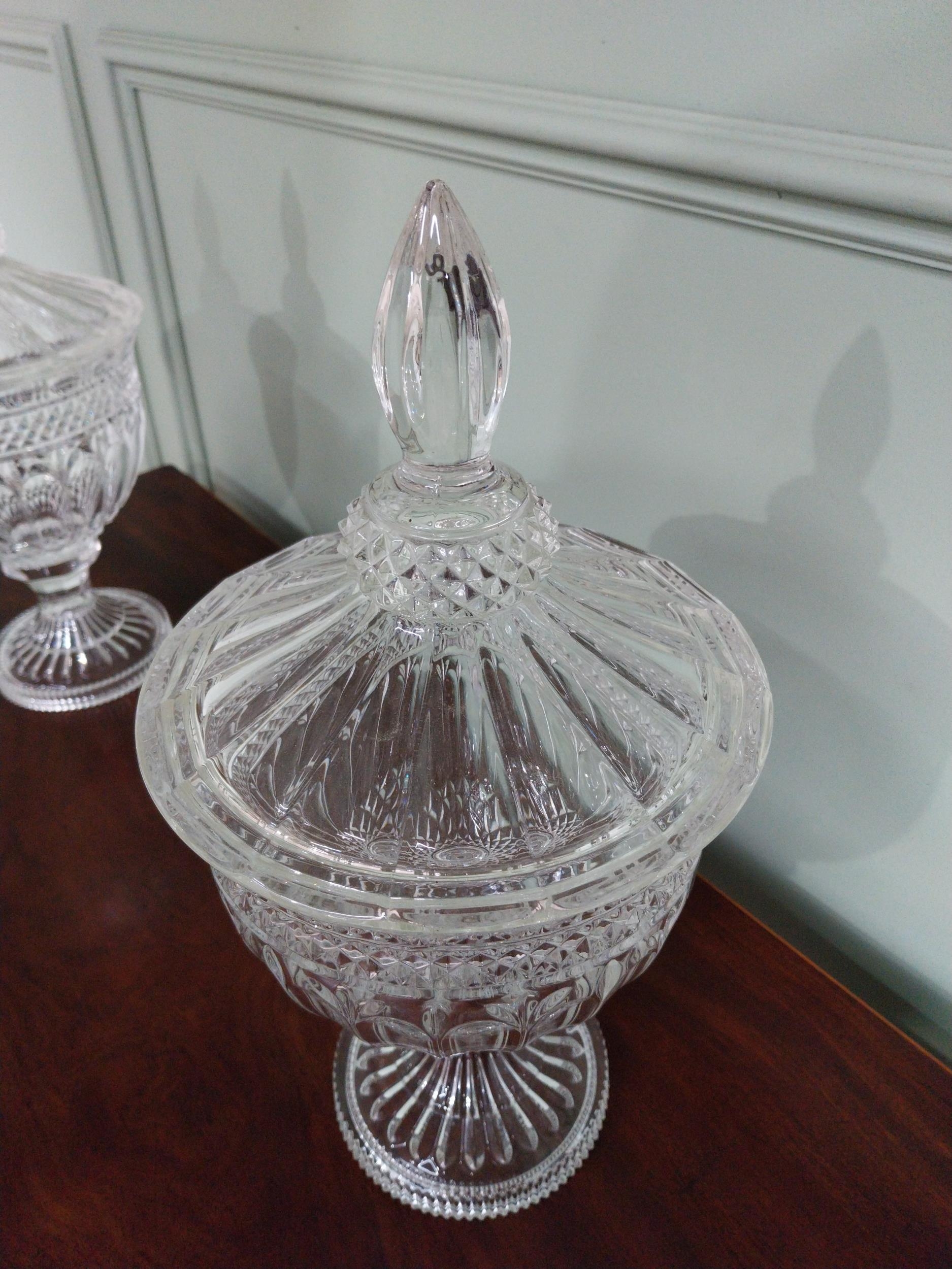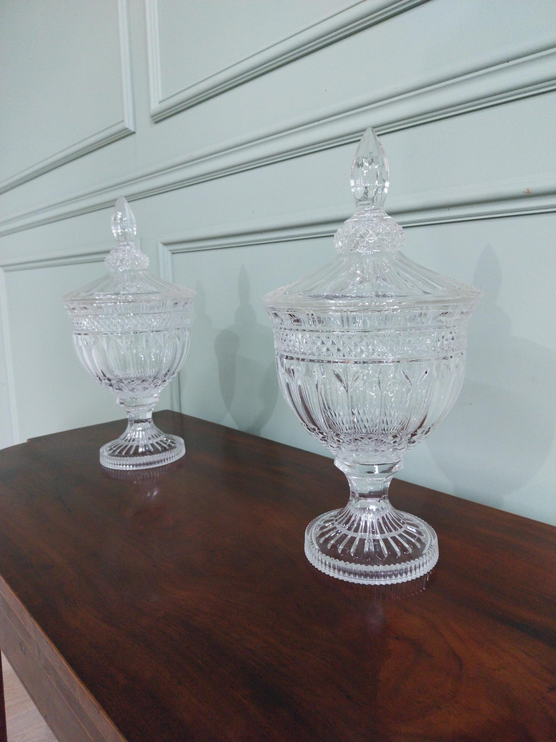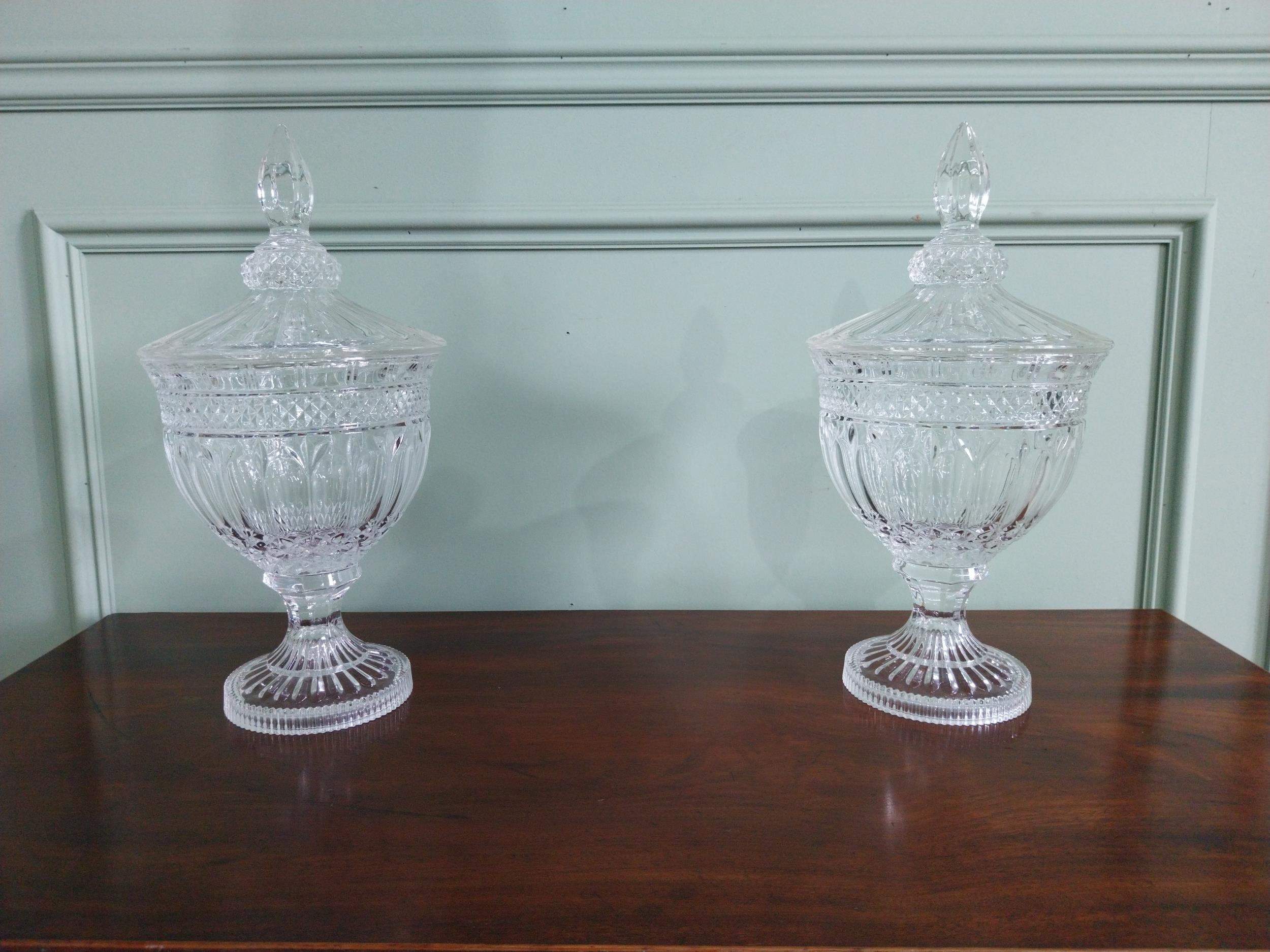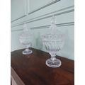 Pair of good quality crystal lidded urns {37 cm H x 19 cm Dia.}.