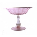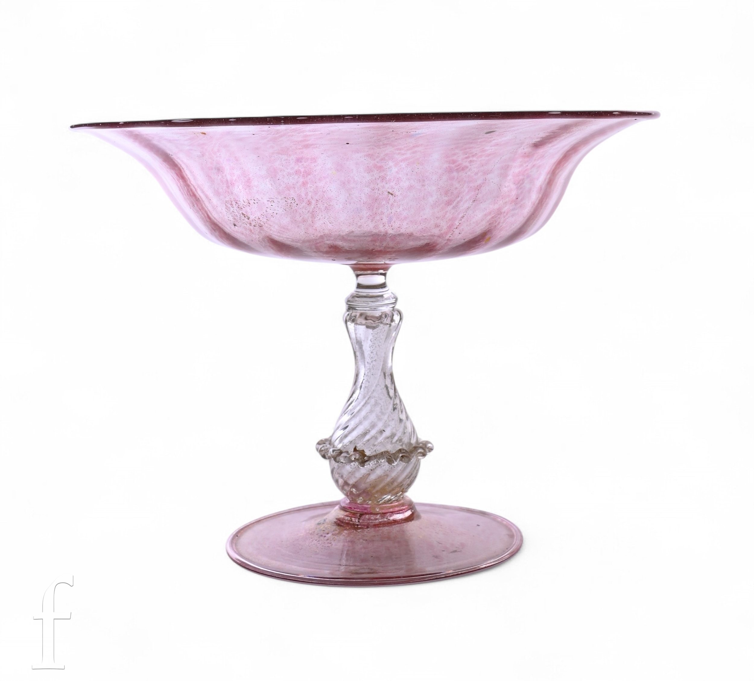 An early 20th Century Italian Murano glass pedestal bowl in the manner of Salviati, the upper shallow circular bowl with fluted body and folded rim decorated with gold over the pale pink ground, raised to a matched wrythen fluted hollow blown baluster form stem above a circular spread foot, height 17cm.