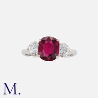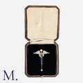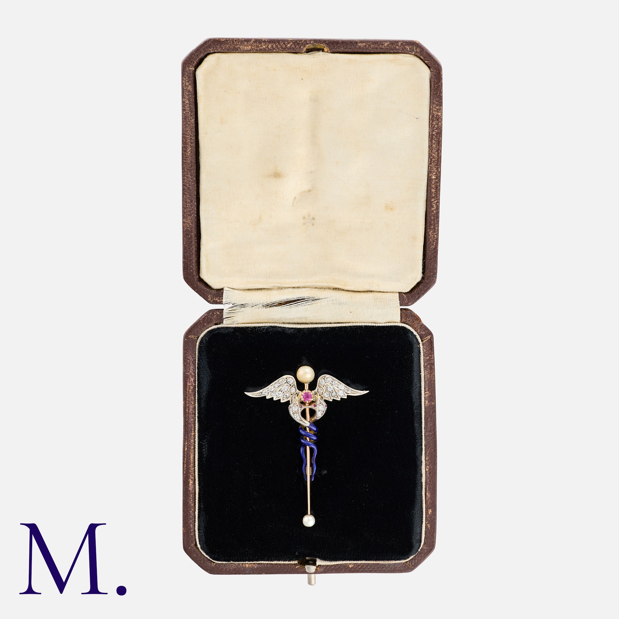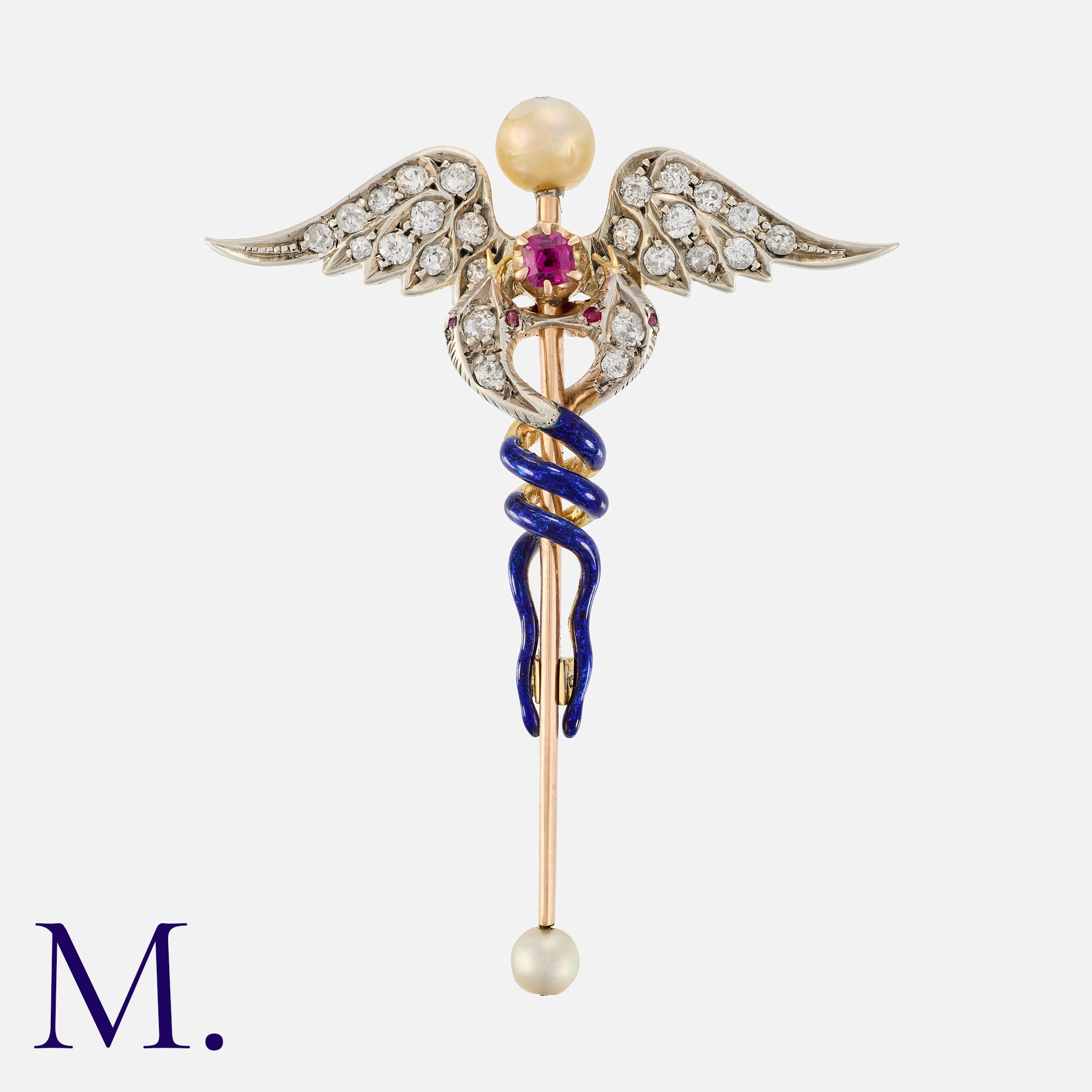 A Victorian Enamel, Pearl, Ruby And Diamond Caduceus Brooch comprising two entwined snakes with blue enamel decoration, the wings encrusted with rose-cut diamonds around a cushion cut ruby, the staff terminating with a pearl. Unmarked, tests indicate 9 carat gold. Accompanied by fitted case.