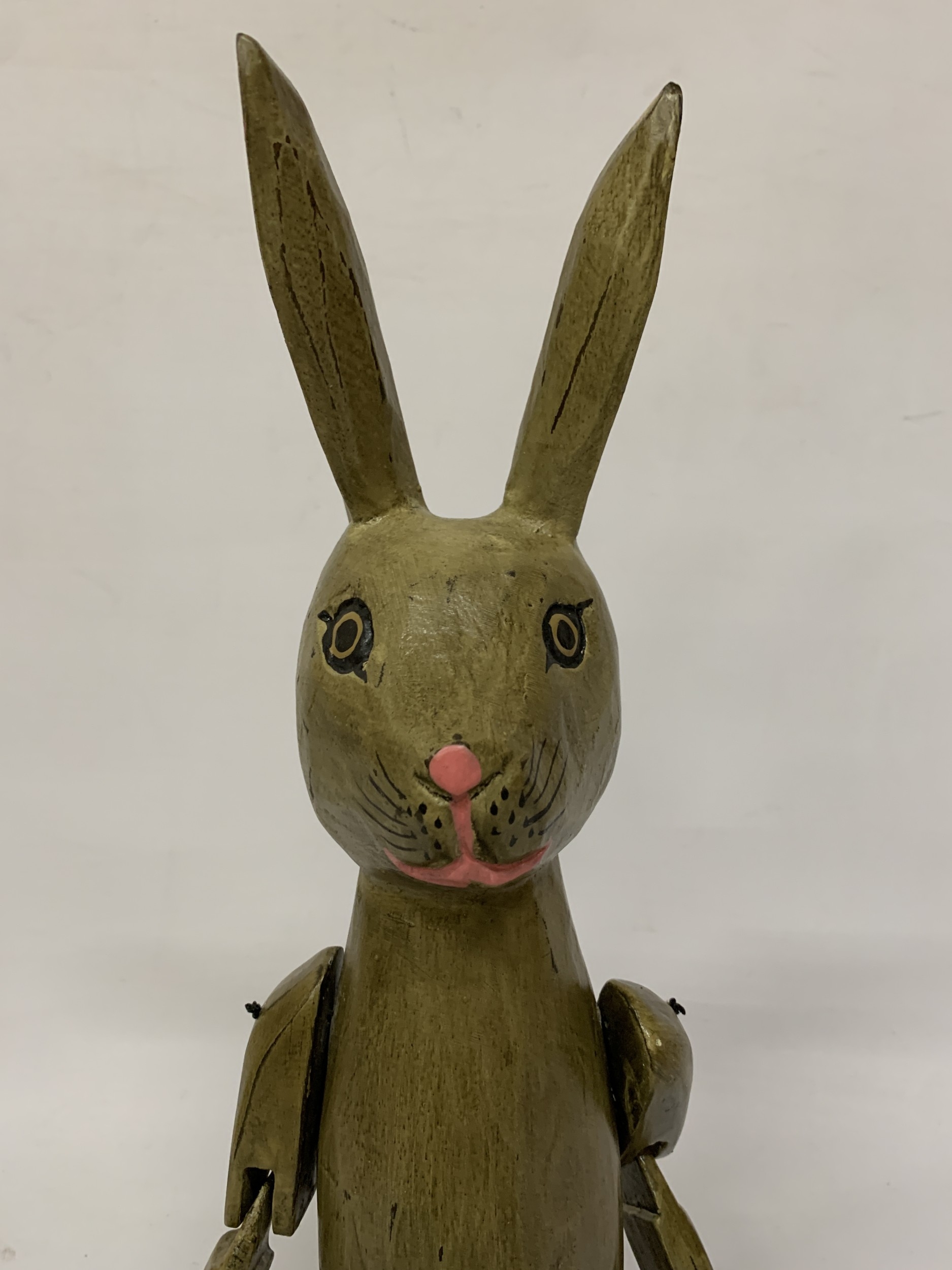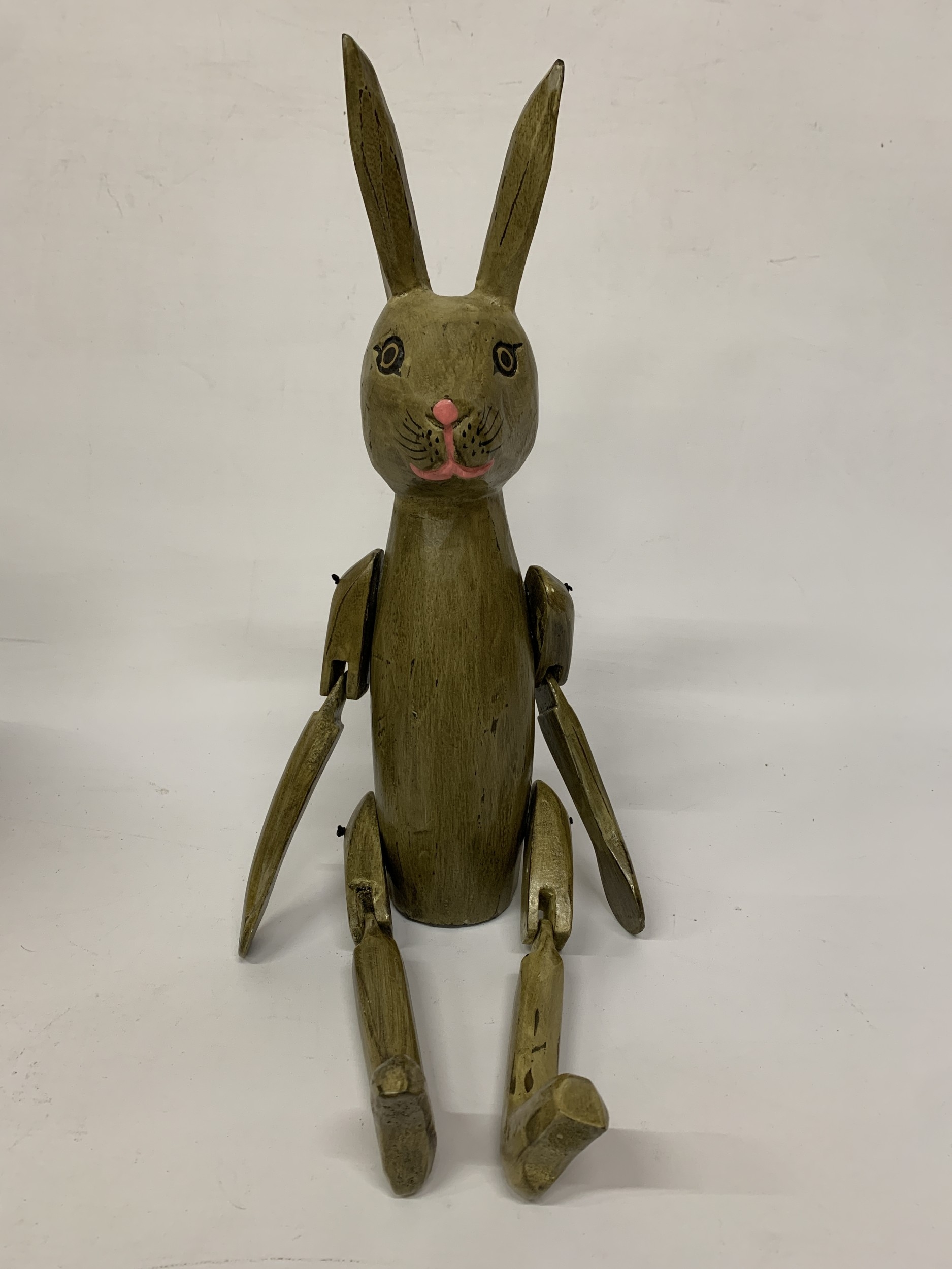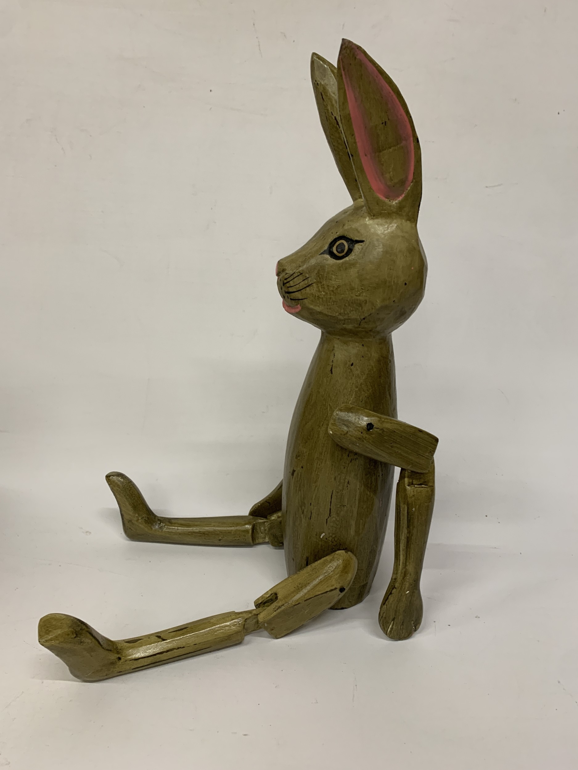 A LARGE WOODEN ARTICULATED SHELF RABBIT, HEIGHT 58CM