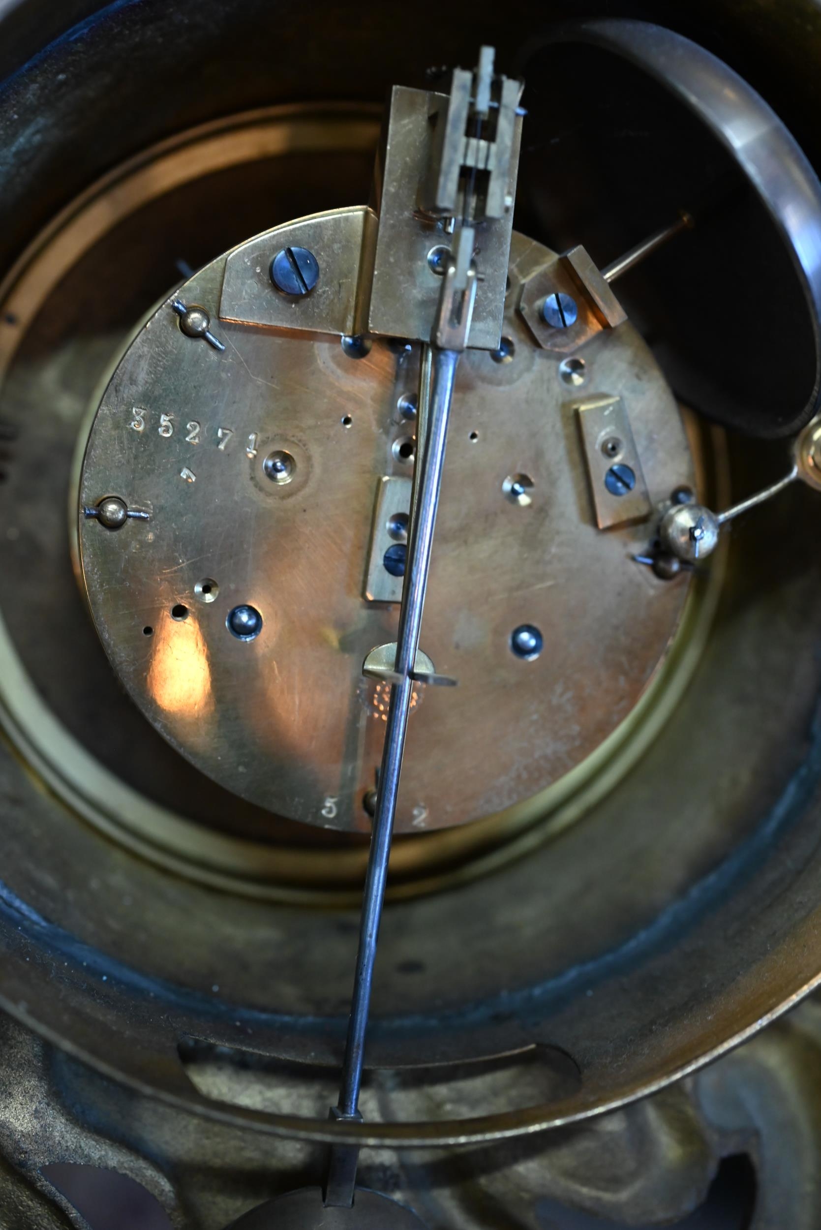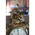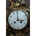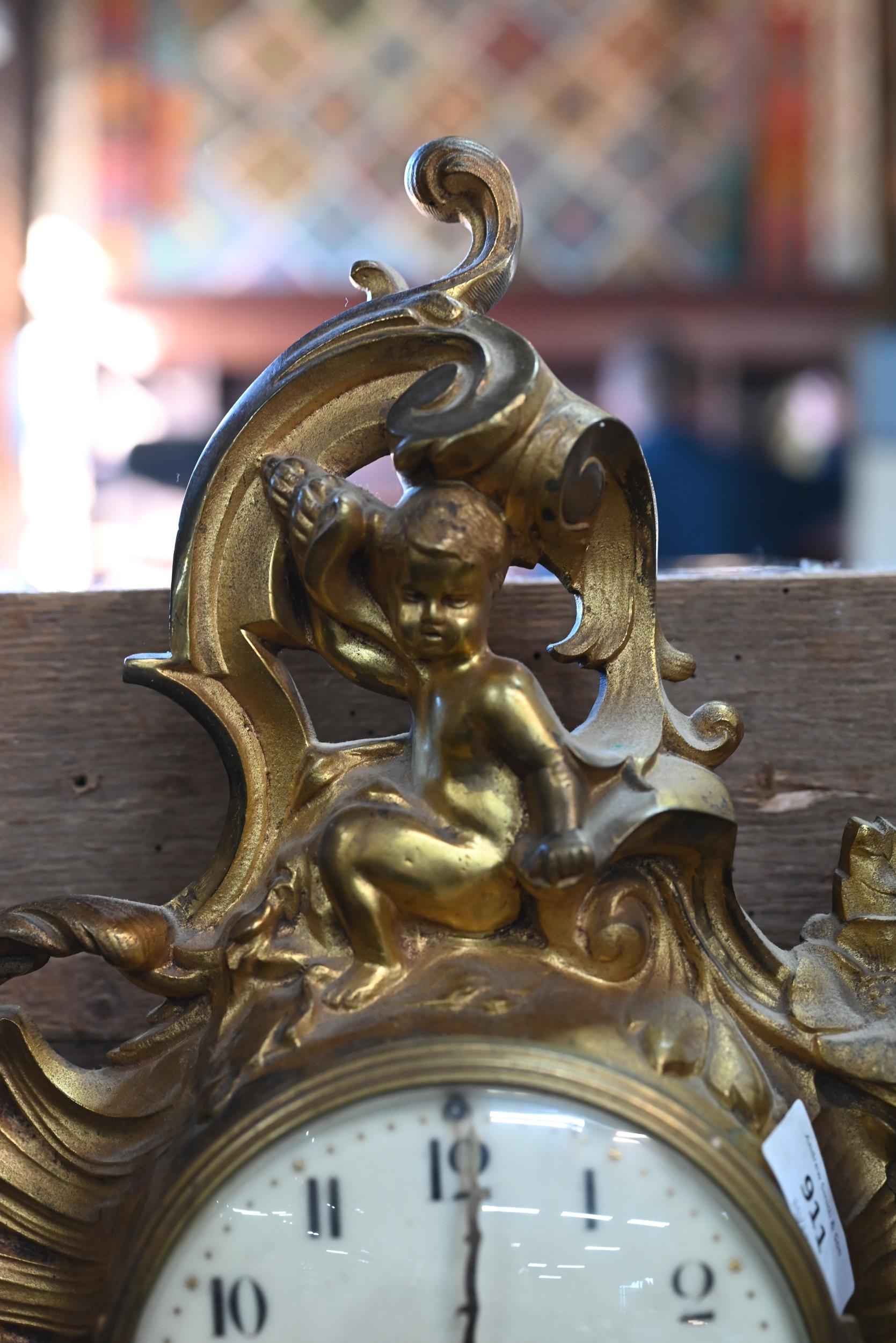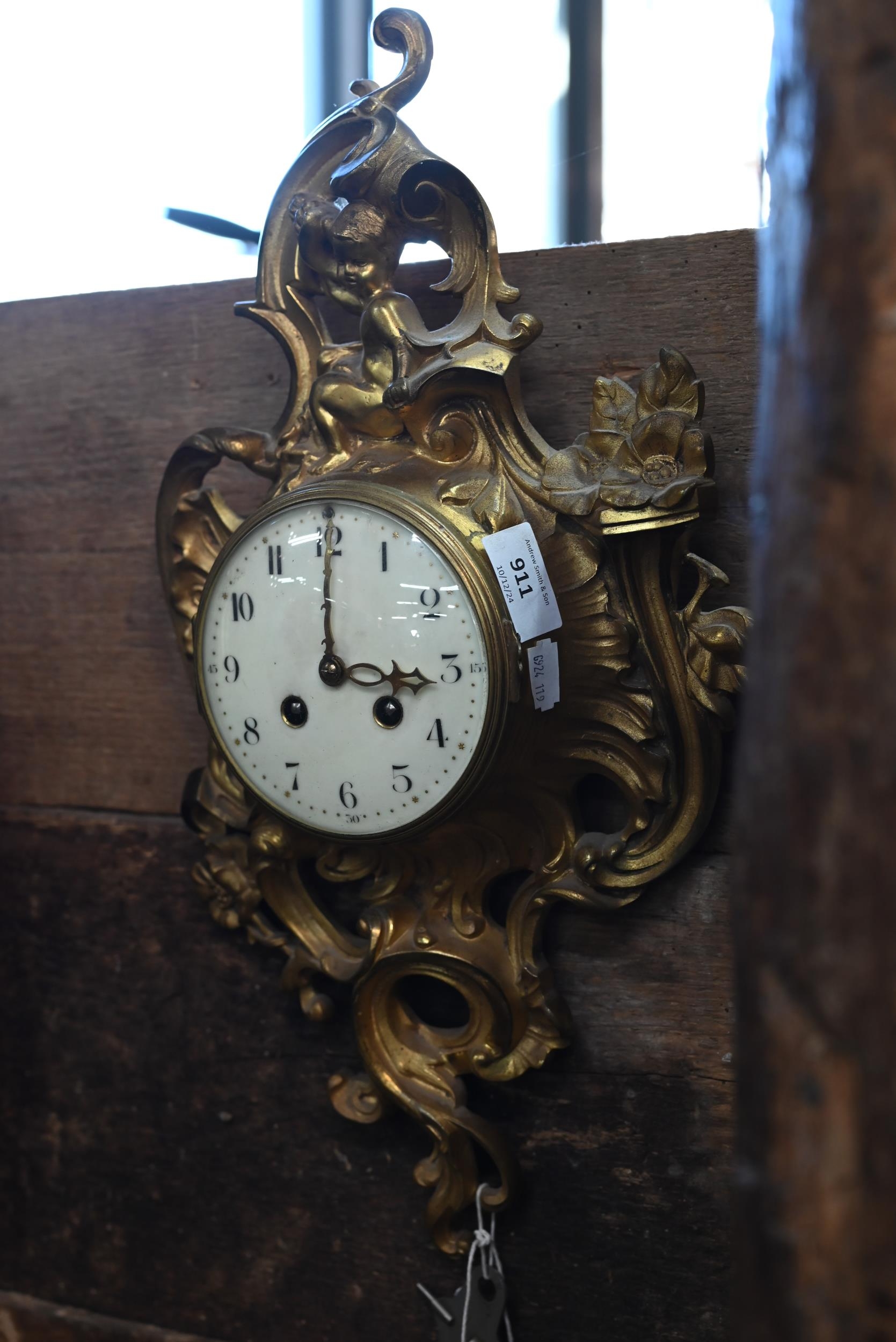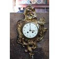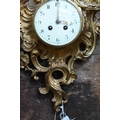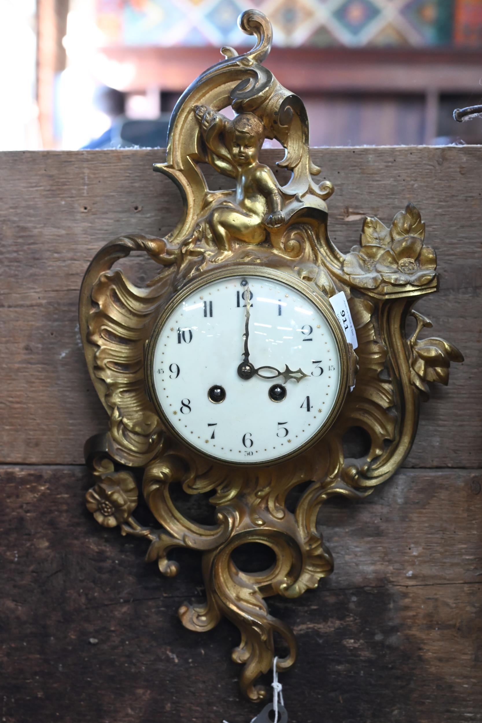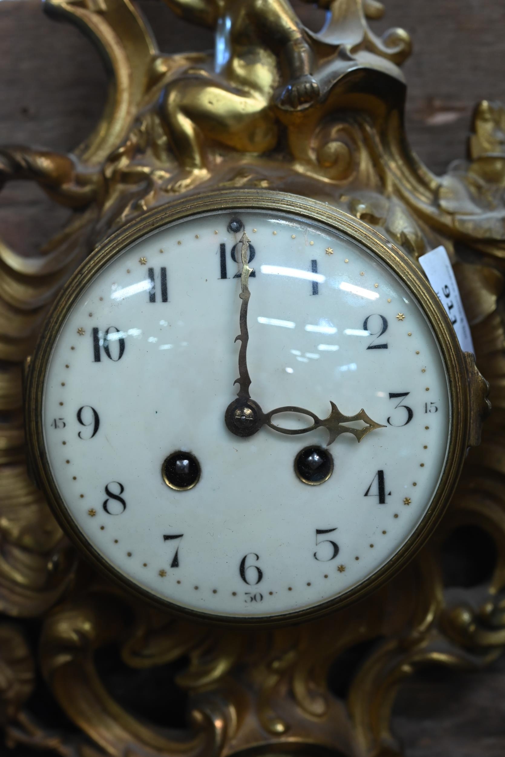 An antique French gilt metal 8-day cartel clock, the 8-day two train movement by Japy Freres, striking the half and hours on a bell, with drop pendulum, the white enamelled dial with Arabic numerals, 12 cm dia. x 50 cm h