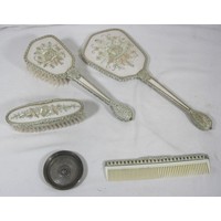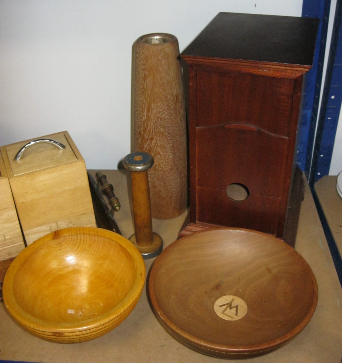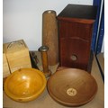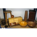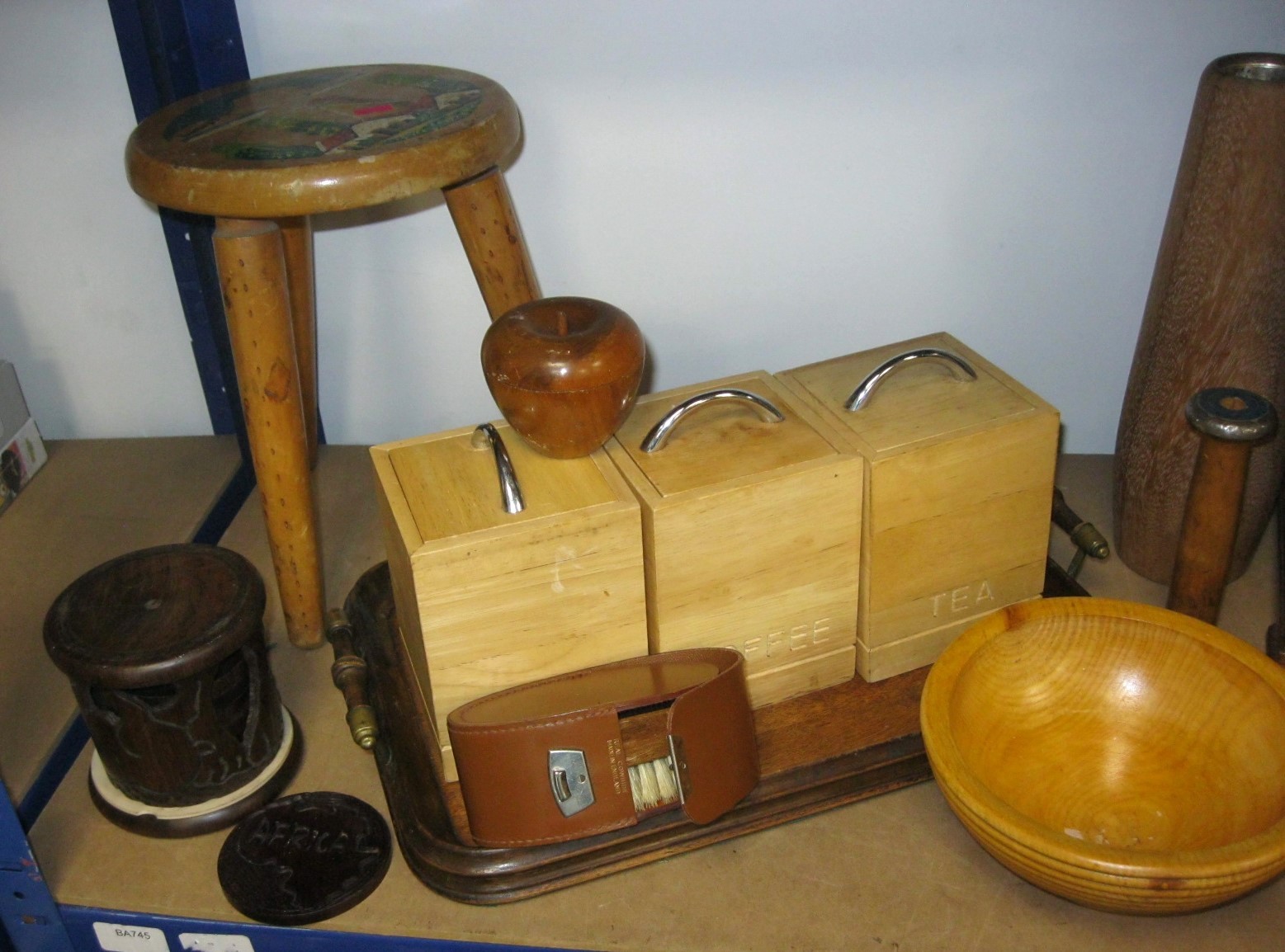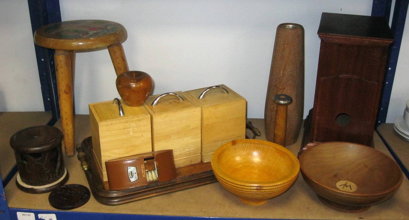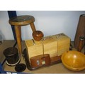 A box of wooden household items, bowls, kitchen caddies, small three-legged stool, coaster set, brush and comb in leather case, etc