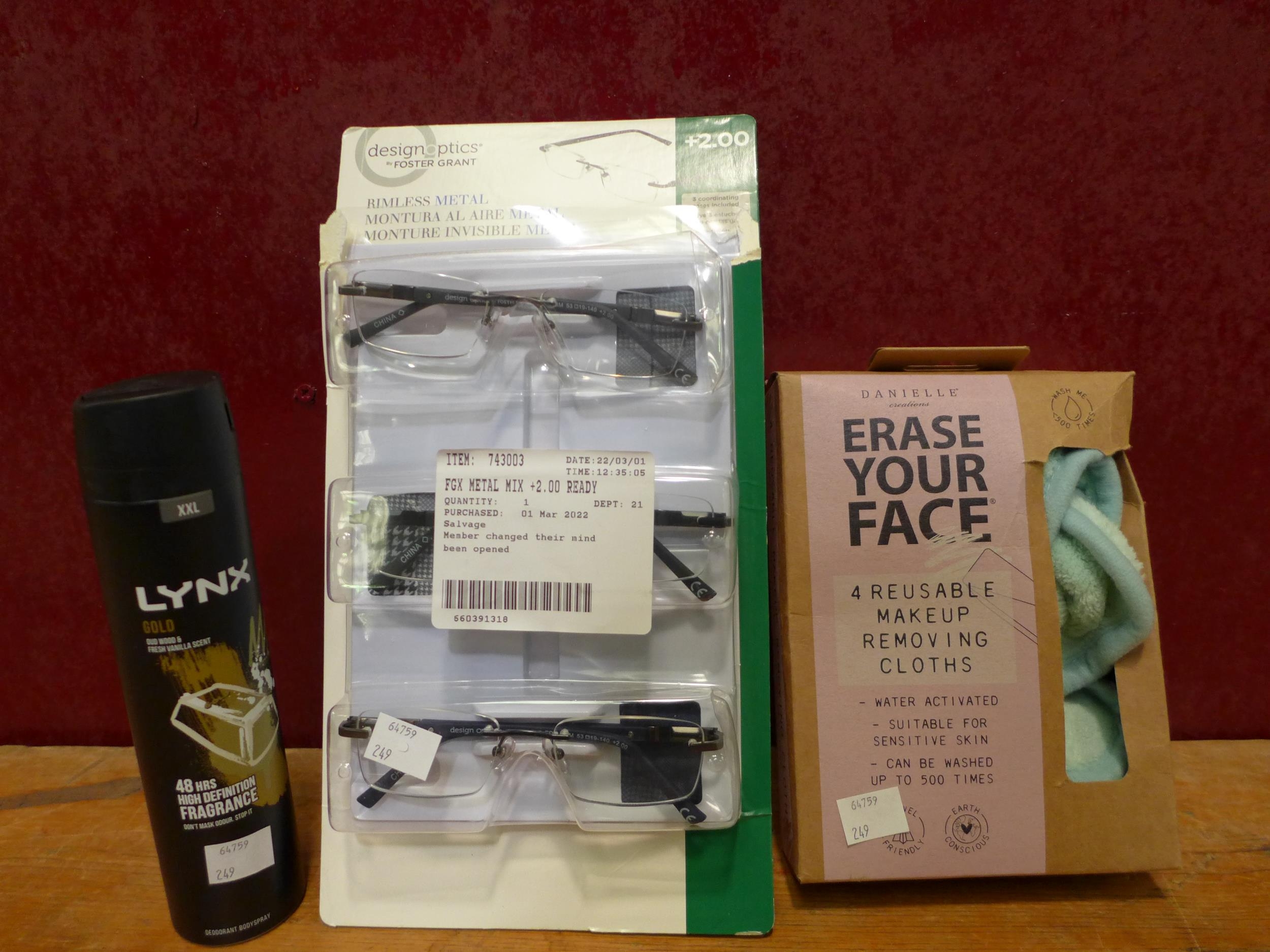 Erase Your Face Makeup Remover and Fgx Metal Mix +2.00 Ready Glasses And Lynx Gold can, (249-435,452) * This lot is subject to vat