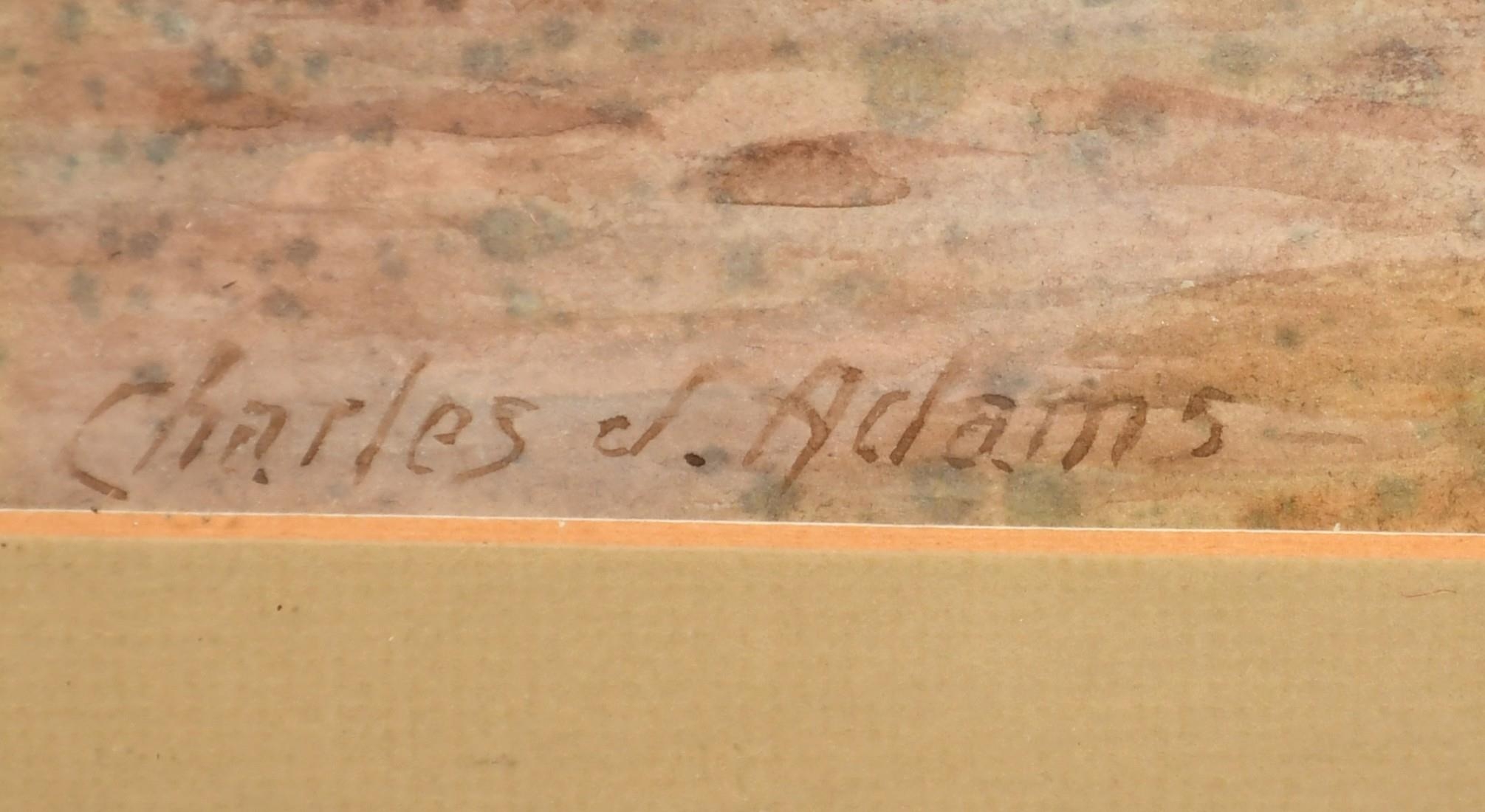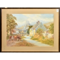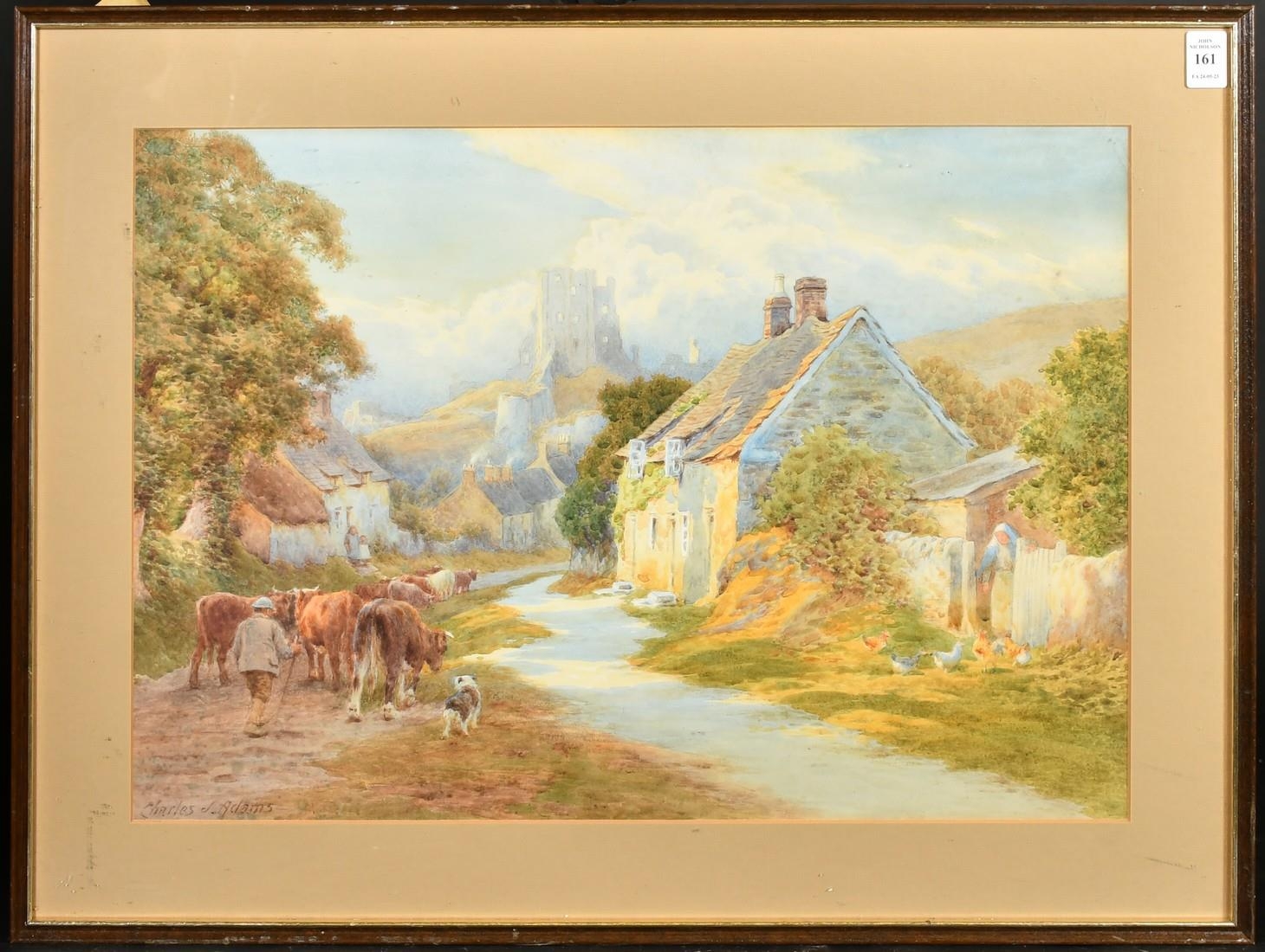 Charles James Adams (1859-1931) British, Moving the herd through the village, a ruined castle on a hill beyond, watercolour, signed, 14.75" x 21.5", (37.5x54.5cm).