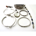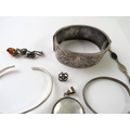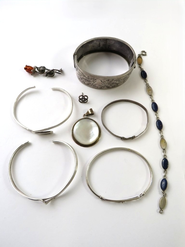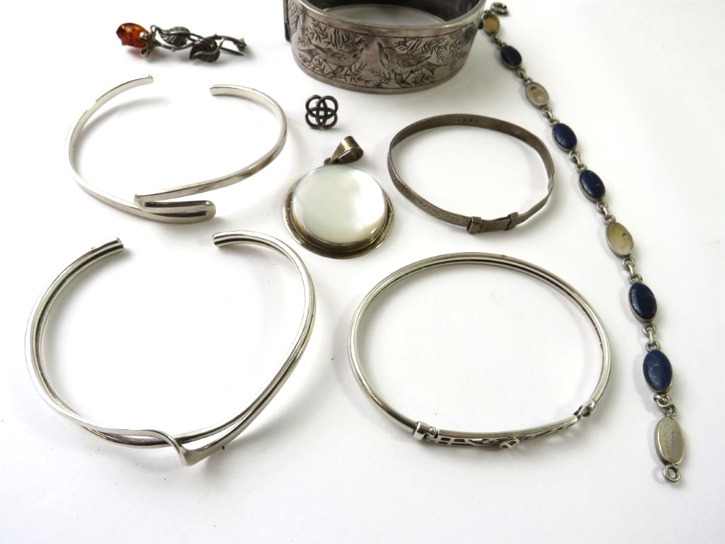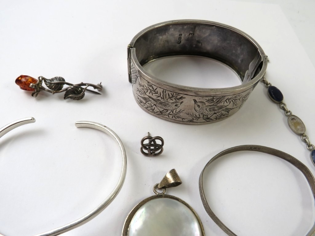 A Victorian silver bangle engraved with a birds in the Chinoiserie manner; and a small quantity of other white metal items, mostly stamped 925, 77.5gms gross approx