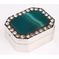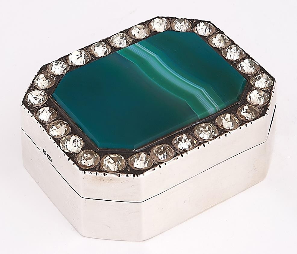 A Continental silver, jewelled and hardstone table snuff box, in late 18th c style, of cut cornered form, the lid inset with green stained agate in brilliant paste surround, 80mm l, import marked The Goldsmiths and Silversmiths Co, London 1904, 6ozs