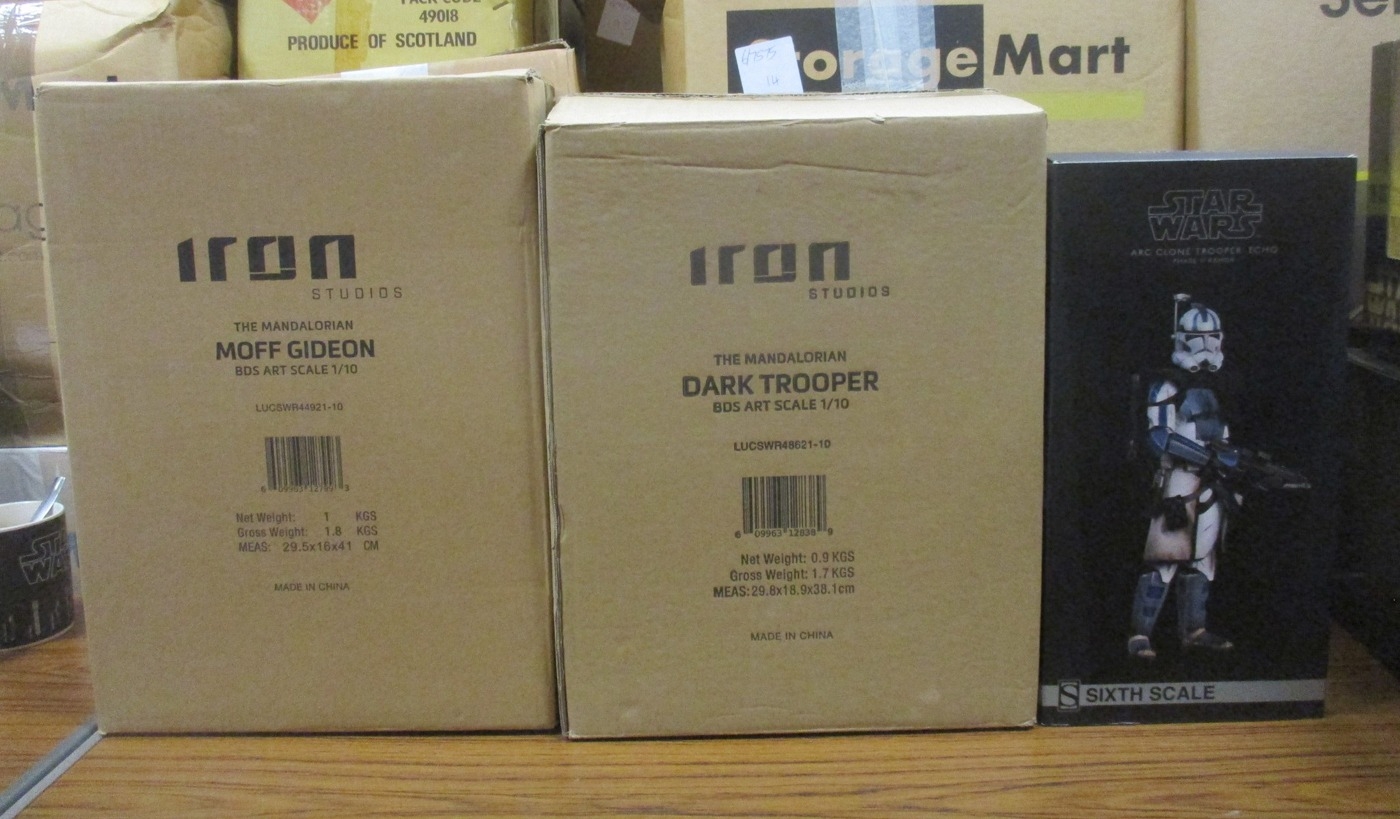 Star Wars. Range of large scale figures, generally mint in near mint boxes, with Iron Studios The Mandalorian Dark Trooper BDS Art Scale 1/10, The Mandalorian Moff Gideon BDS Art Scale 1/10 and Sixth Scale Arc Trooper Echo Phase II Armor. Qty 3 (B)
