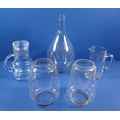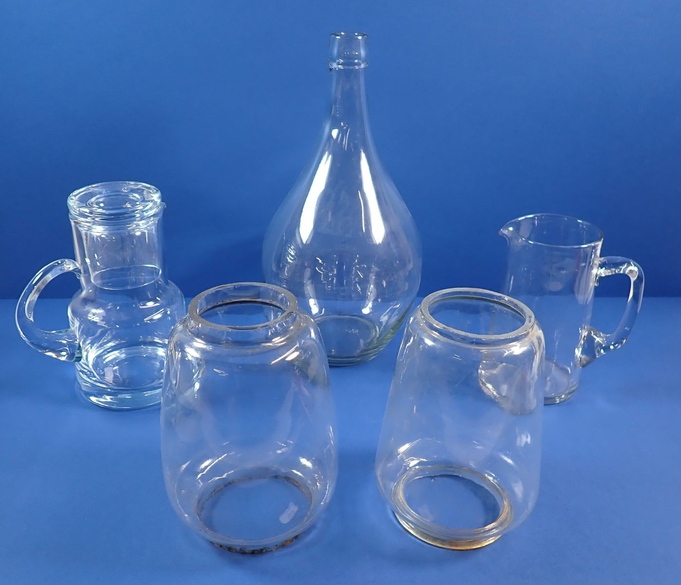 A group of vintage glassware including Krosno carafe, jug, a 'globular' shaped bottle and two light shades, 17cm tall etc.