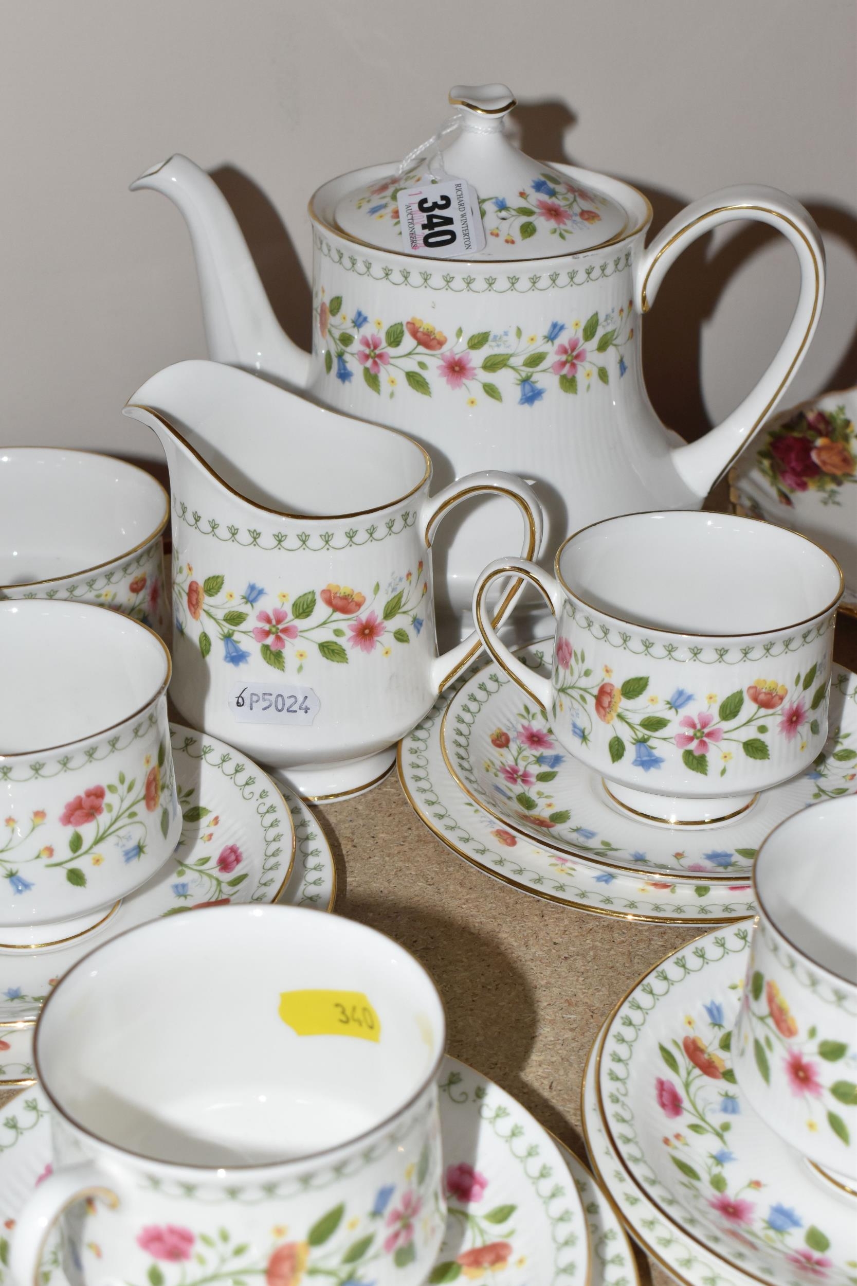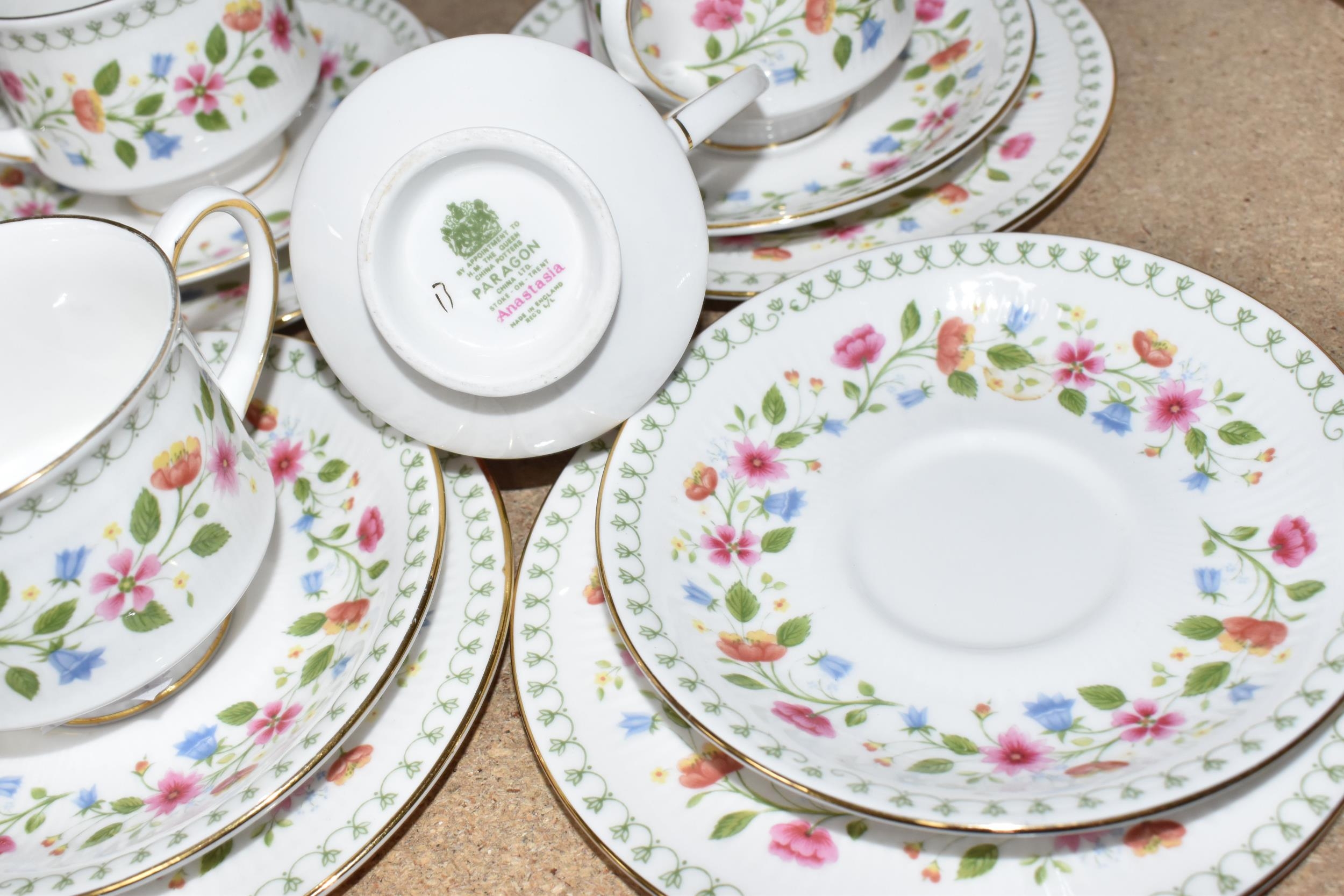 A PARAGON 'ANASTASIA' TEA SET comprising six teacups, six saucers, six side plates, a teapot, a milk jug, and a sugar bowl (21) (Condition Report: one teacup with a chip to the base)