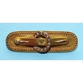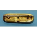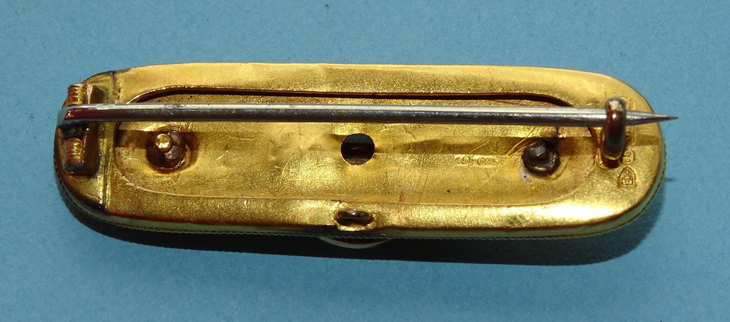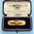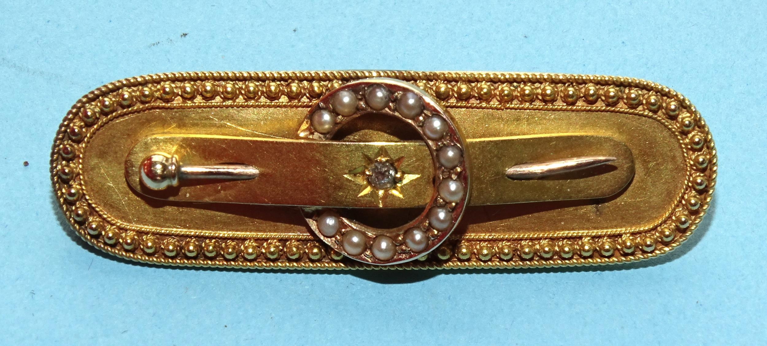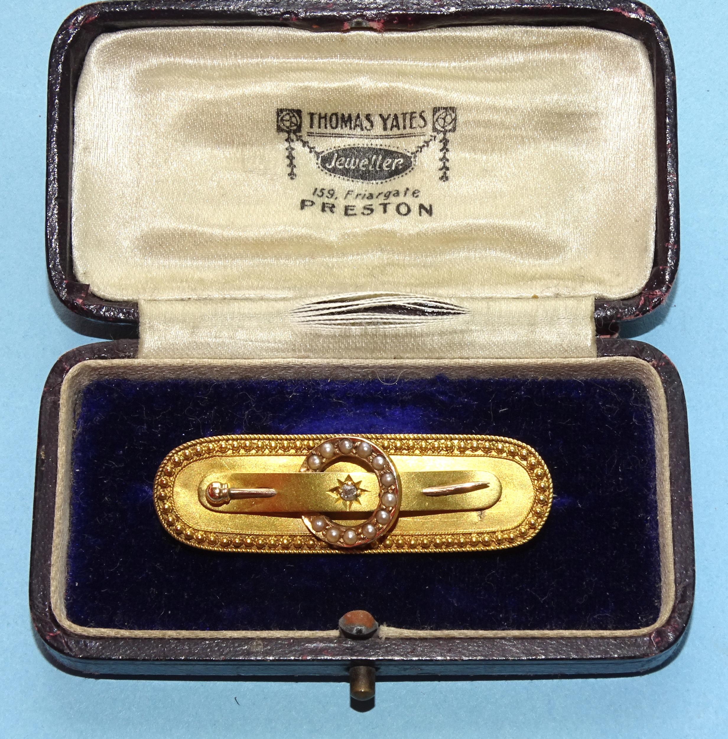 A Victorian 15ct gold circle and pin bar brooch set diamond point and seed pearls within cannetile-decorated rim, 45mm, 5.4g, (boxed).