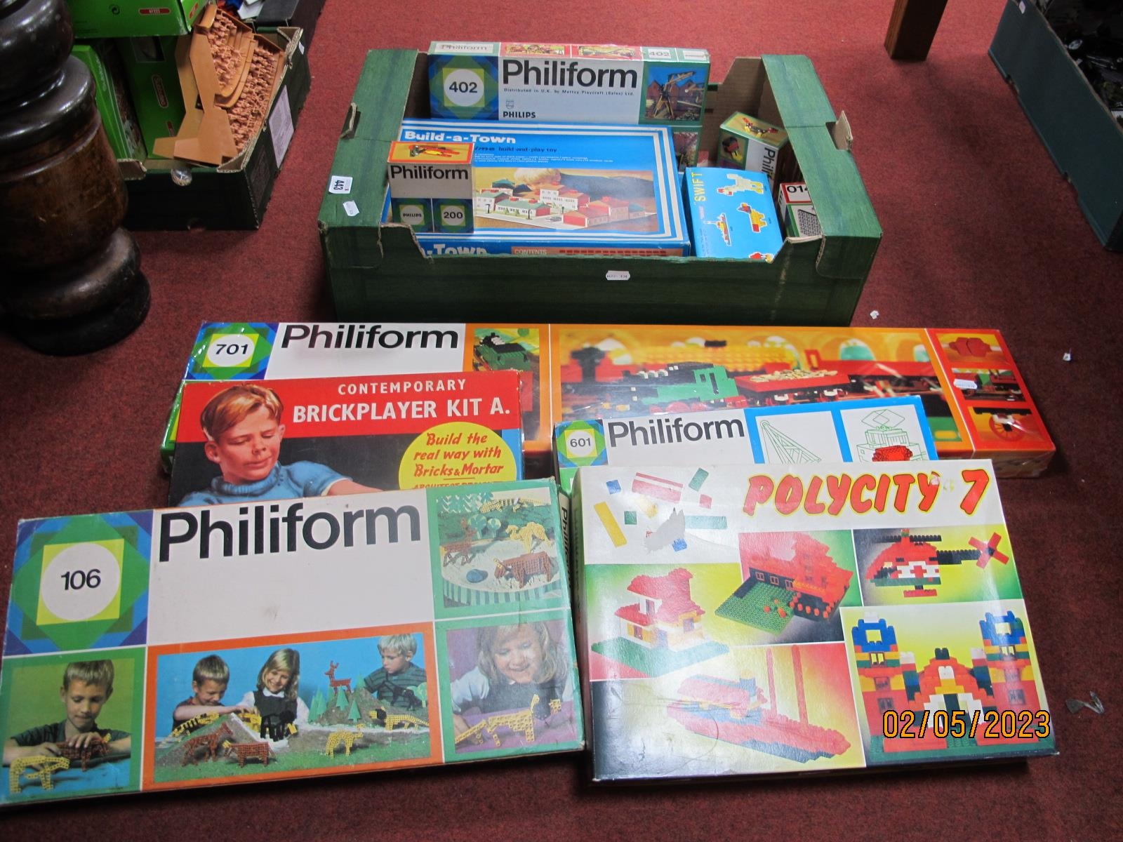 A Collection of Children's Toy Construction Sets, to include Philips Philiform #701, #106, #601, #402, Tri-ang/Roves Build-A-Town (incomplete), Spears Games Contemporary Bricklayer Kit A, boxed , (completeness of all small parts not guaranteed).