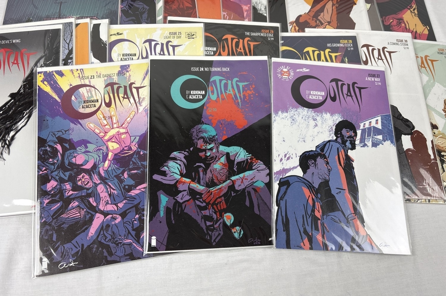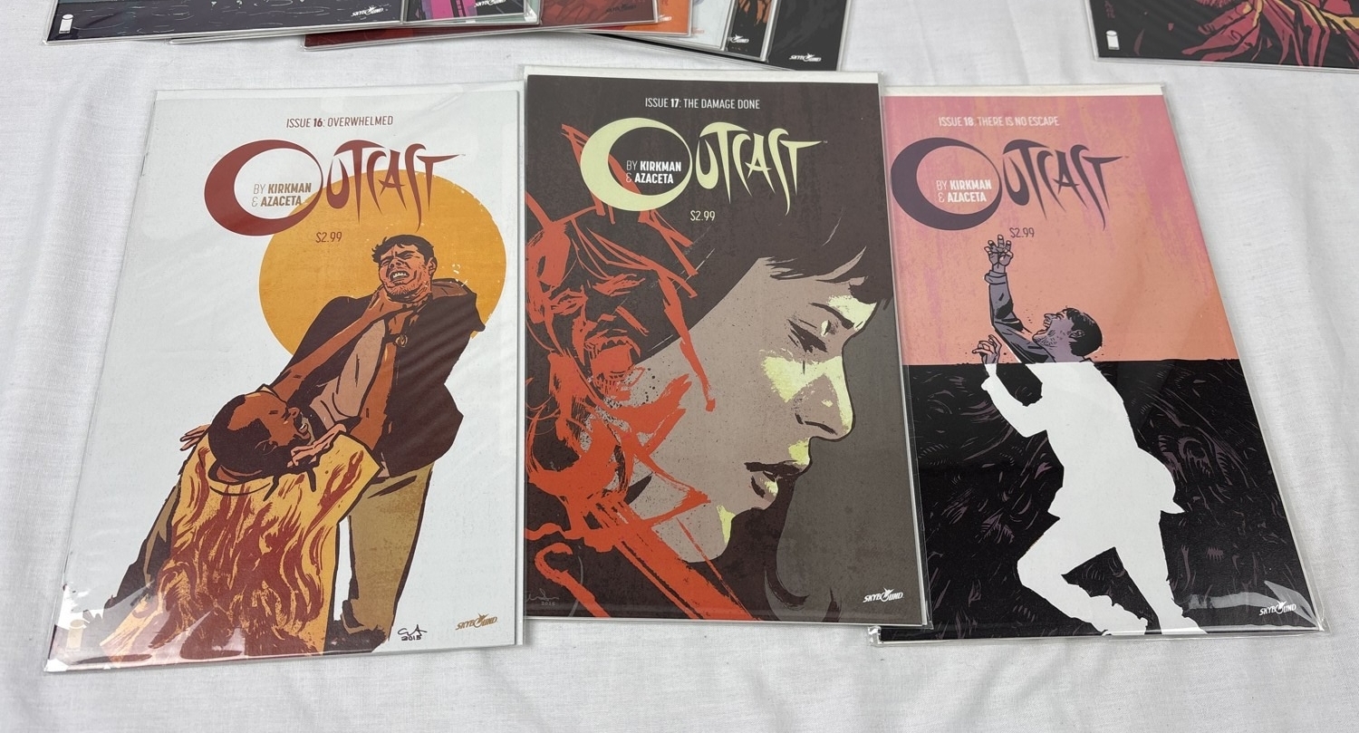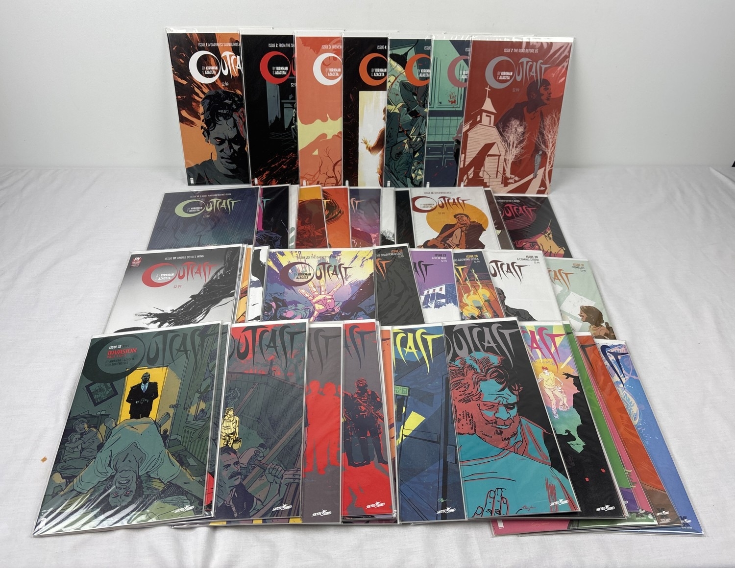 Complete set of Outcast comic books by Image Comics, 2014. Comprising issues #1-48, together with additional "SDCC 2016 Photo Edition Previews Exclusive" version of issue #19 and "Variant Image Tribute Cover" version of issue #25. All issues are bagged & carded.