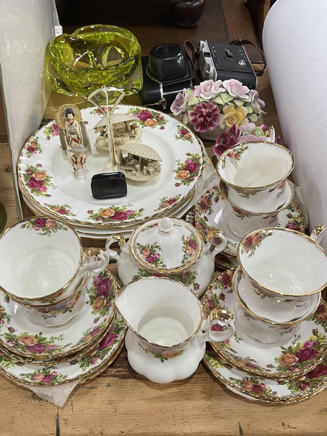 Collection of Royal Albert Old Country Roses, cameras, glass bowl, etc.