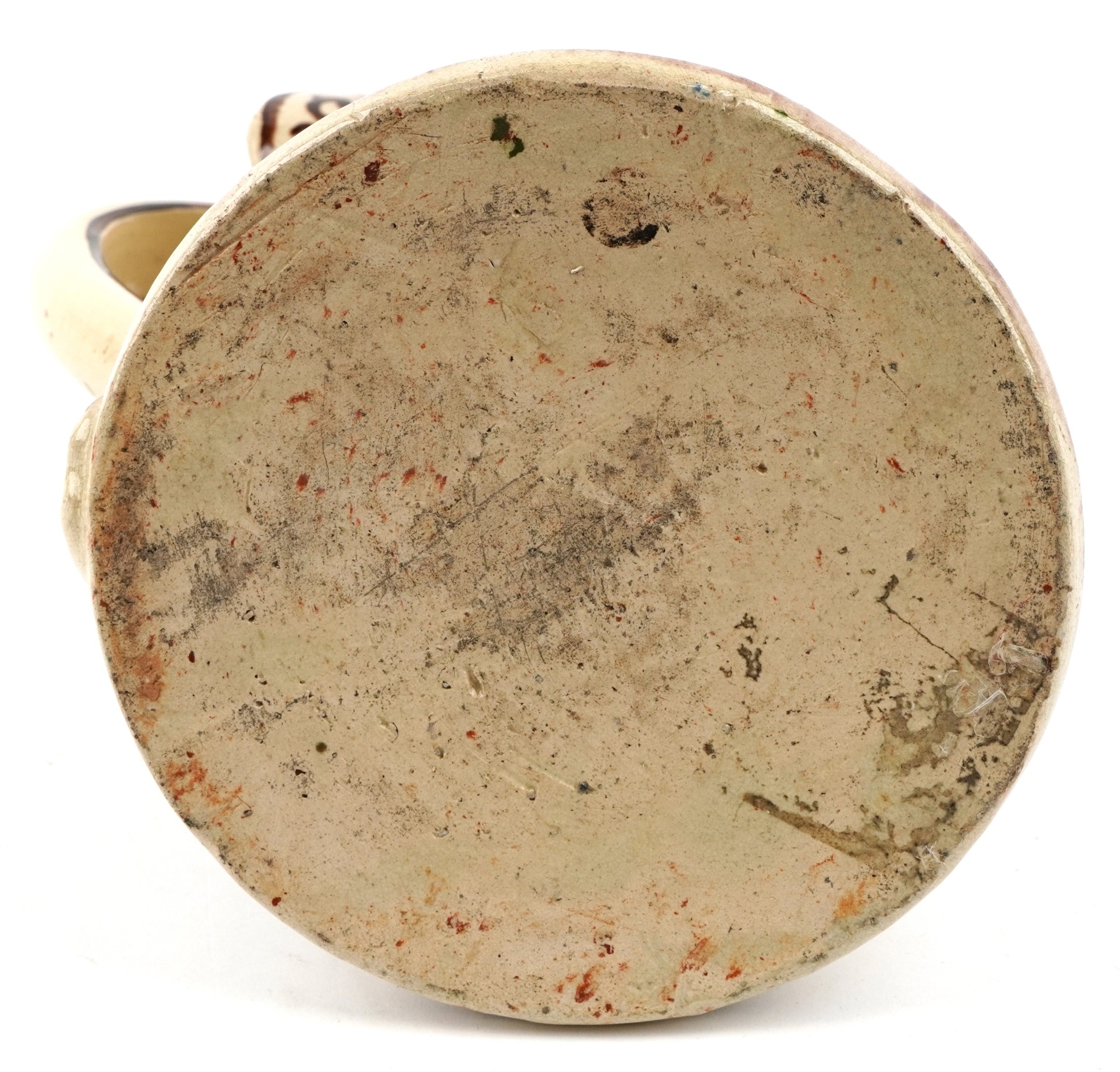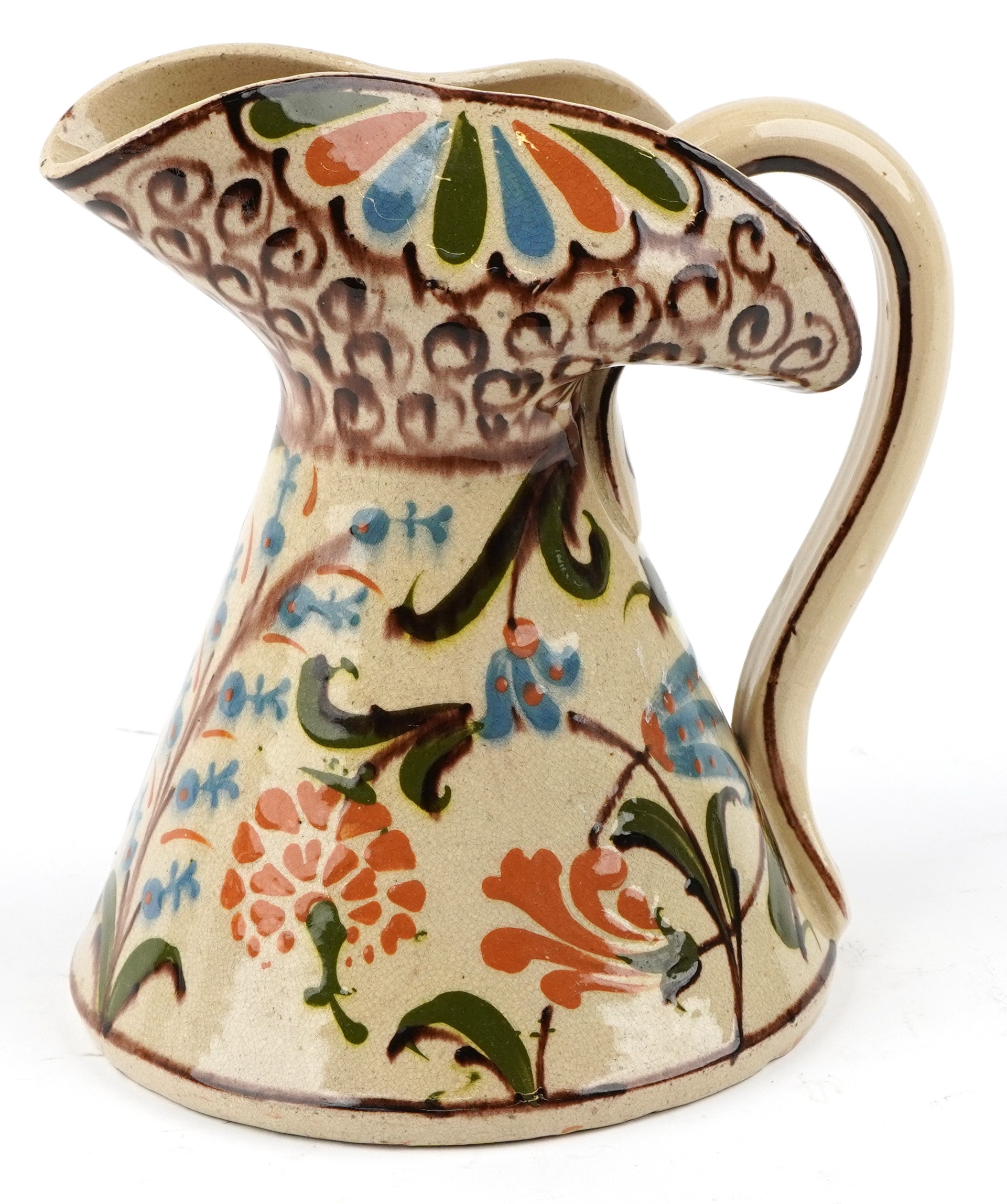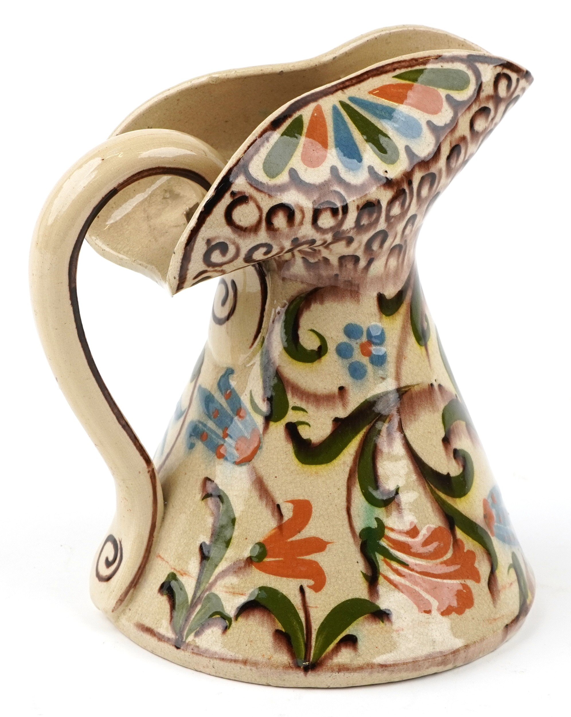 A mid 20th century studio pottery jug with hand painted decoration, 21cm high.