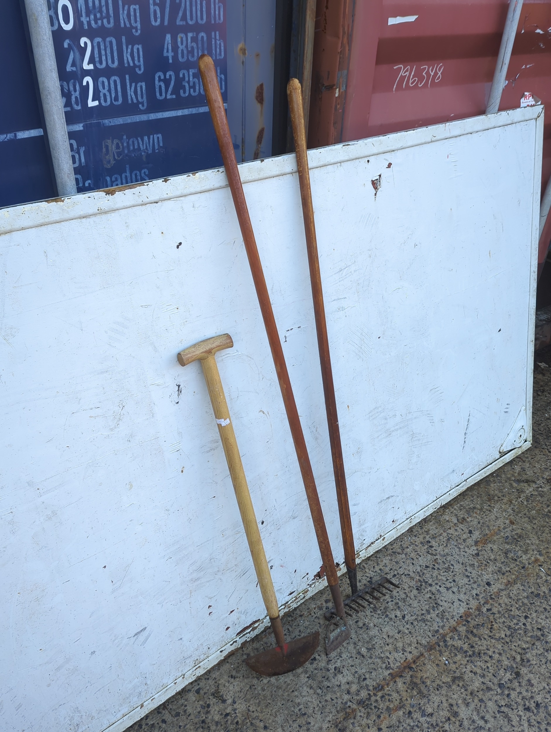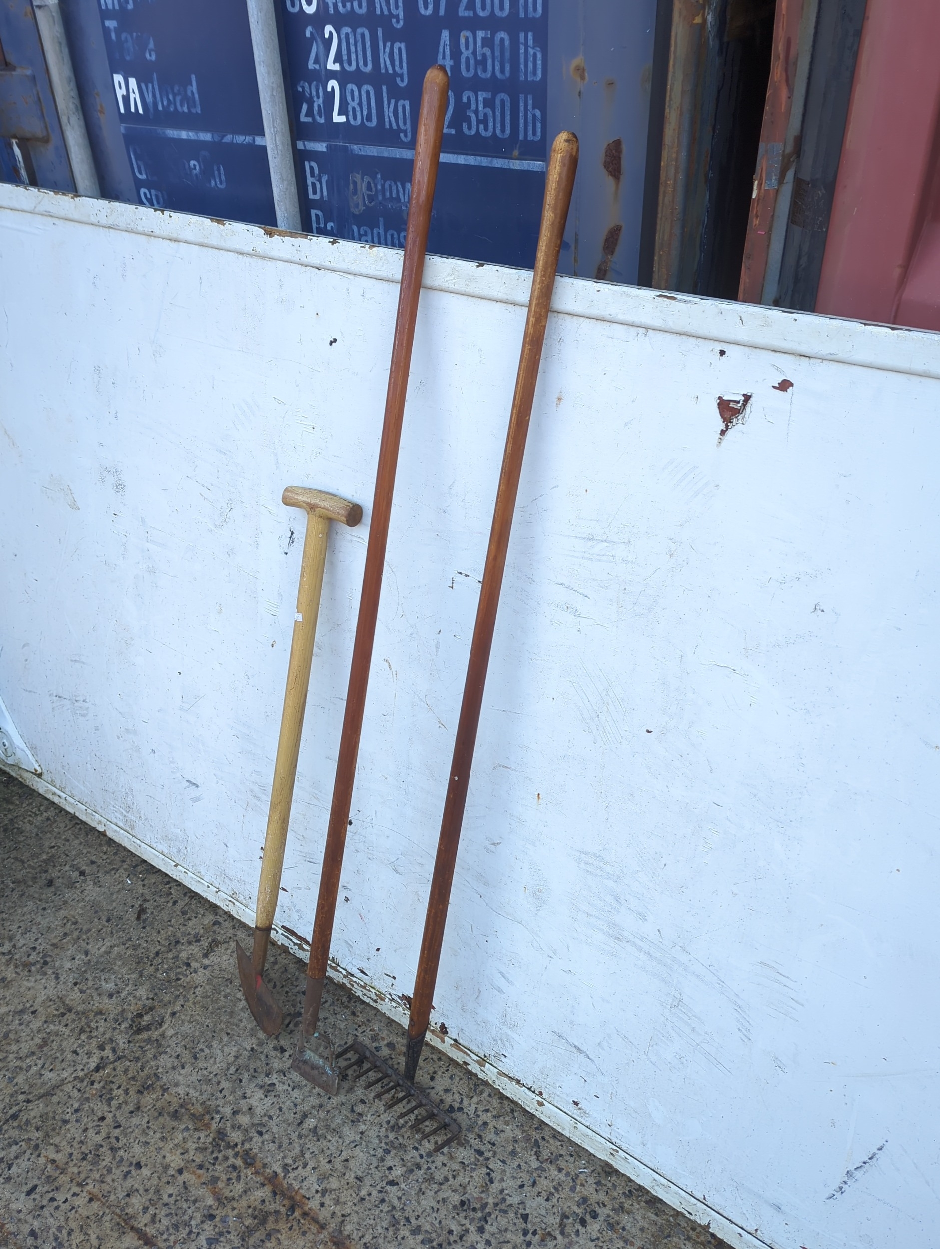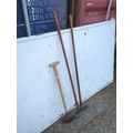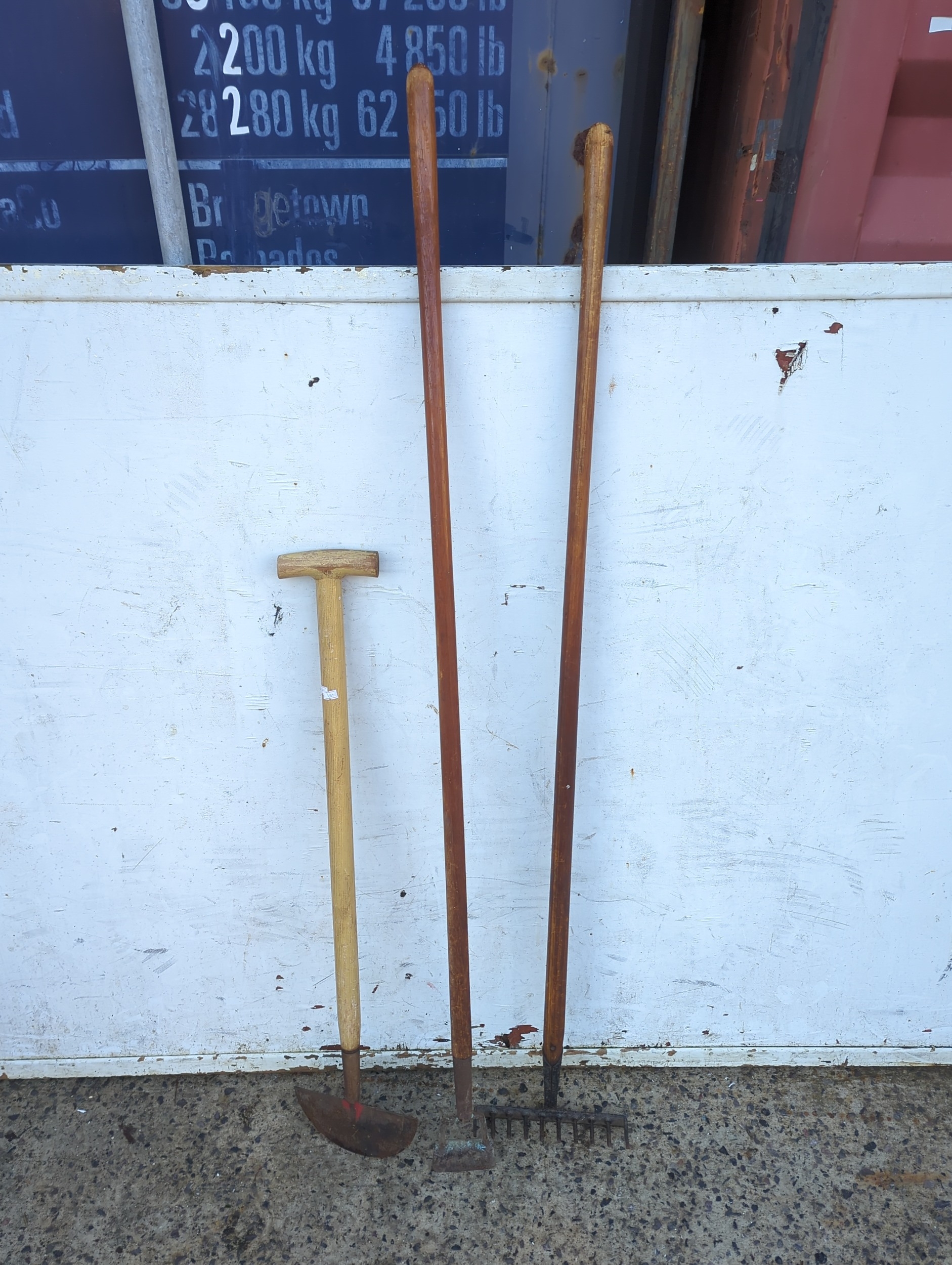 This lot includes three garden tools suitable for various outdoor tasks. It features a rake, a hoe, and another implement, each with wooden handles for comfortable grip. These tools are ideal for gardening enthusiasts looking to maintain their garden.