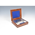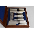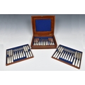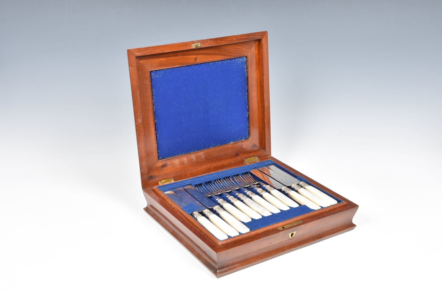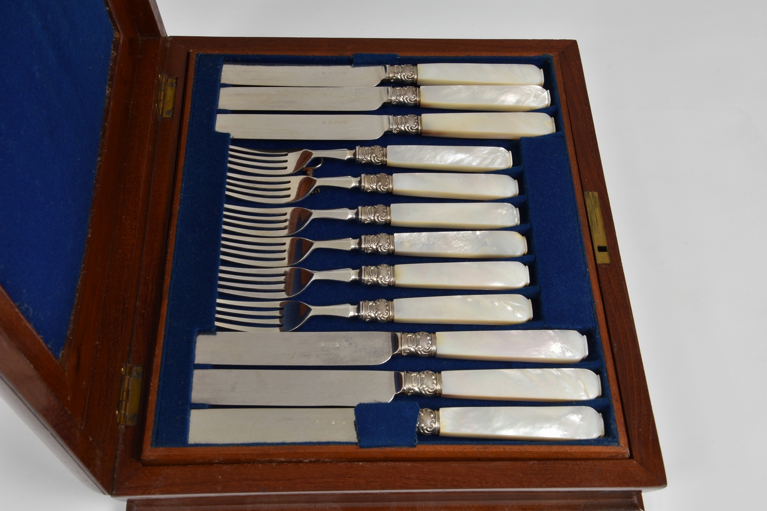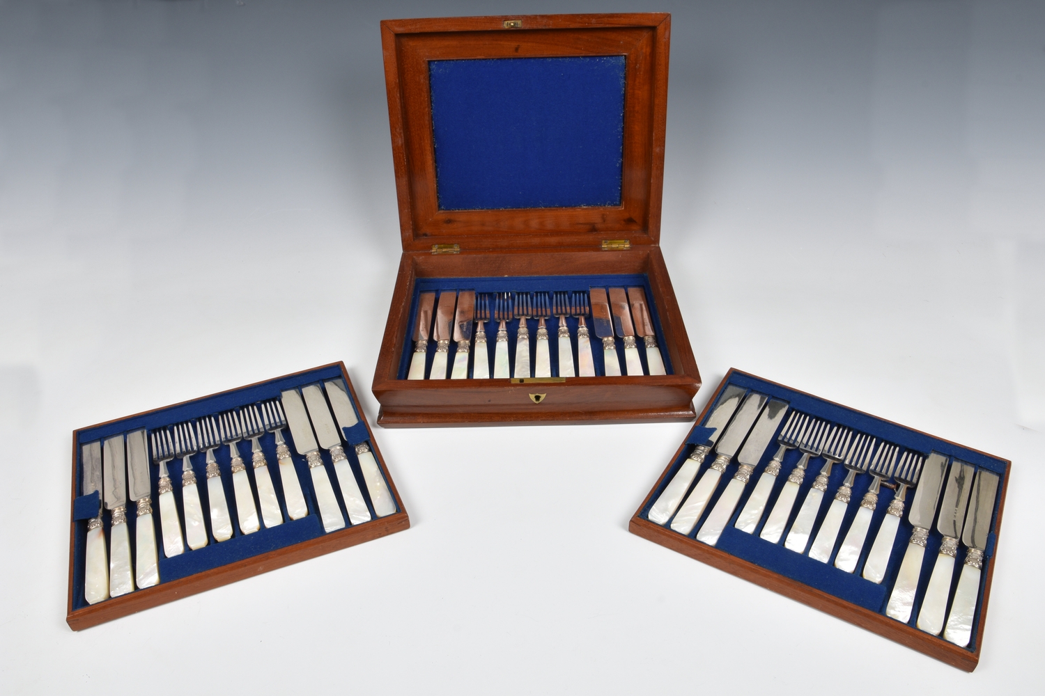 A mahogany cased set of mother of pearl handled silver plated knives and forks for eighteen settings, Charles Ellis & Co, the lockable case, opening to reveal three fitted blue velvet lined trays of six knives and forks, knives measuring 8 3/8in. (21.4cm.) long.. * Very good condition, light surface wear only, (appears to be little used)