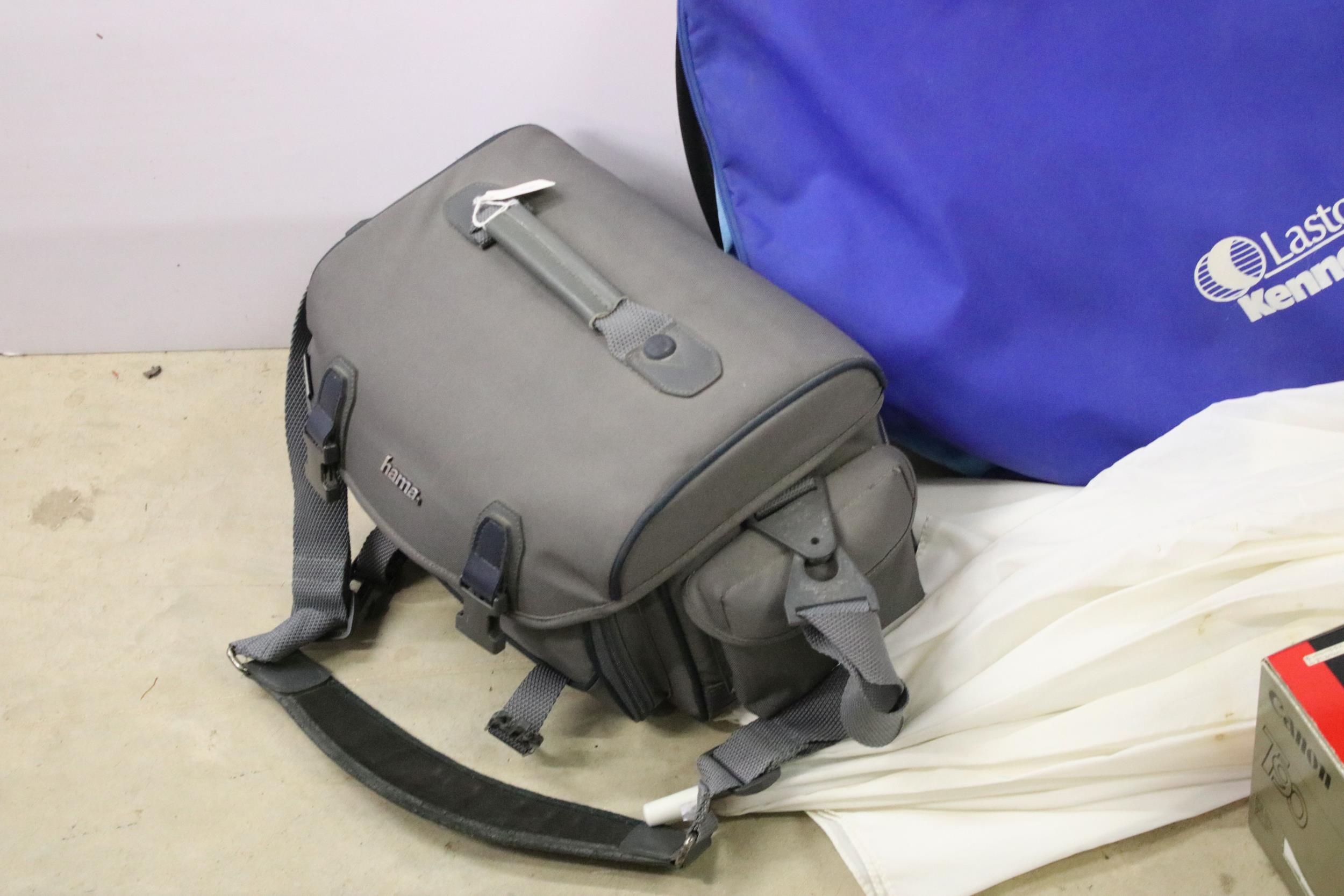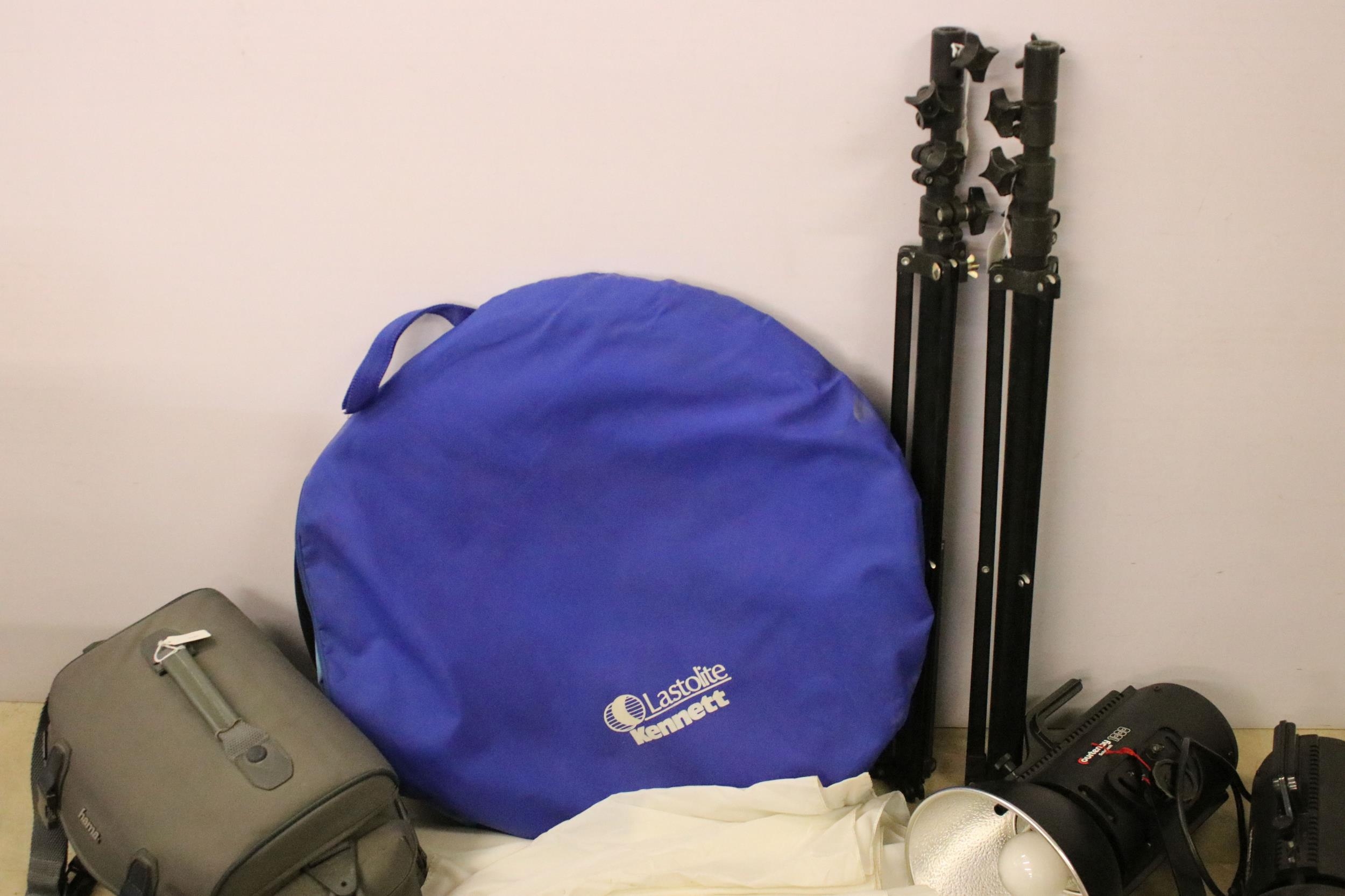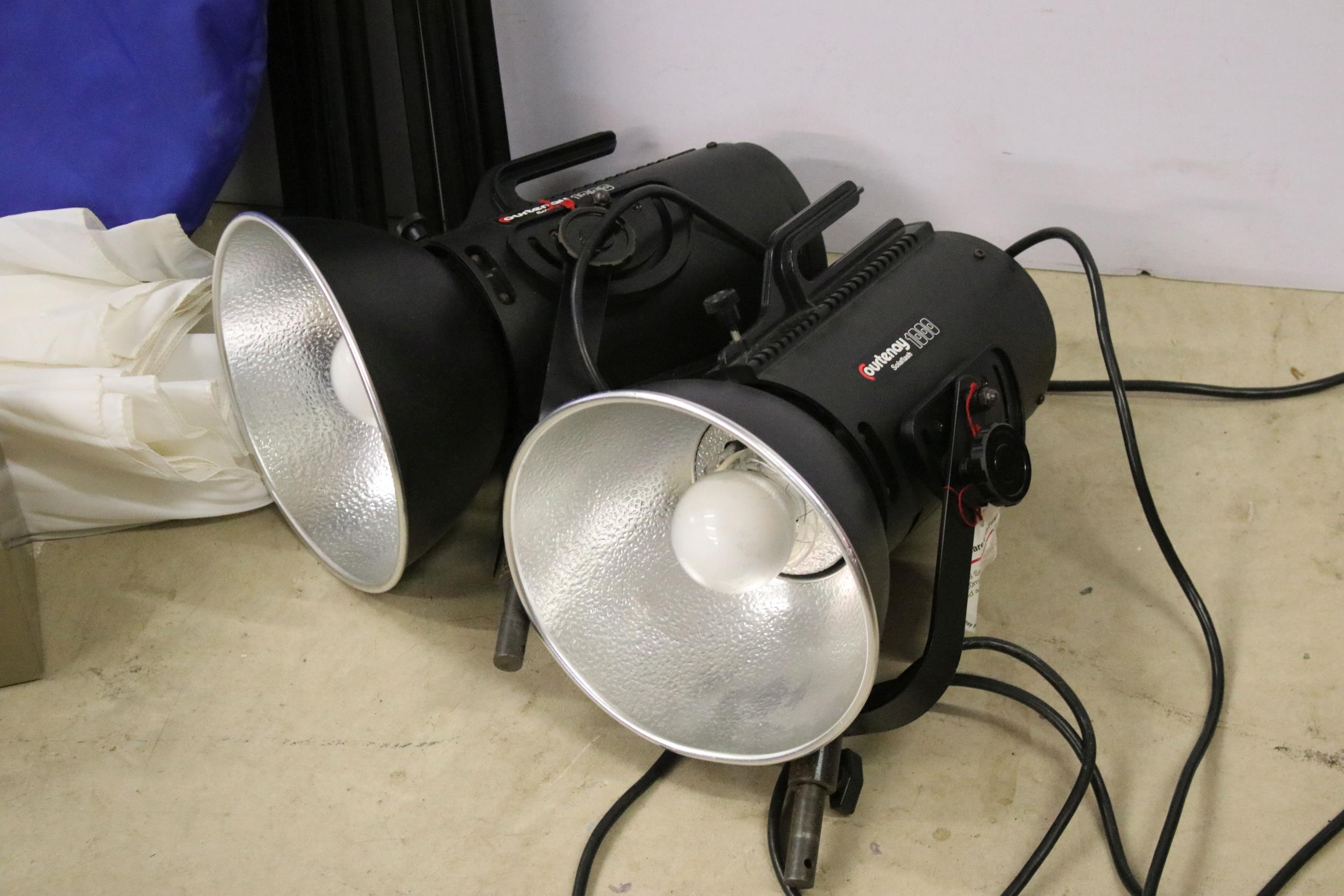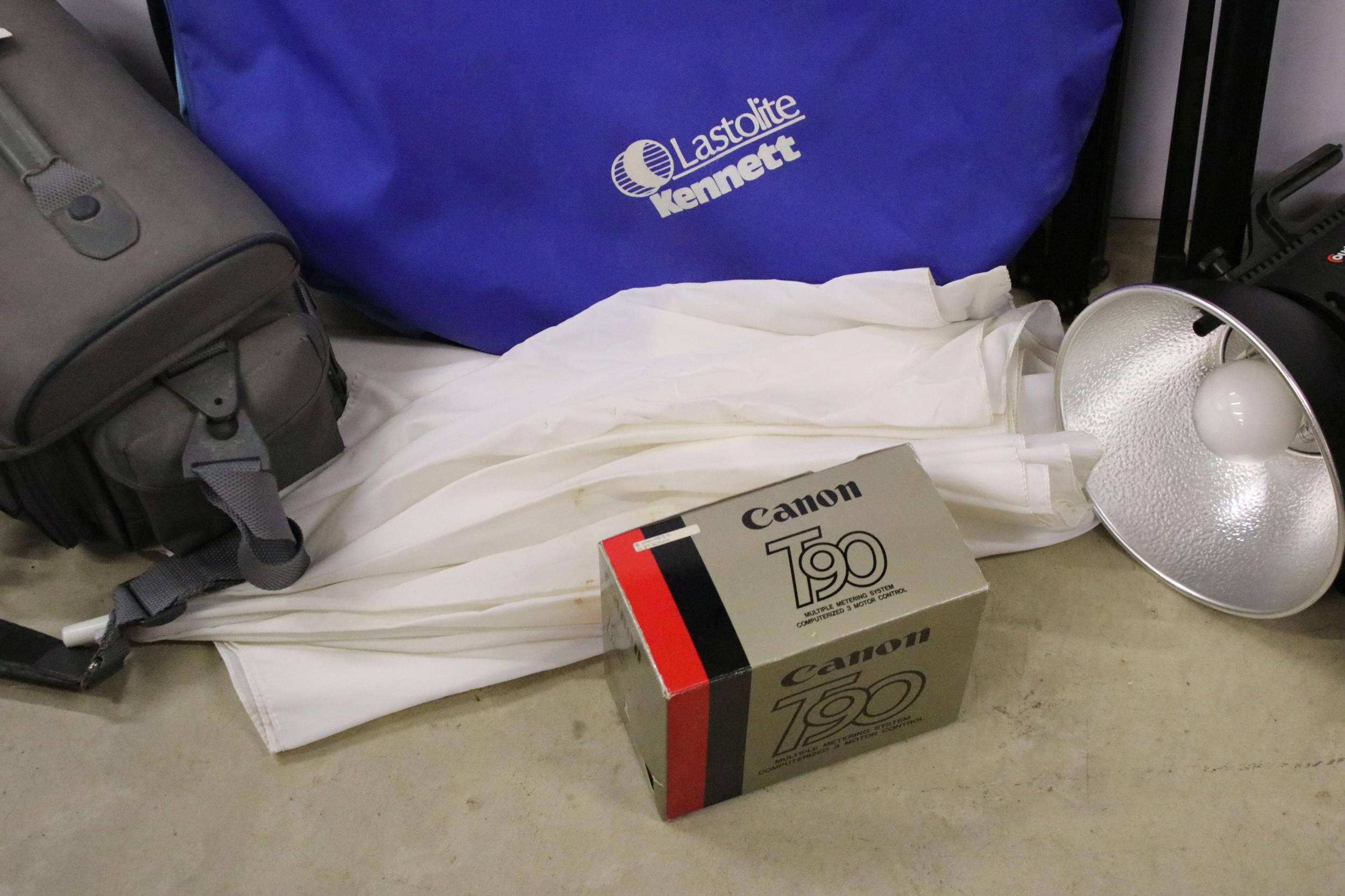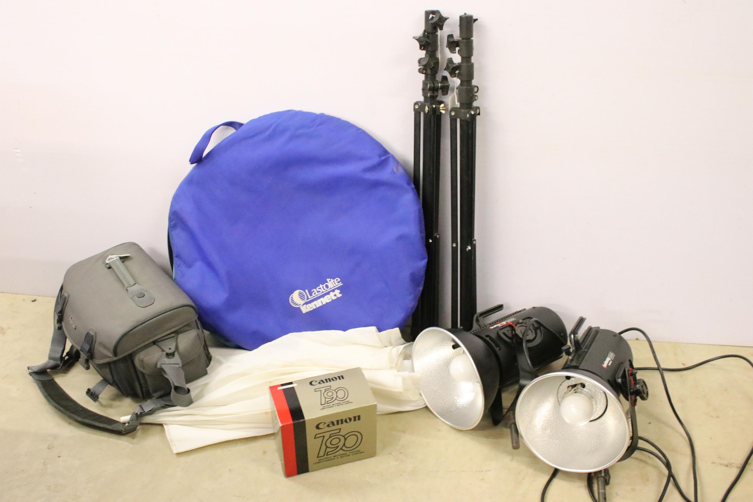 Collection of photographic equipment featuring Cannon T90 fitted with 50mm f/1.8 lens & 2 x Courtney Solaflash 1000 Studio light etc.