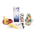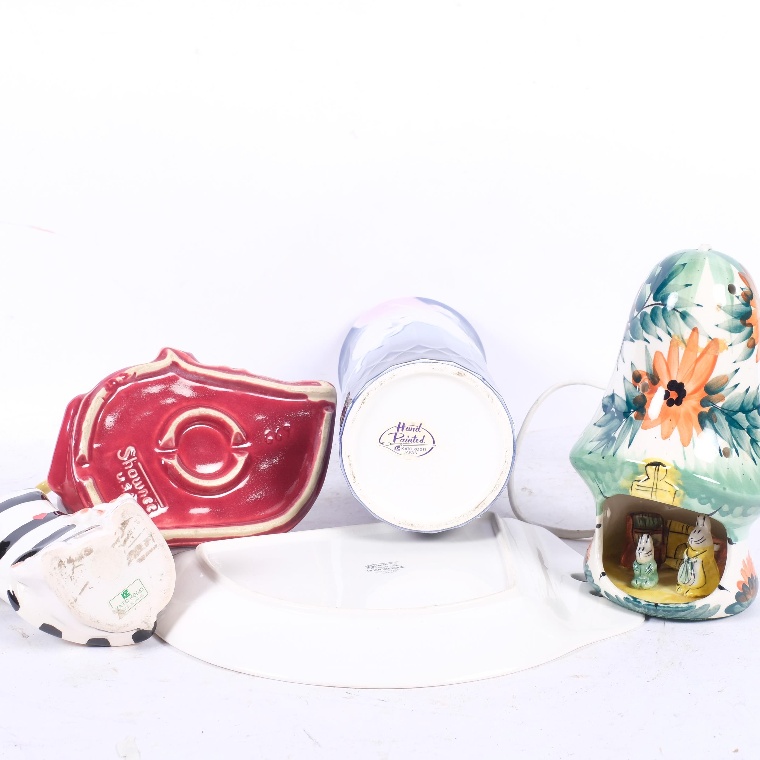 Kato Kogei, Japan, a 1980s post-modern "Humoresque" plate, cat vase, a Shawnee (USA) art pottery planter, with deer and fawn figures, and a Derek Fowler ceramic lamp, H18cm