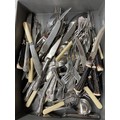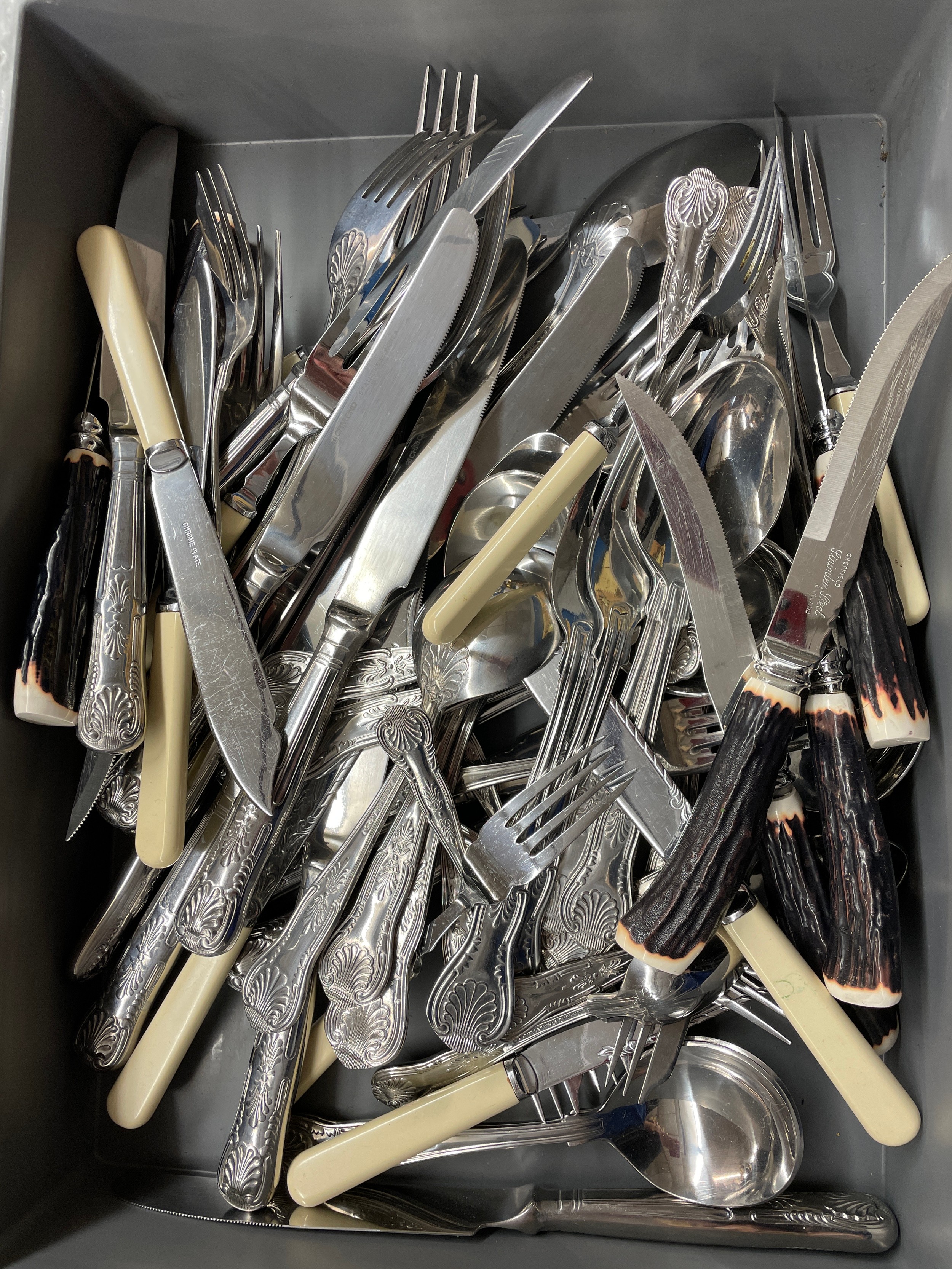 BOX OF PLATED CUTLERY AND IMITATION HORN HANDLED STEAK KNIVES
