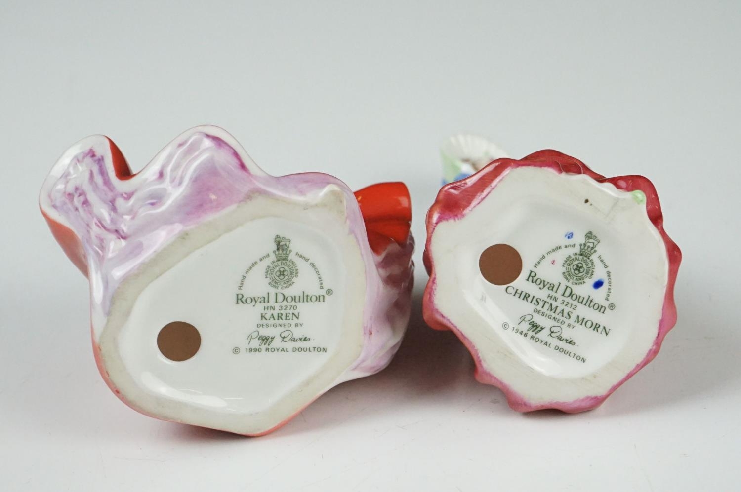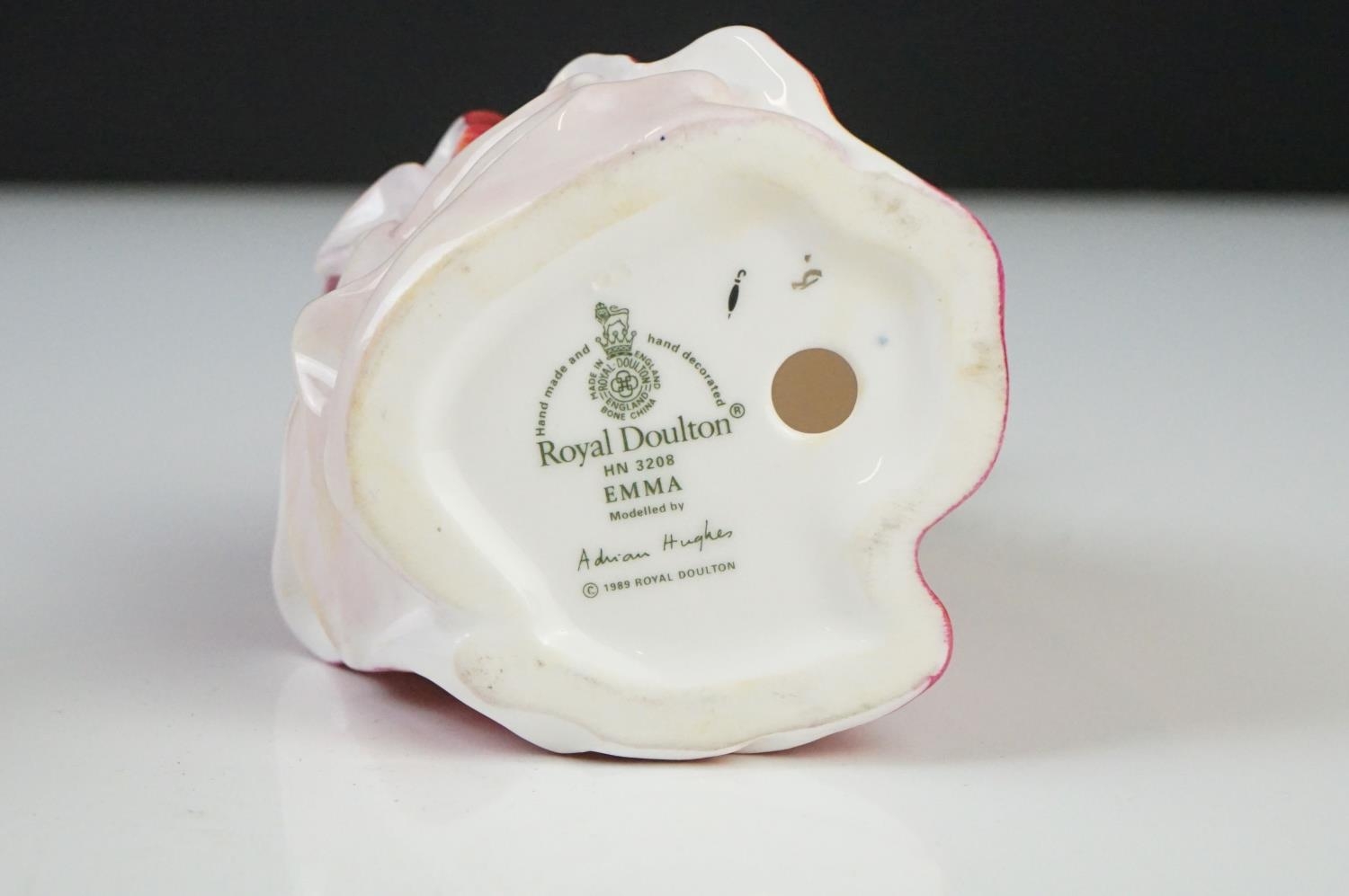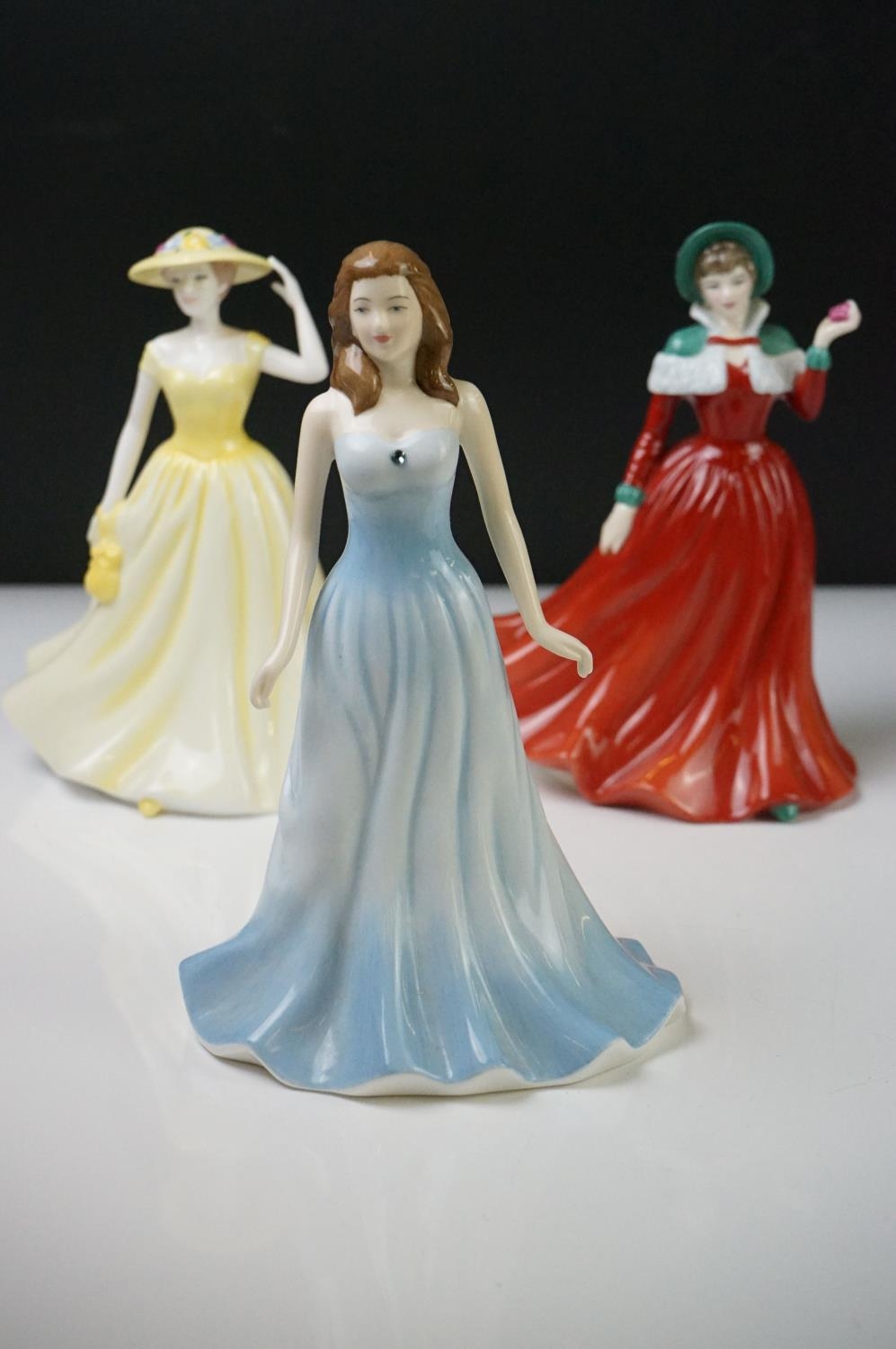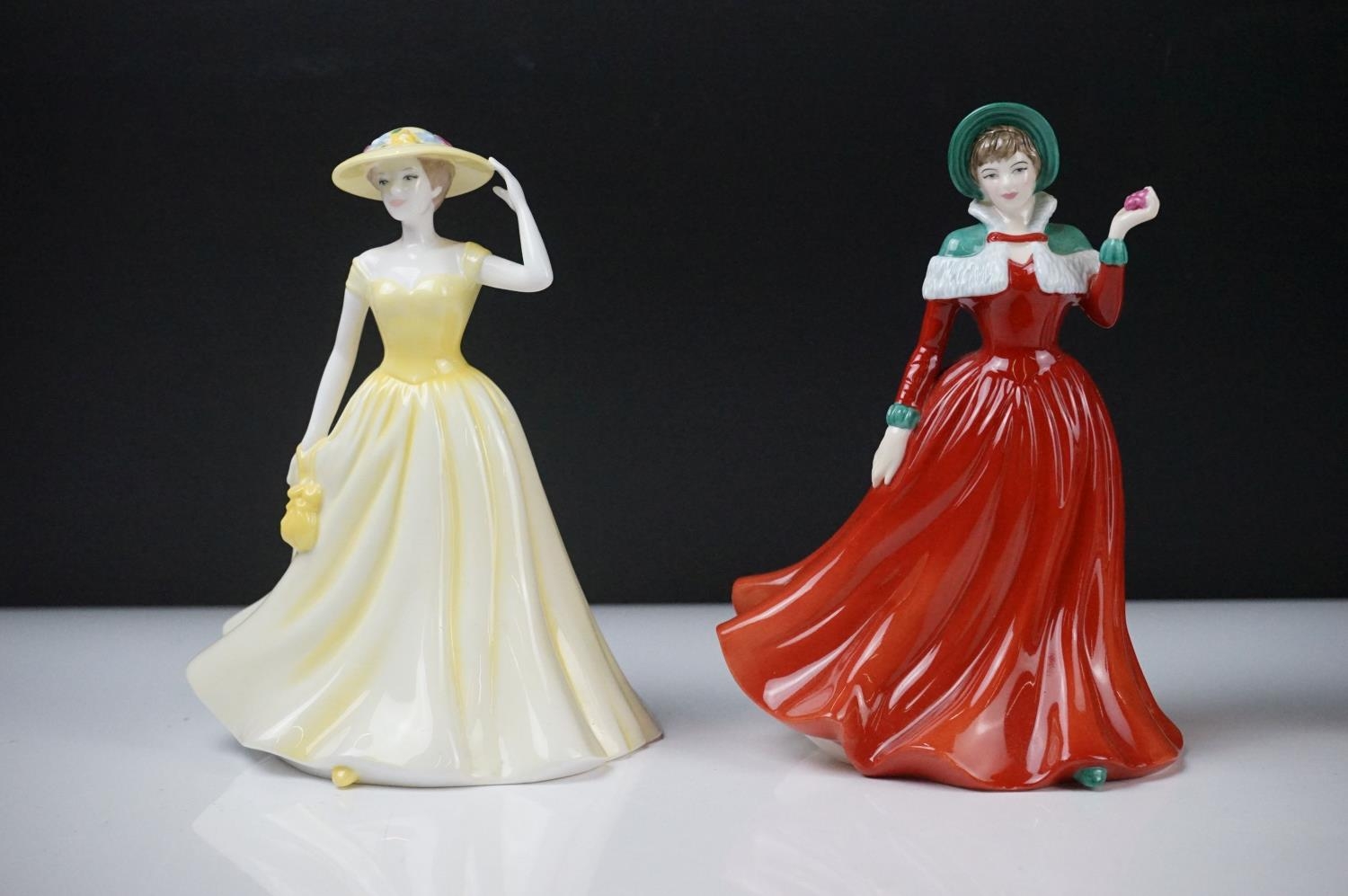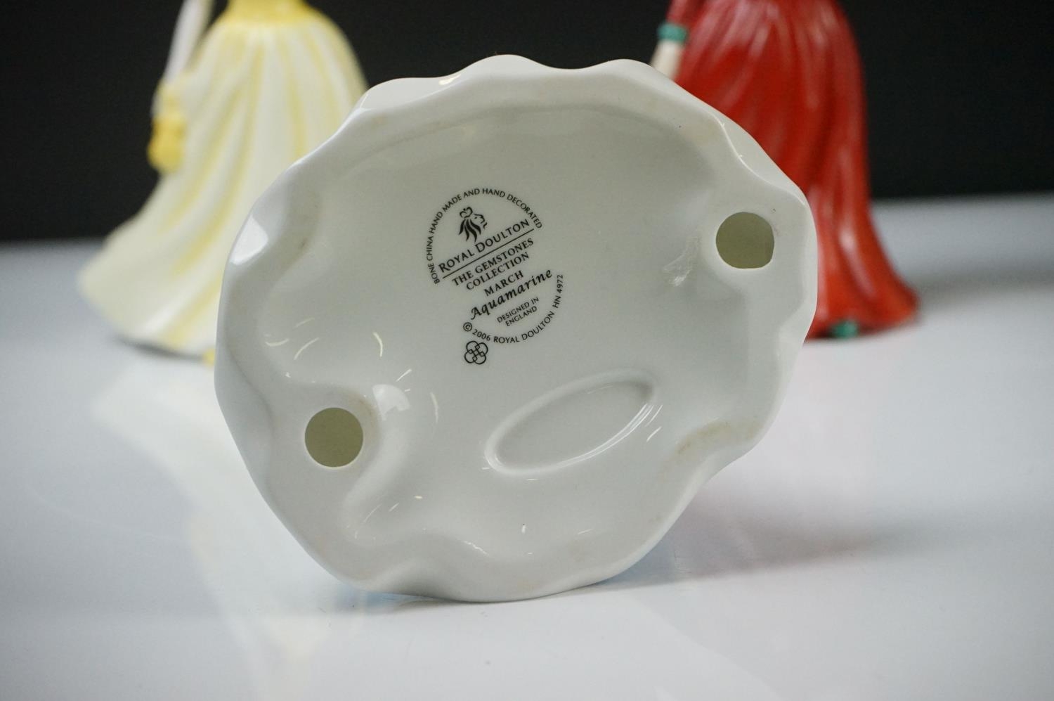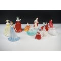 Eleven Royal Doulton Figurines including Christmas Morn HN3212, Emma HN3208, Esmeralda HN2168, Fragrance HN3220, Hanna HN3649, Karen HN3270, Ninette HN3215, Elaine style 2, March Aquamarine Gemstone collection, Springtime HN4586 and Winters Day HN4589