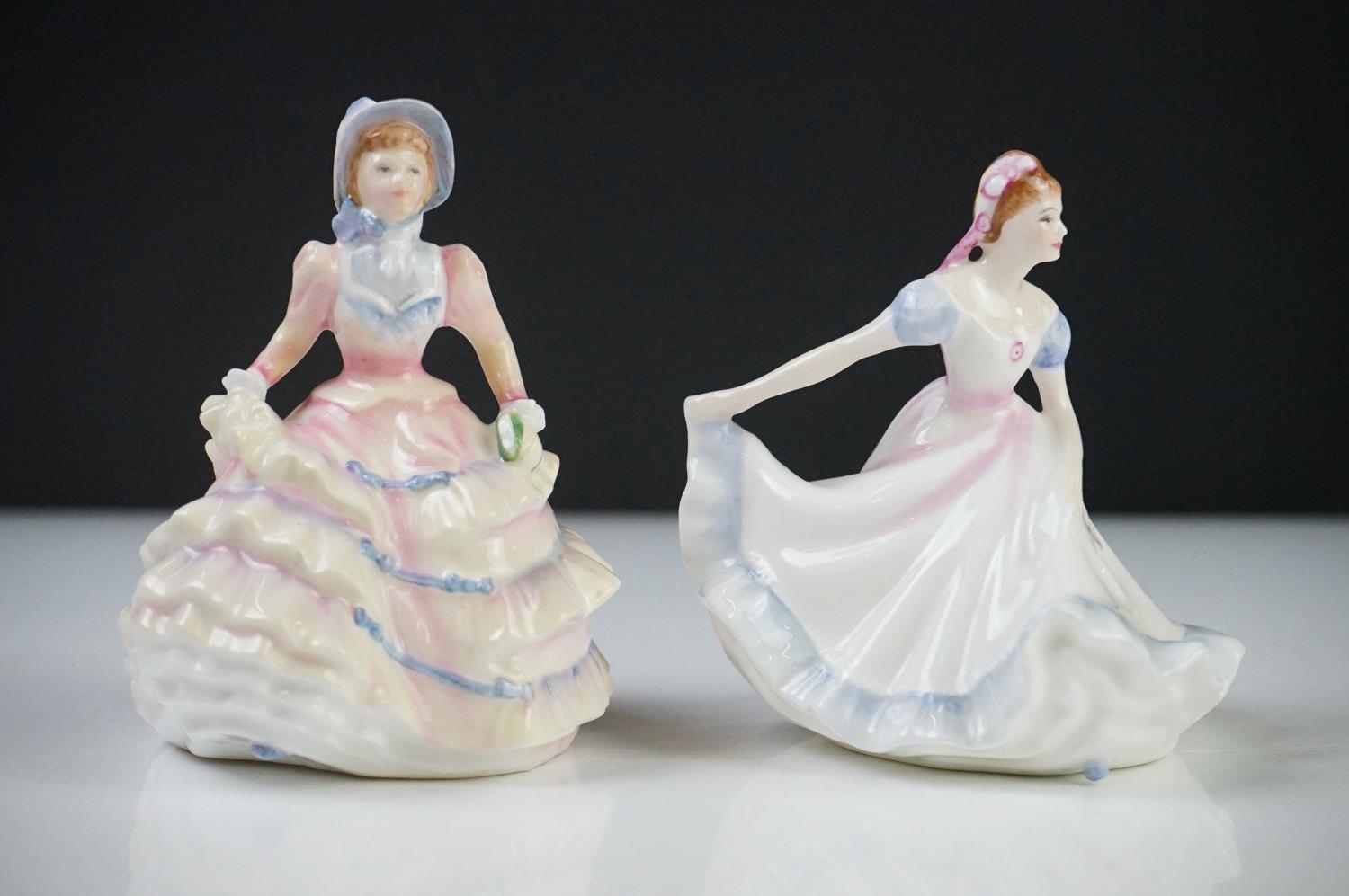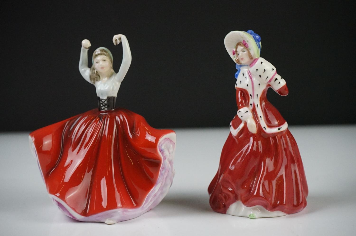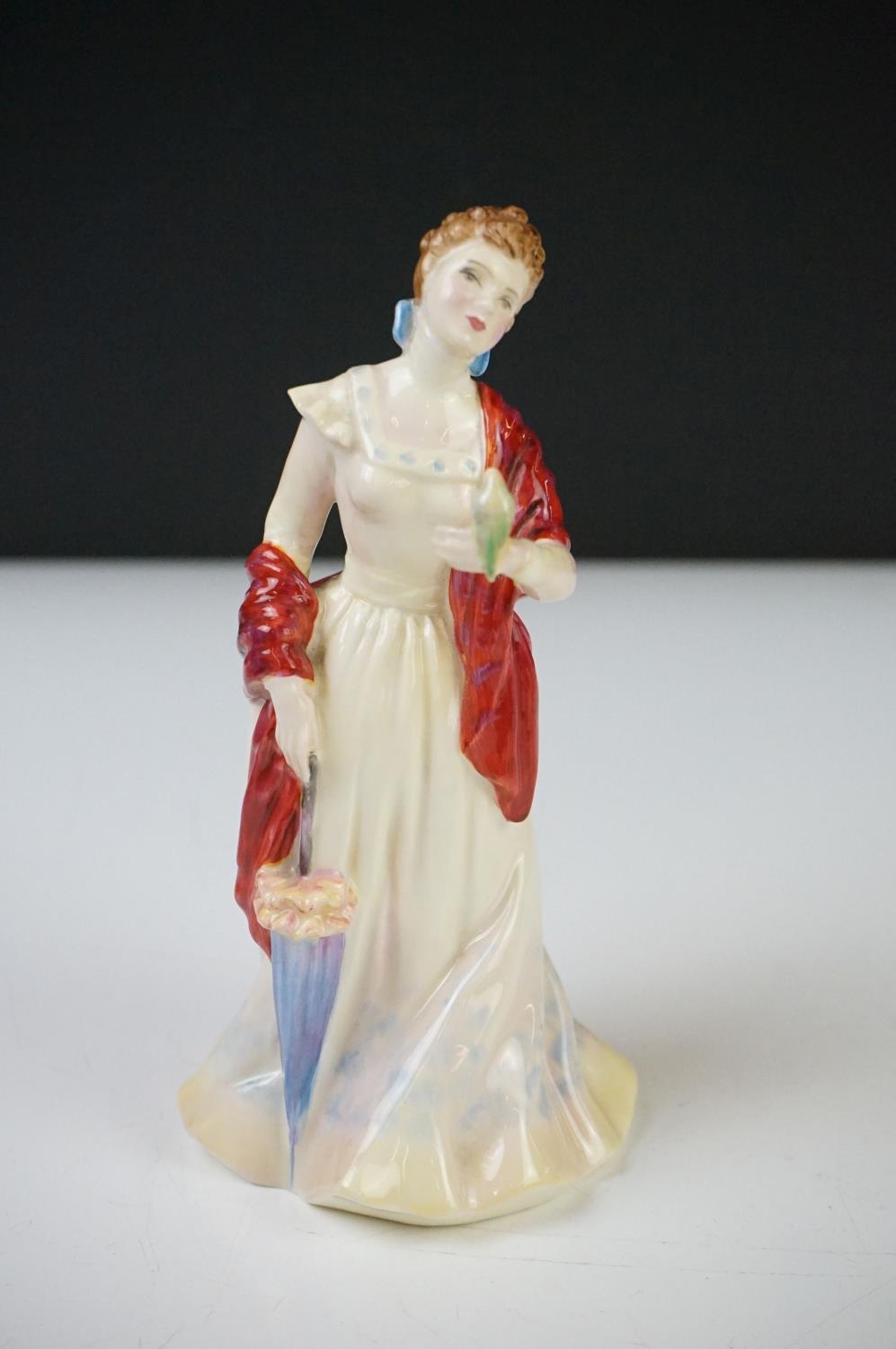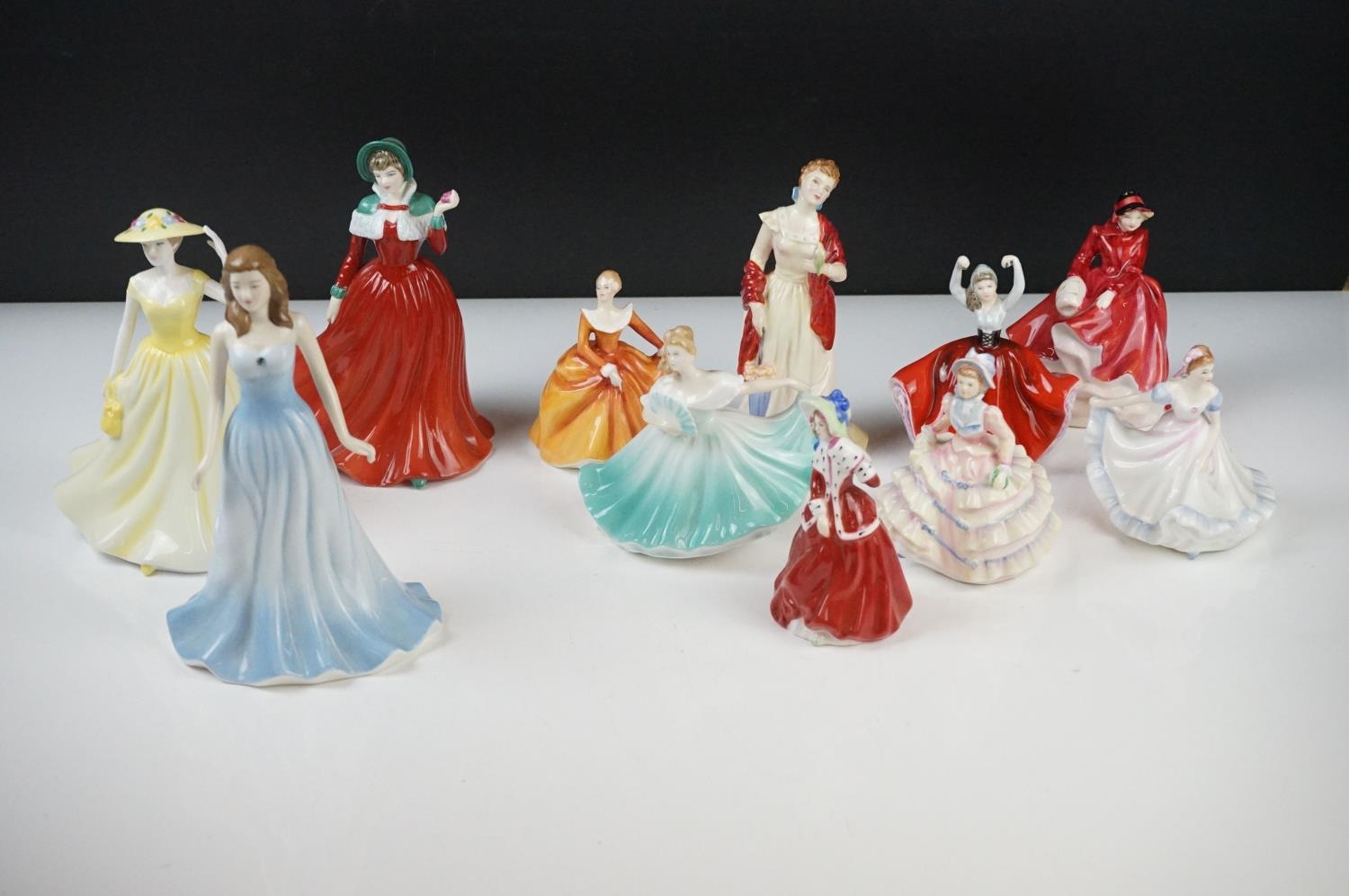 Eleven Royal Doulton Figurines including Christmas Morn HN3212, Emma HN3208, Esmeralda HN2168, Fragrance HN3220, Hanna HN3649, Karen HN3270, Ninette HN3215, Elaine style 2, March Aquamarine Gemstone collection, Springtime HN4586 and Winters Day HN4589