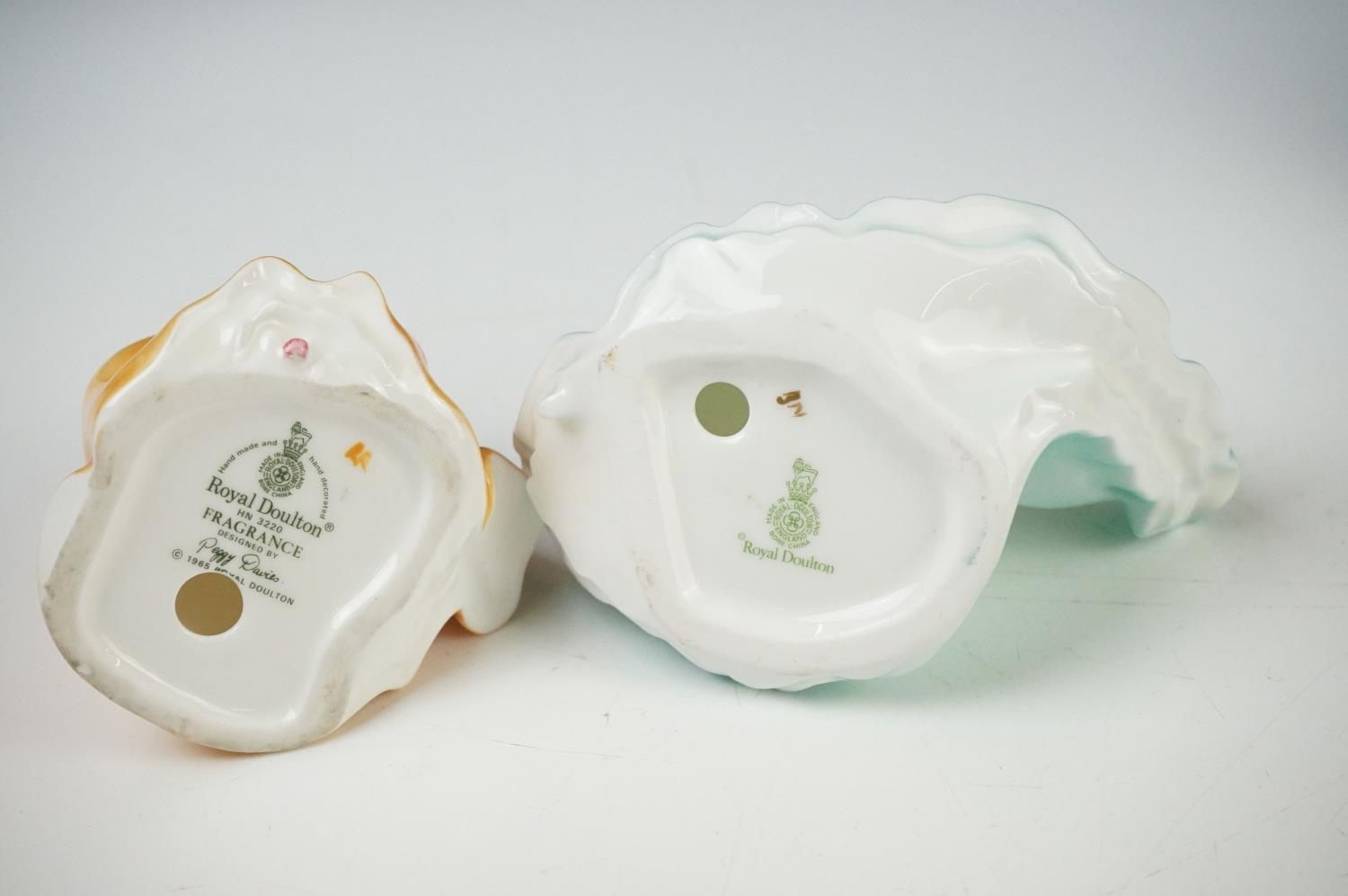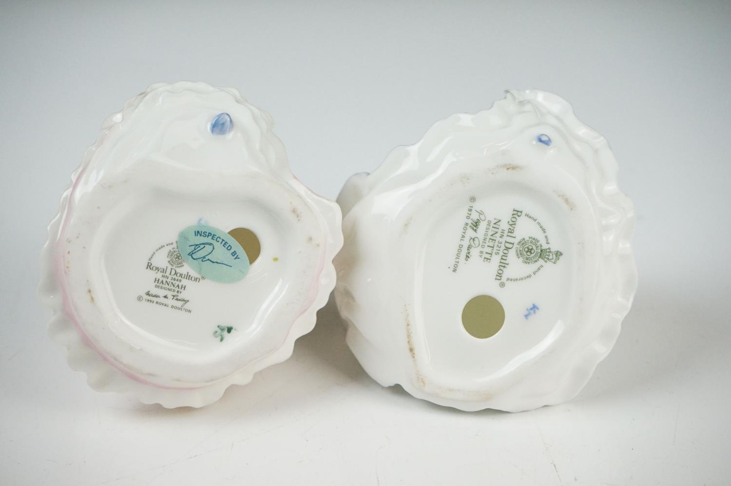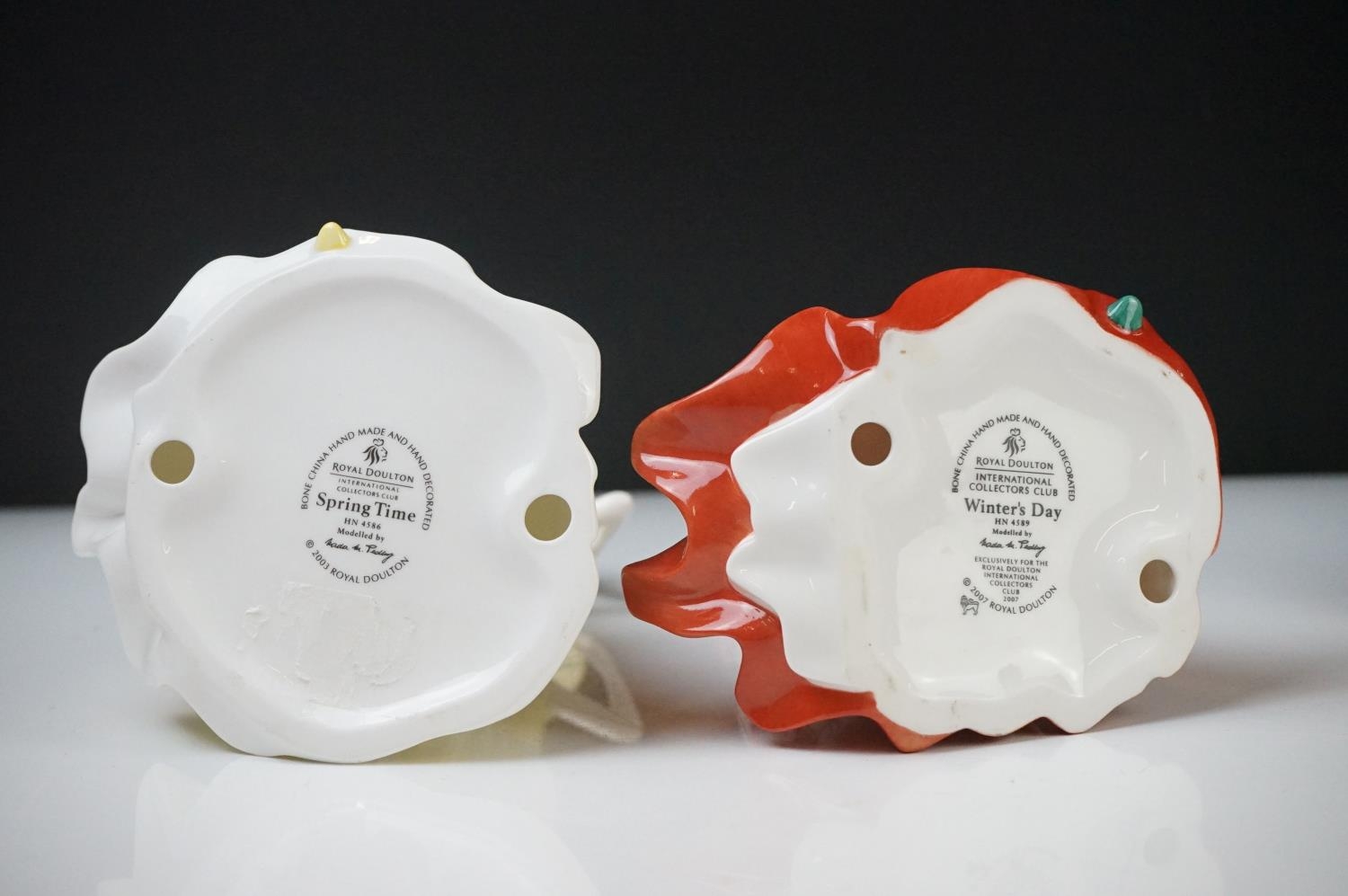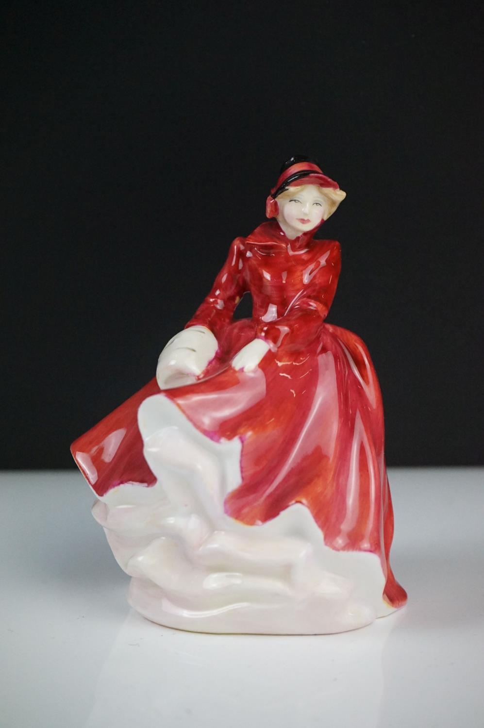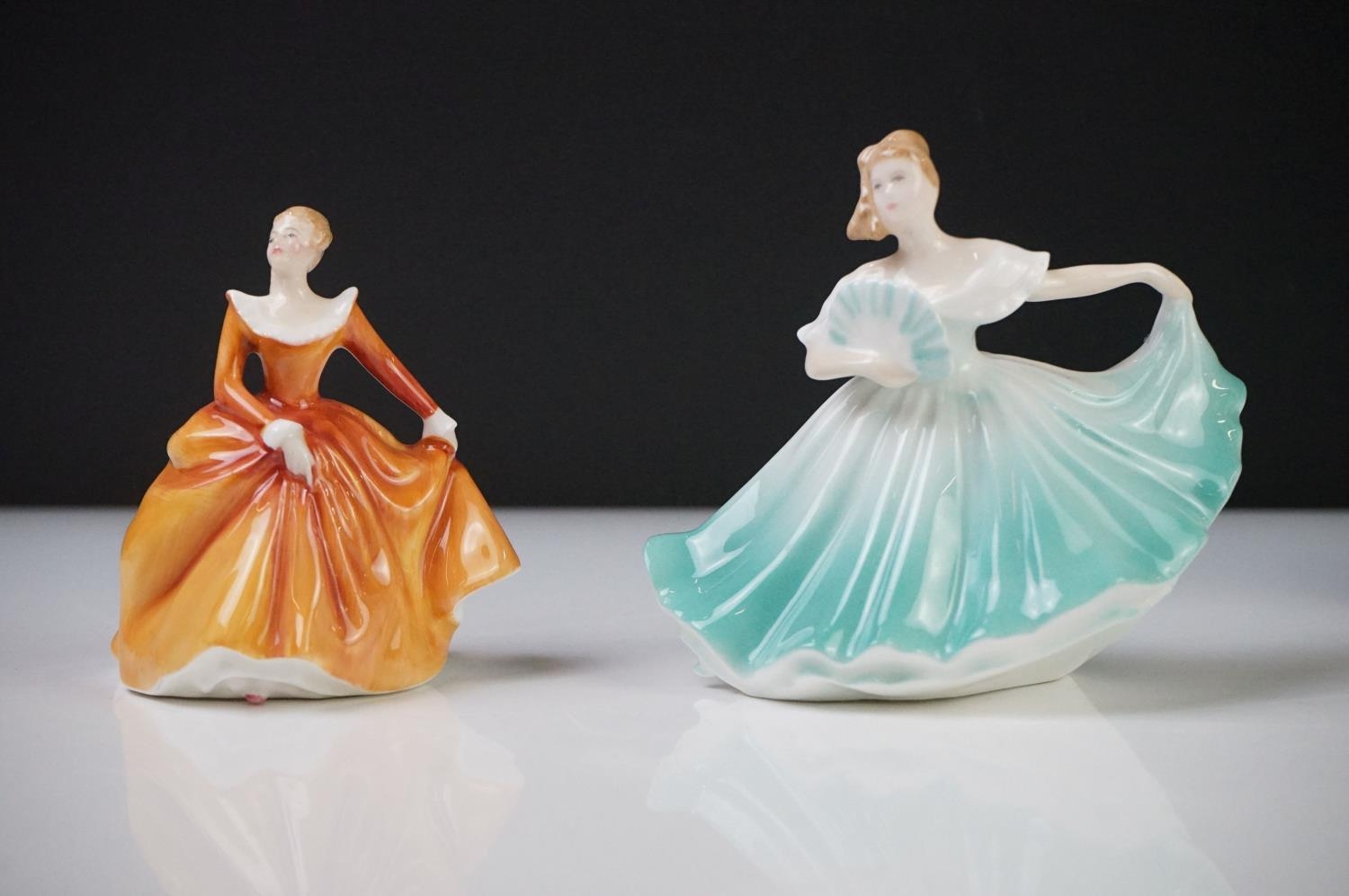 Eleven Royal Doulton Figurines including Christmas Morn HN3212, Emma HN3208, Esmeralda HN2168, Fragrance HN3220, Hanna HN3649, Karen HN3270, Ninette HN3215, Elaine style 2, March Aquamarine Gemstone collection, Springtime HN4586 and Winters Day HN4589