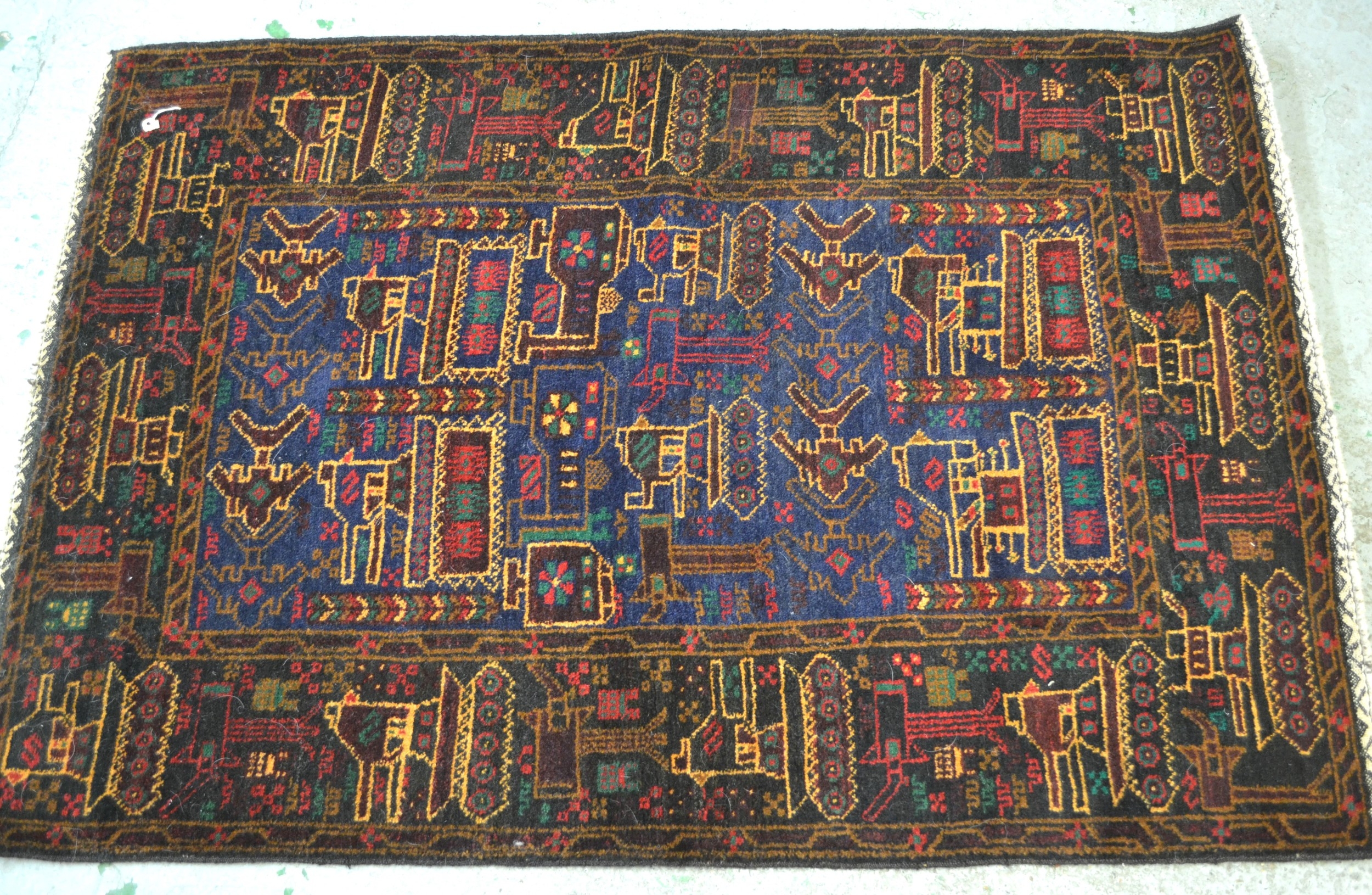 Afghan war rug, woven in typical dark shades and depicting various military vehicles and aircraft in a centre panel and boarders, 131 x 91cm approximately