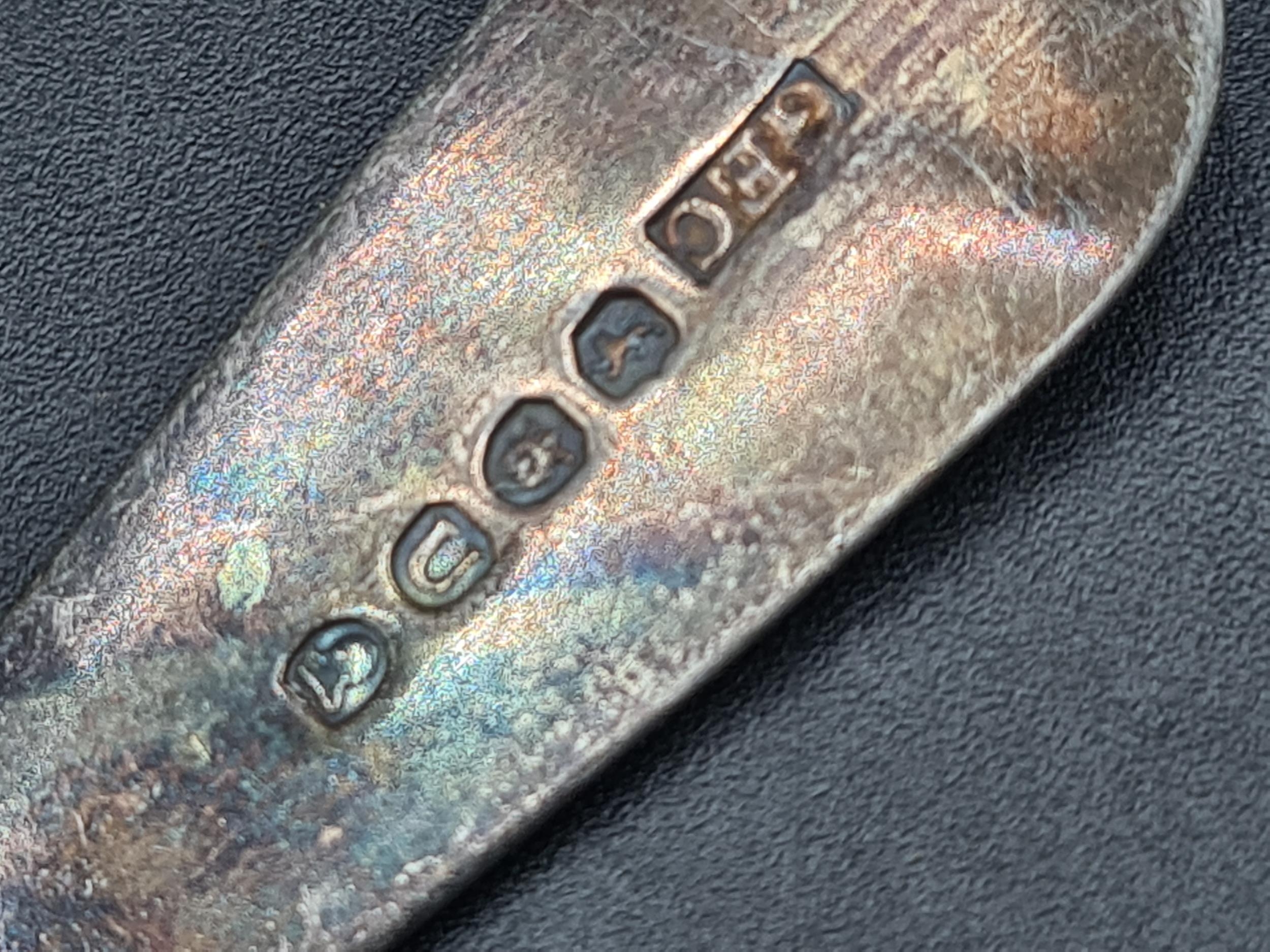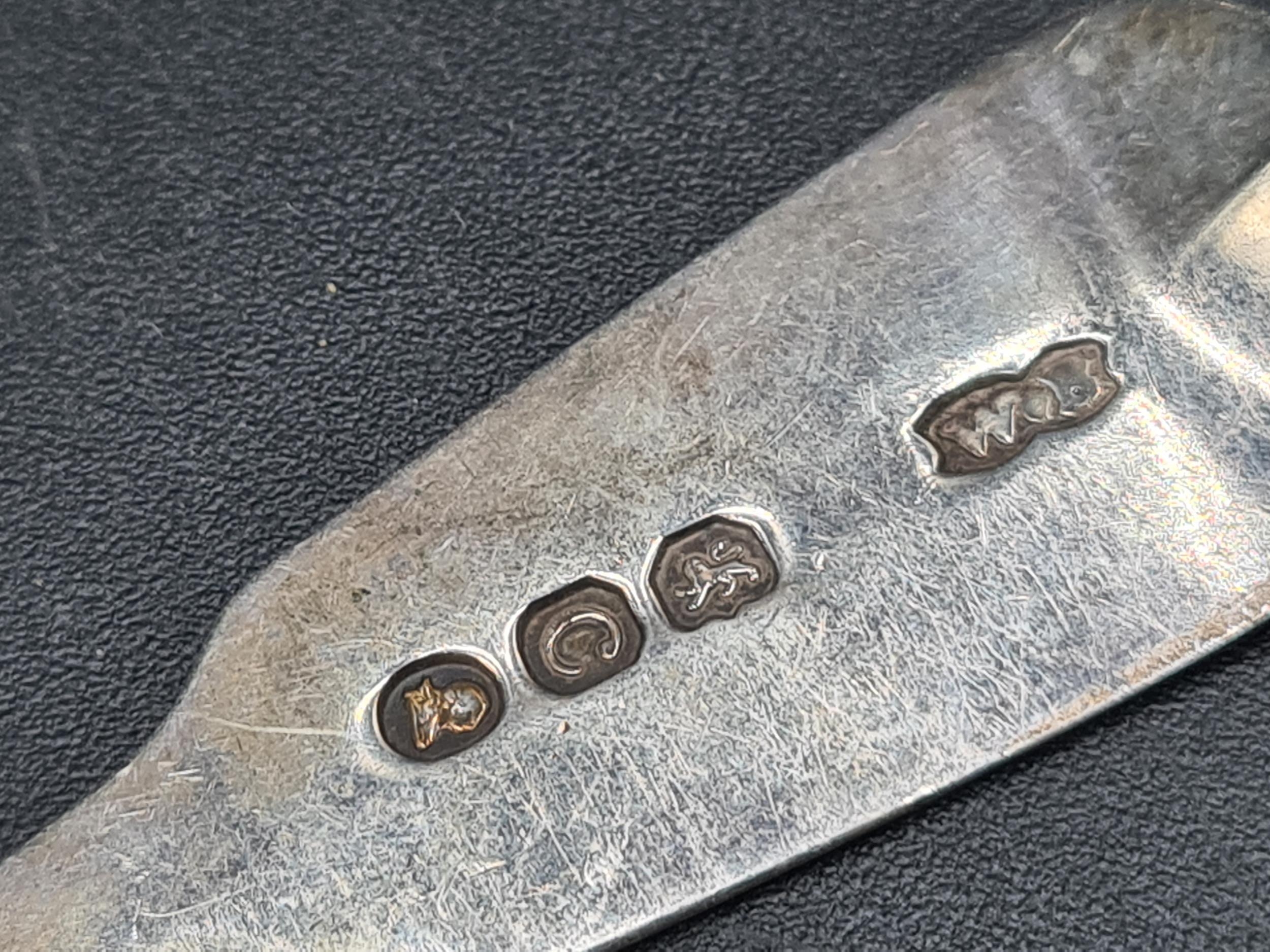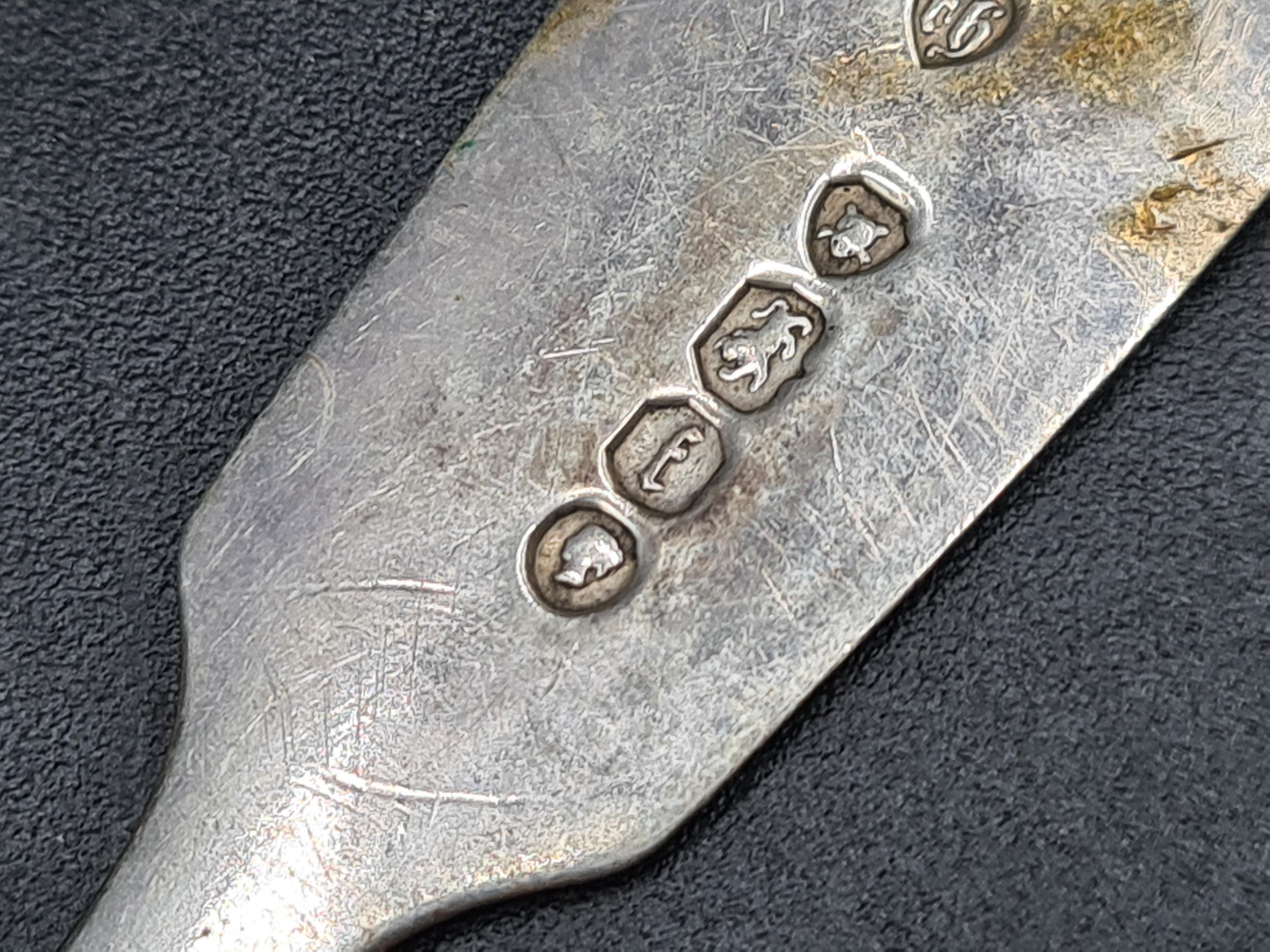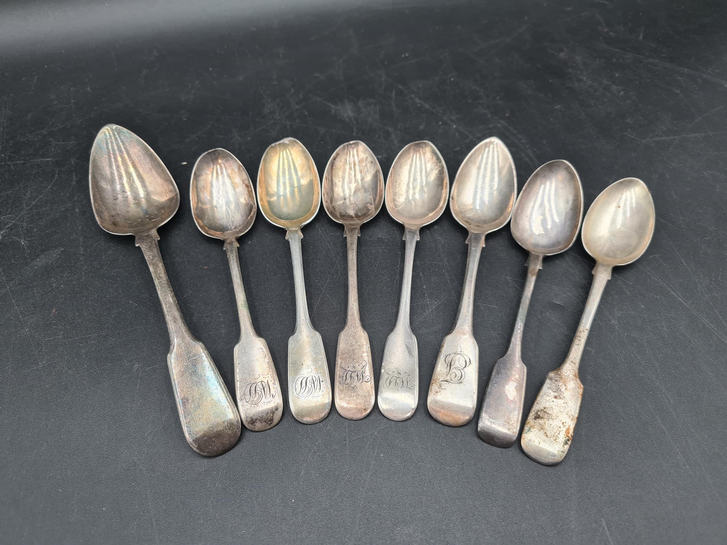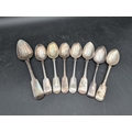 Seven Victorian silver Teaspoons fiddle pattern, various dates and a Dessert Spoon, London 1815, 175gms