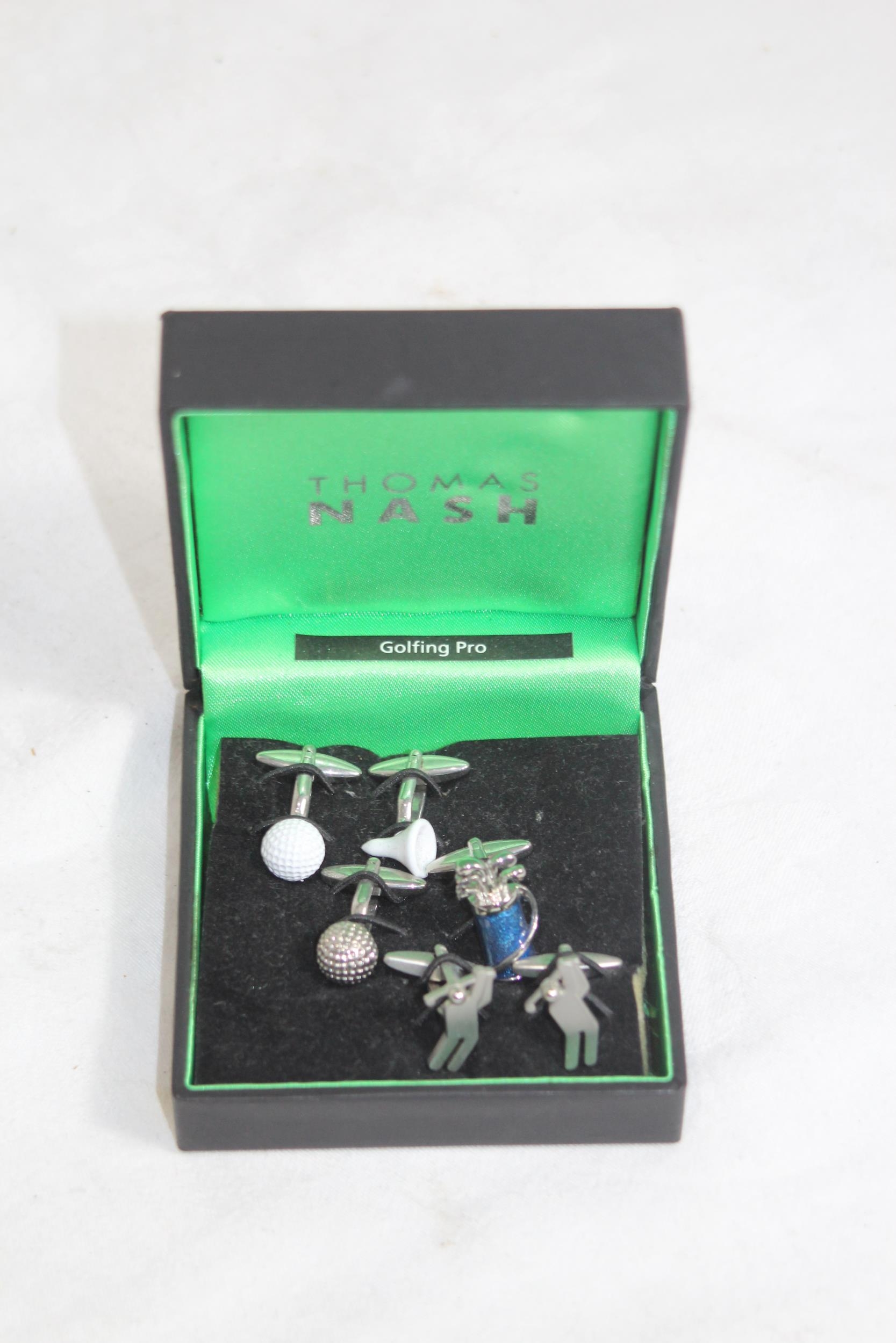 THOMAS NASH GOLFING PRO THREE PAIRS OF CUFFLINKS IN PRESENTATION BOX