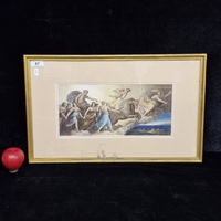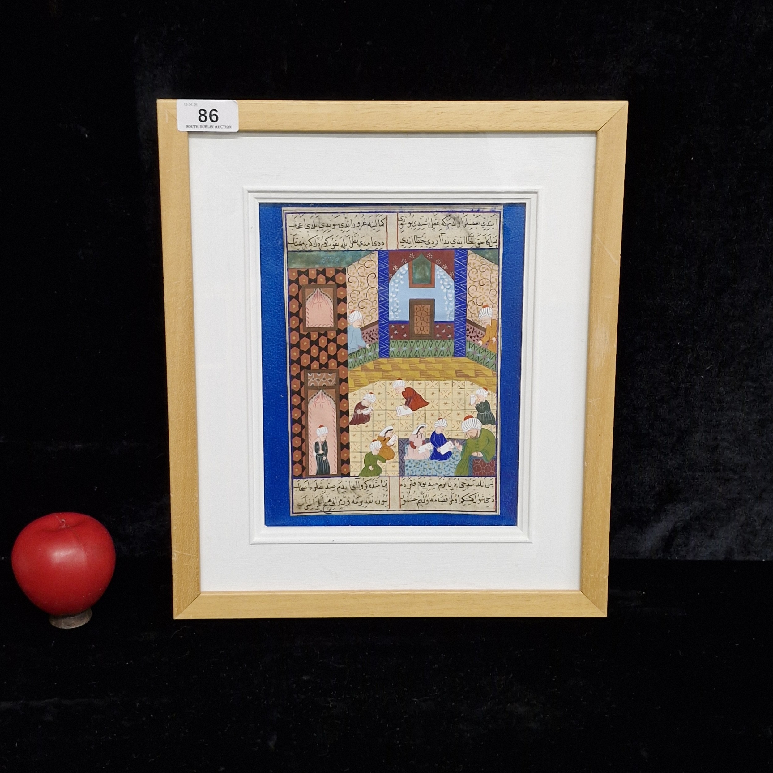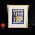 A beautiful hand painted Mughal miniature painting with manuscript. Features royal figures in a courtly scene. Rendered in intricate and delicate brushstrokes. Portrays soft pastel tones with gilt detailing. Housed in a wooden frame behind glass.