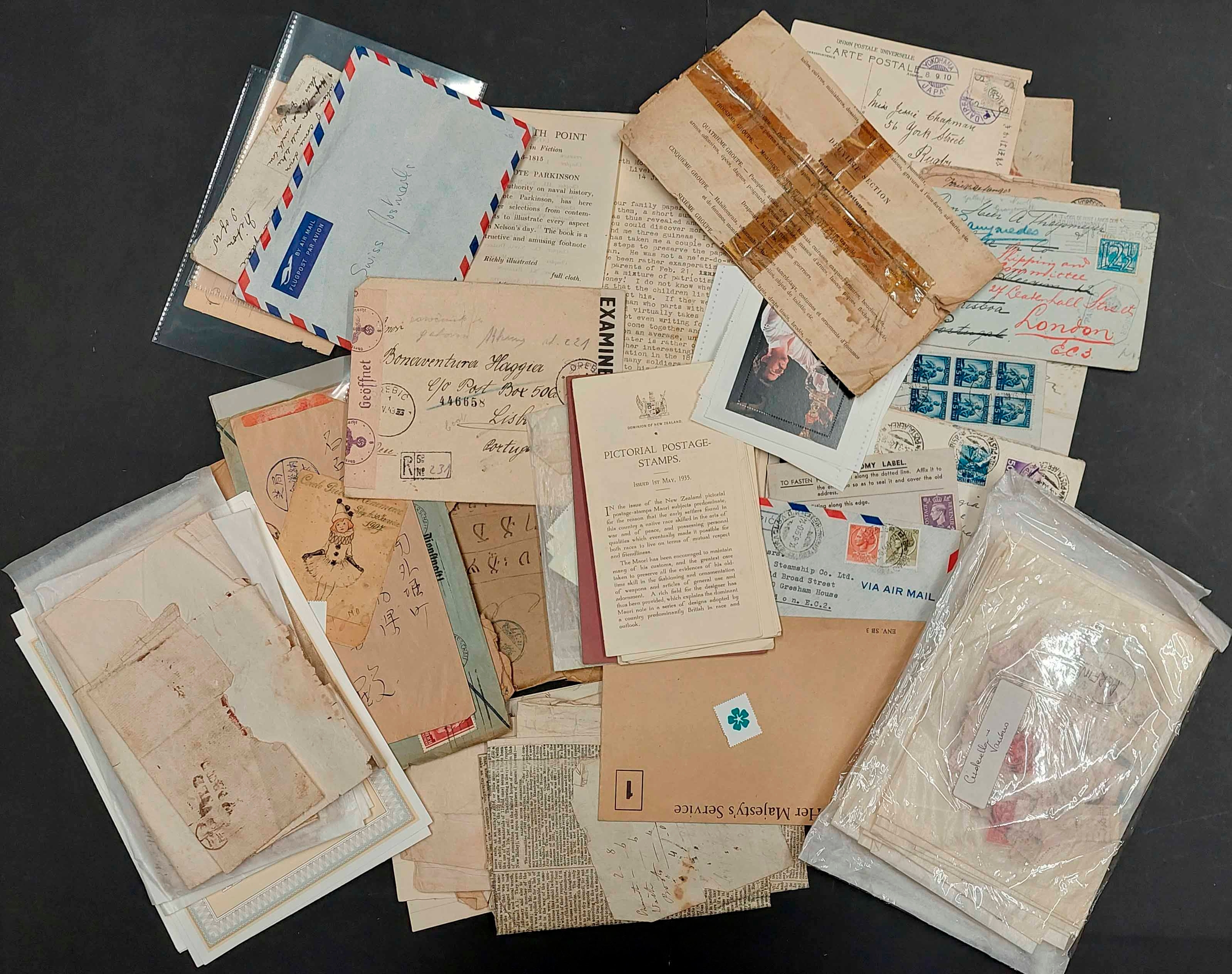 COLLECTOR'S CLEAR OUT: Mostly diverse Postal History items, GB and Worldwide in small box; 18th Century onwards. Very mixed condition. (50+ items) Cross Reference: POSTAL HISTORY