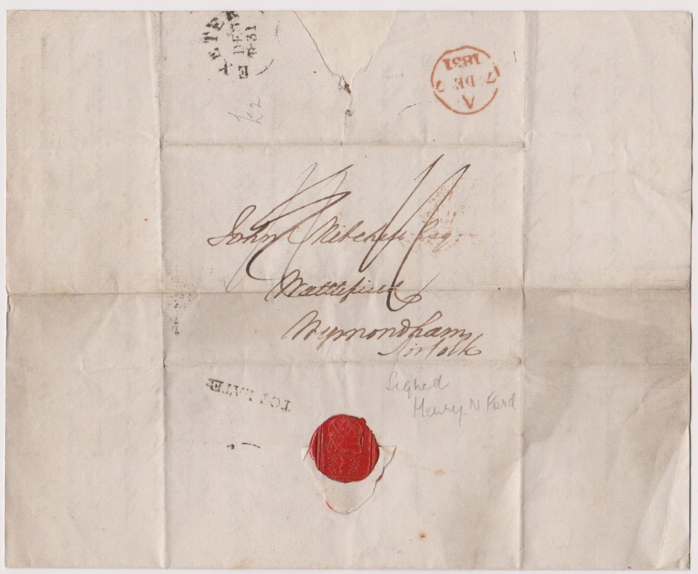 Great Britain 1831-EL dated 4th Dec 1831 Exeter posted to Wymondham-manuscript 1/6 black Exeter/DE7/R31 cancel - red ring A/7DE7/1831 cancel-black single line too late