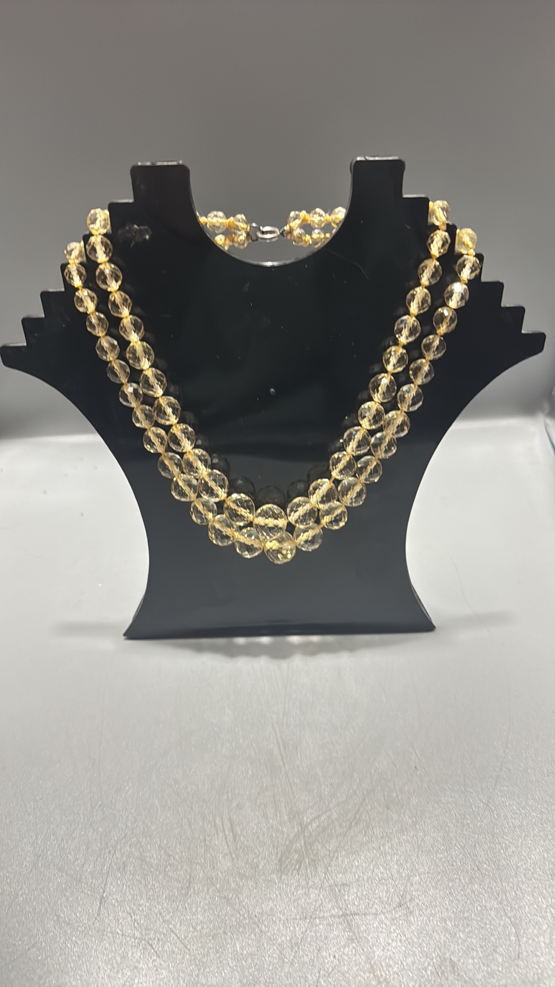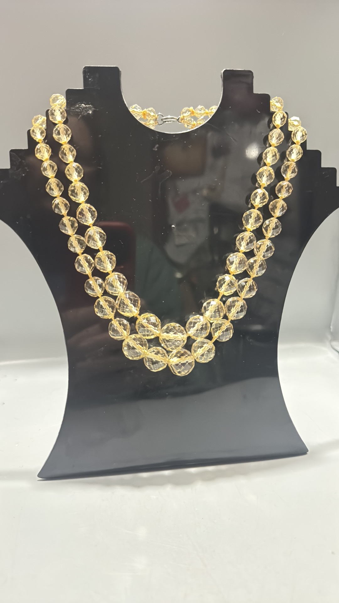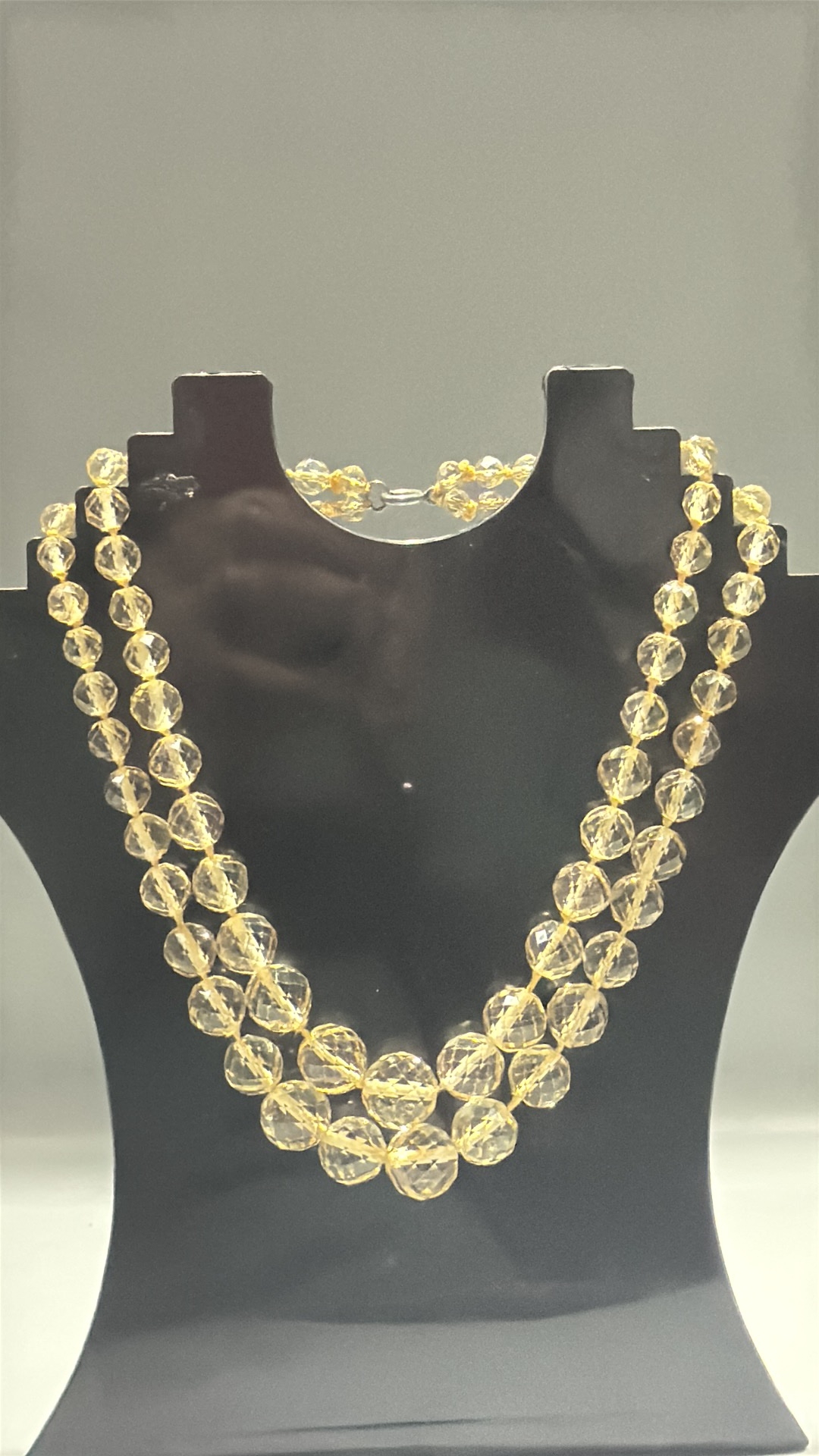 Double-strand necklace of faceted citrine coloured crystal beads, the graduated strands secured by a silver-tone spring-ring clasp.