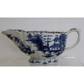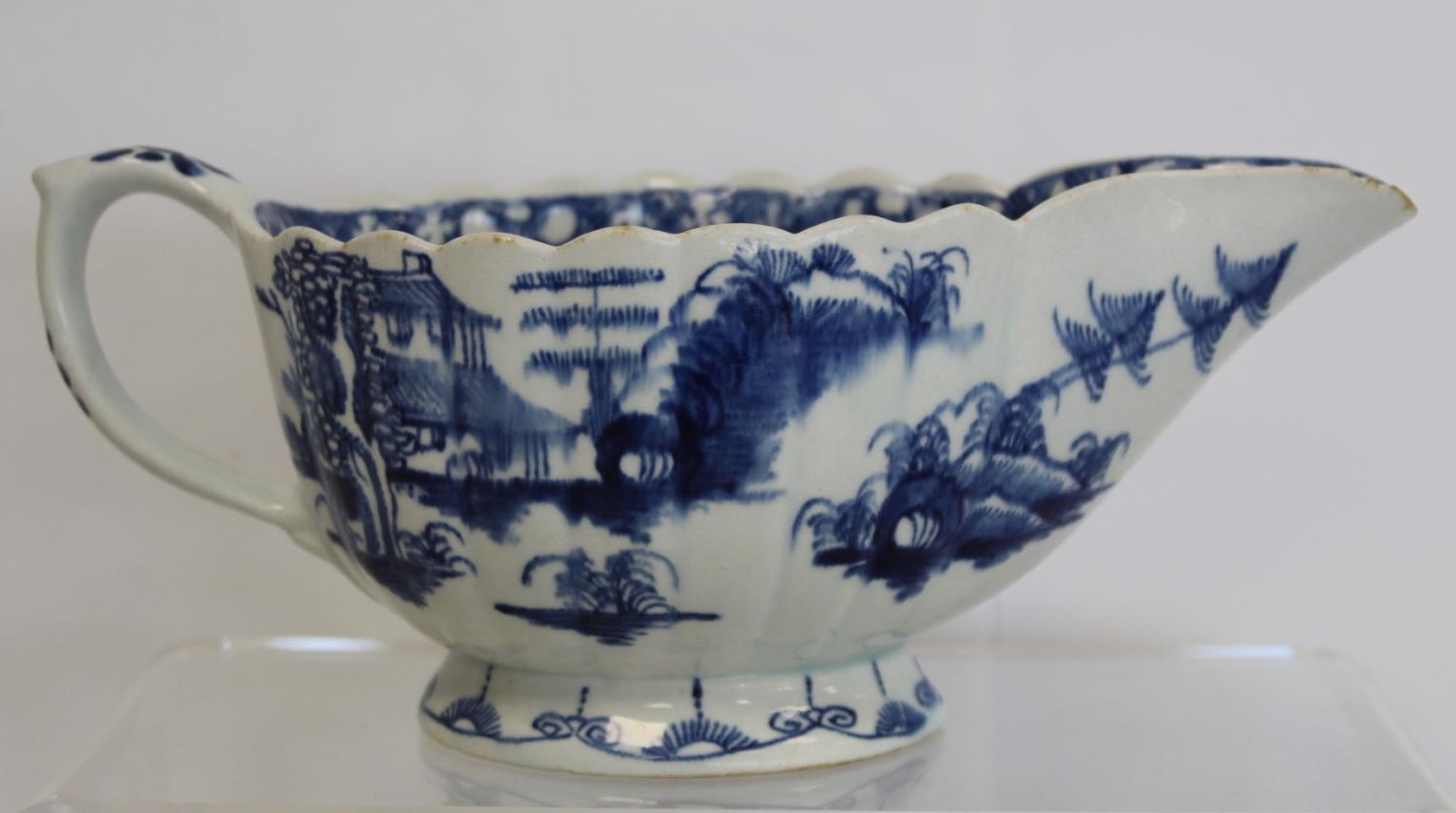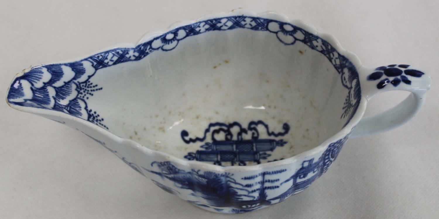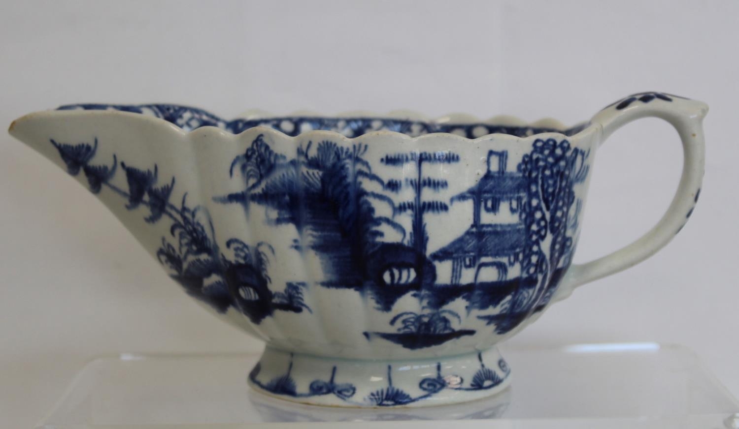 Mid 18th century Bow porcelain blue and white ribbed sauceboat in "Desirable Residence" pattern, the interior with panel of Chinese scrolls and flowerhead and lattice border, heart motif to base of handle, unmarked, 20.5cm long, 9cm high.