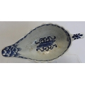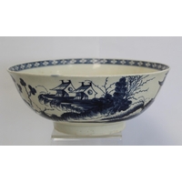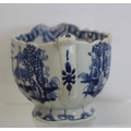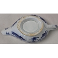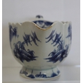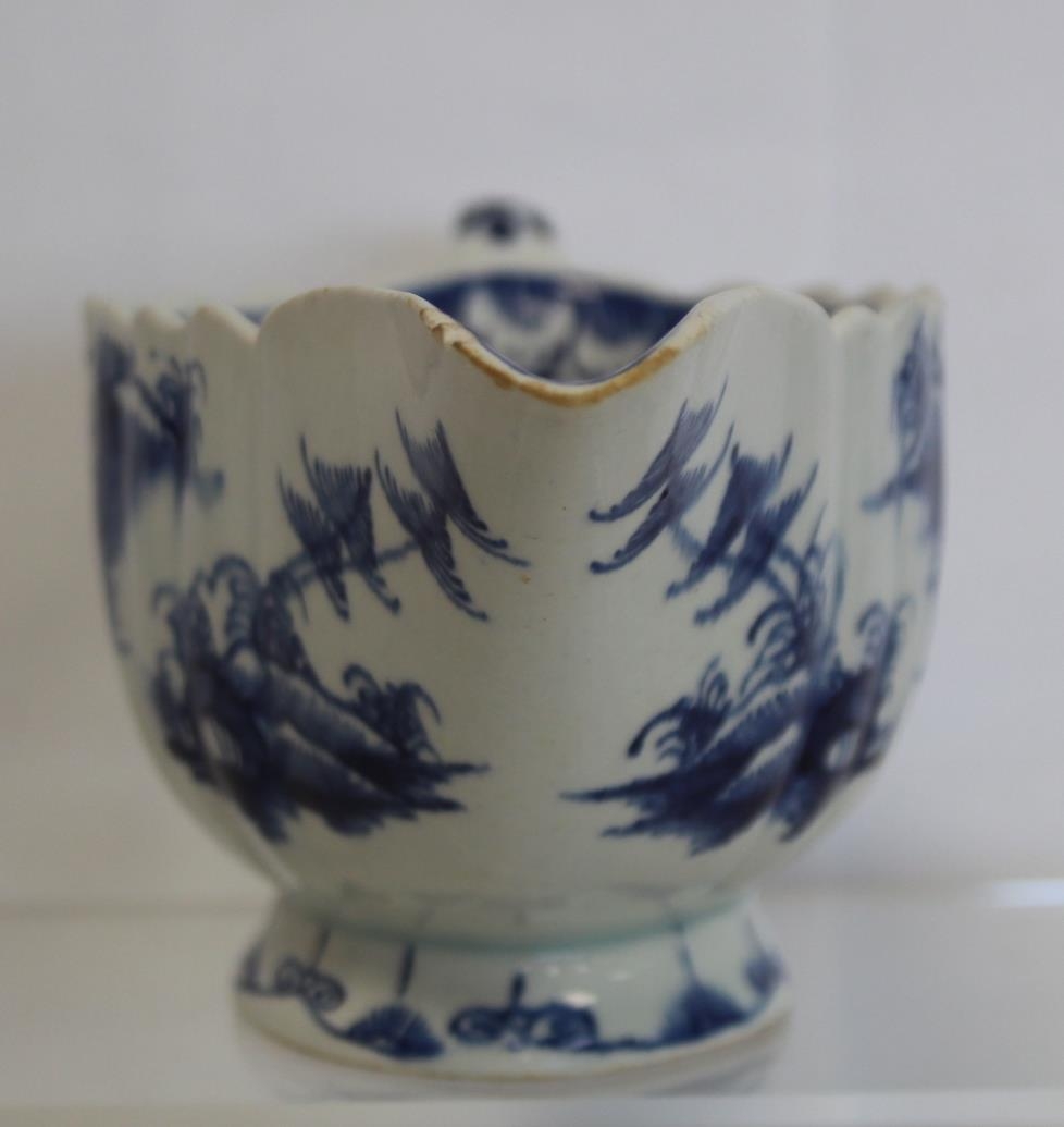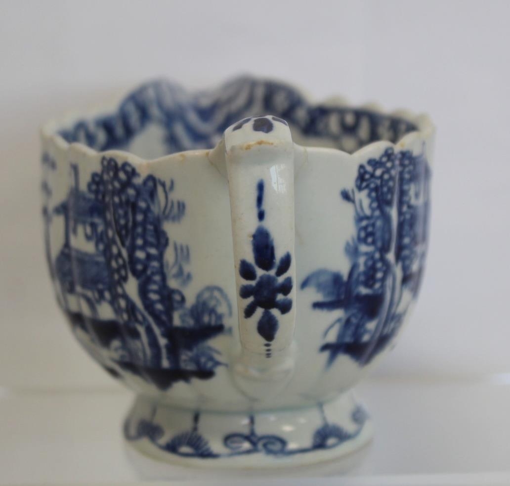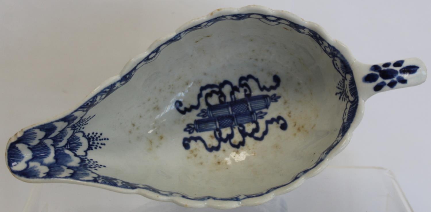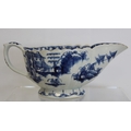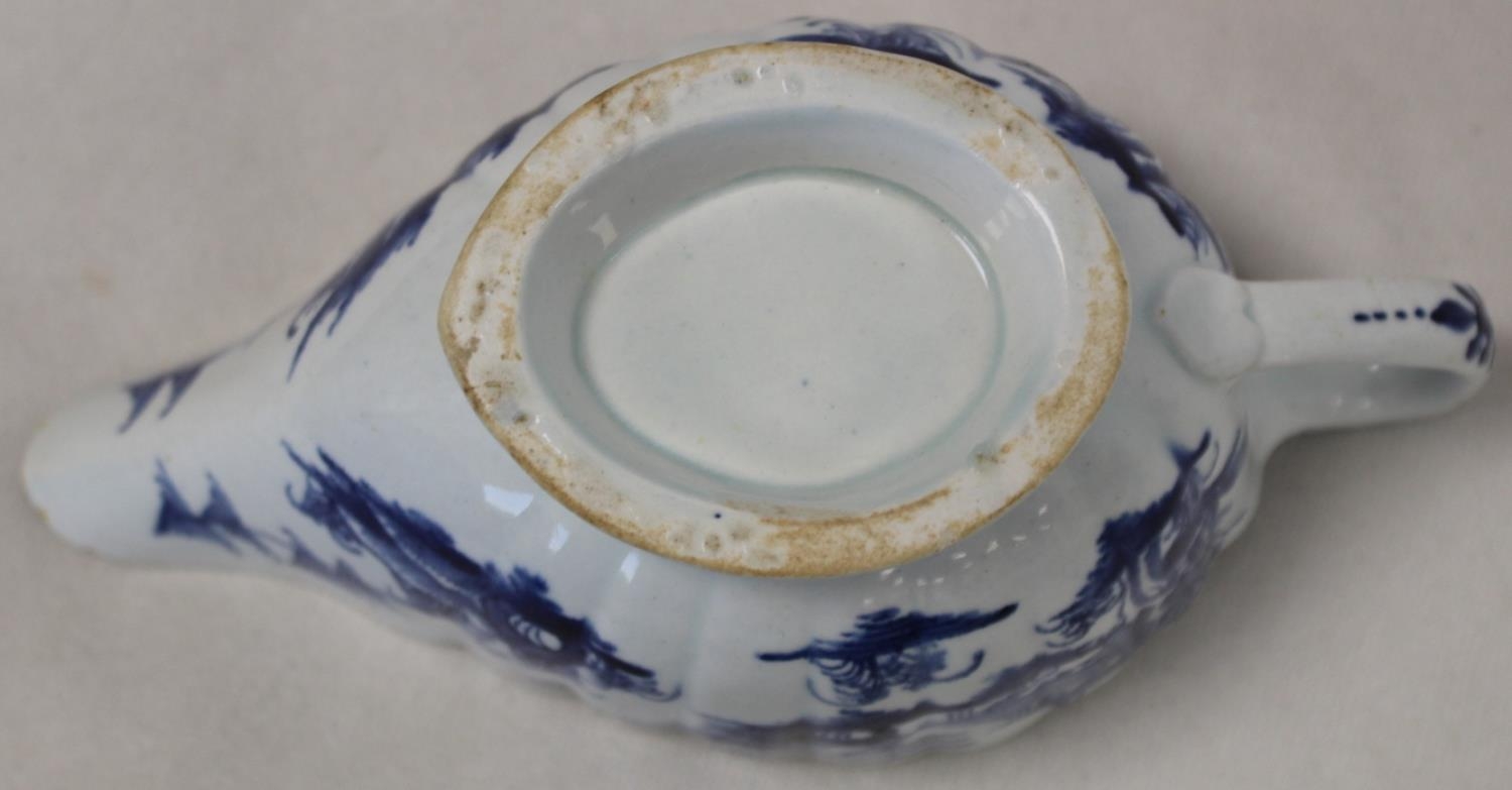 Mid 18th century Bow porcelain blue and white ribbed sauceboat in "Desirable Residence" pattern, the interior with panel of Chinese scrolls and flowerhead and lattice border, heart motif to base of handle, unmarked, 20.5cm long, 9cm high.