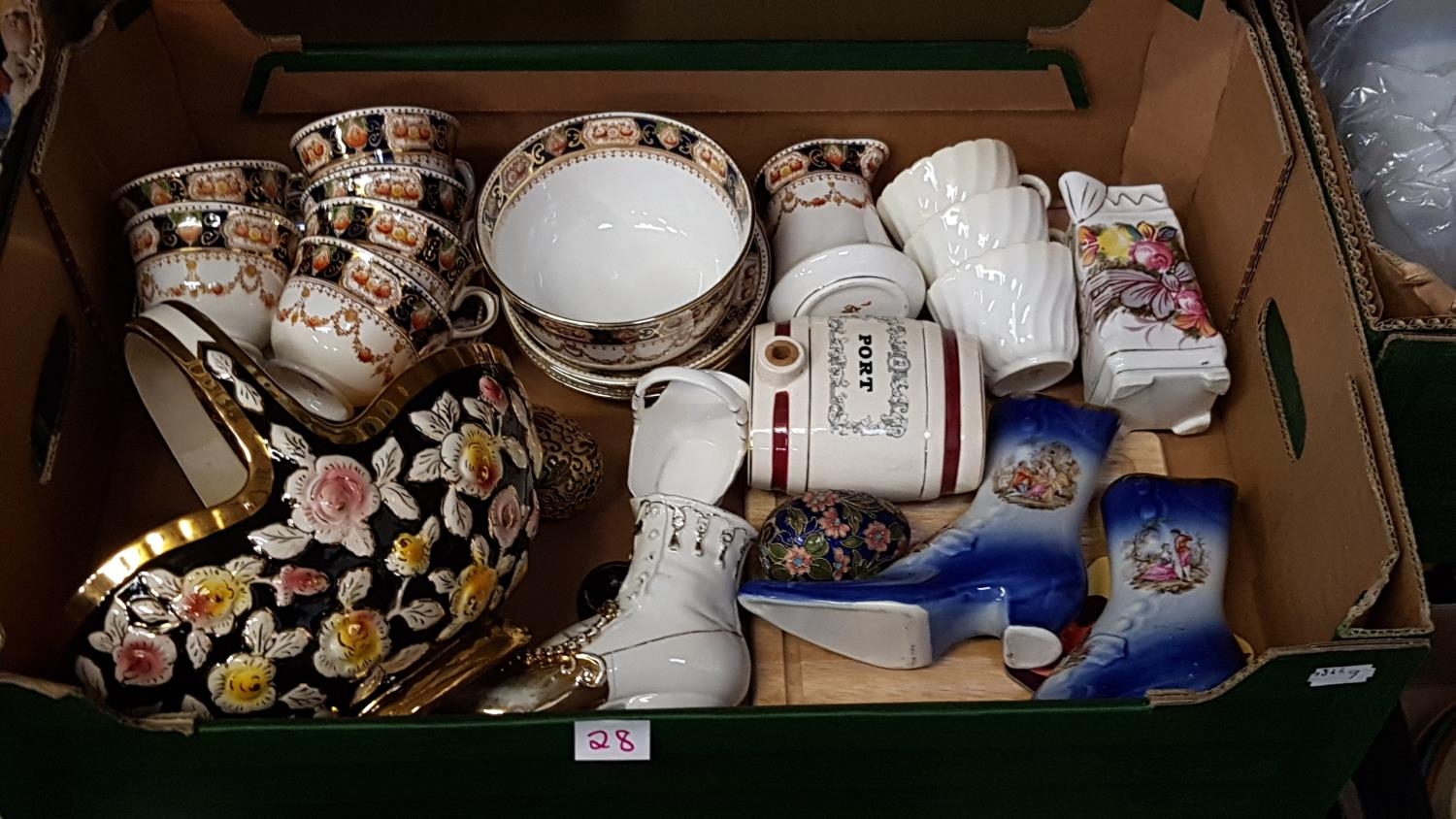 Box to Include Mona Part Tea Set, Decorative Ceramic Basket, Porcelain Shoes etc.