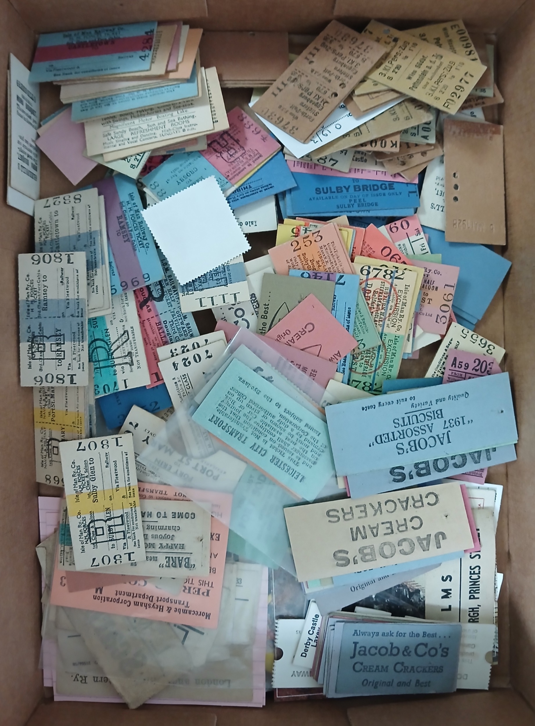 A box of assorted railway, tramway and bus tickets, circa early to mid 20th century.