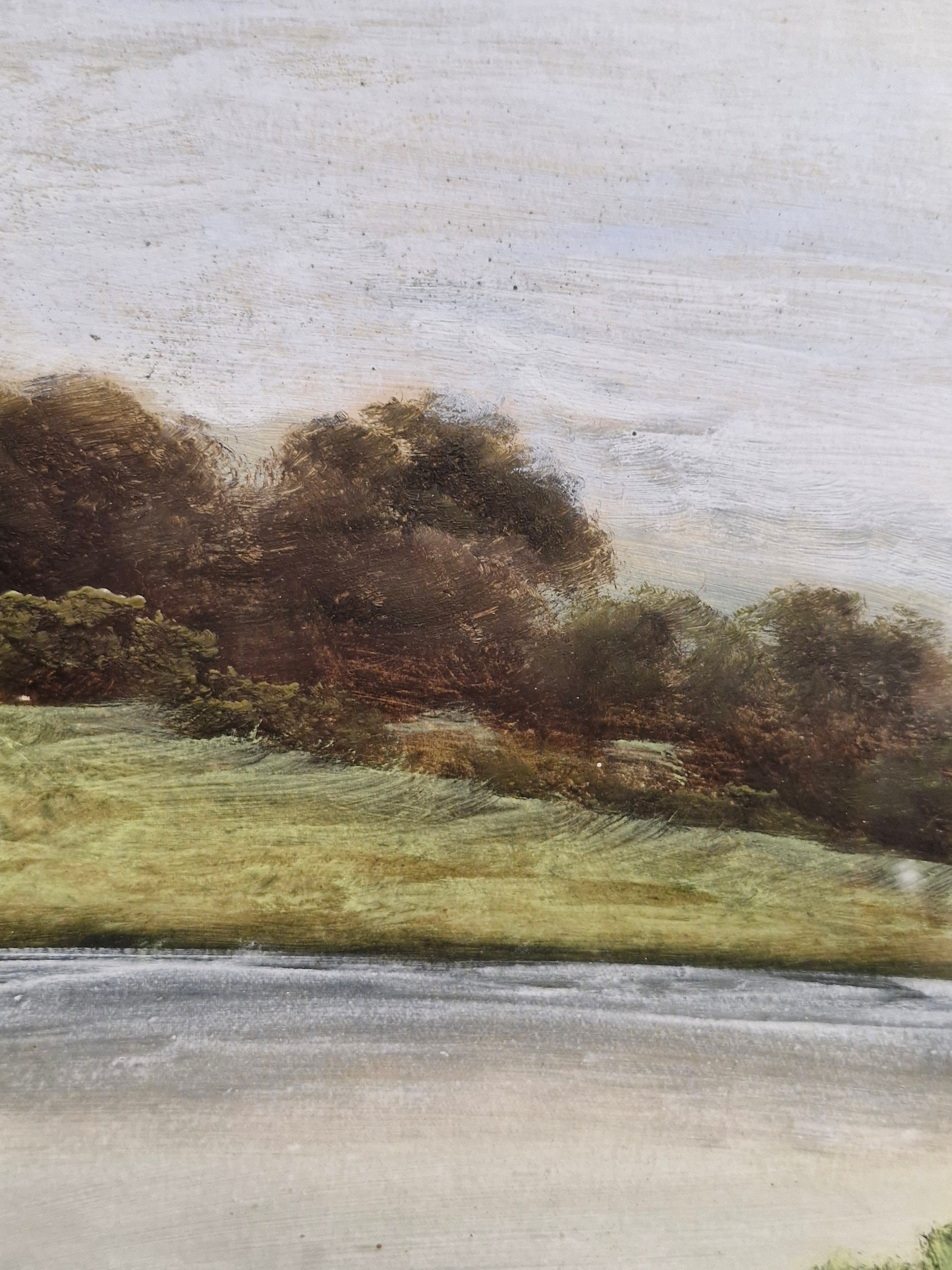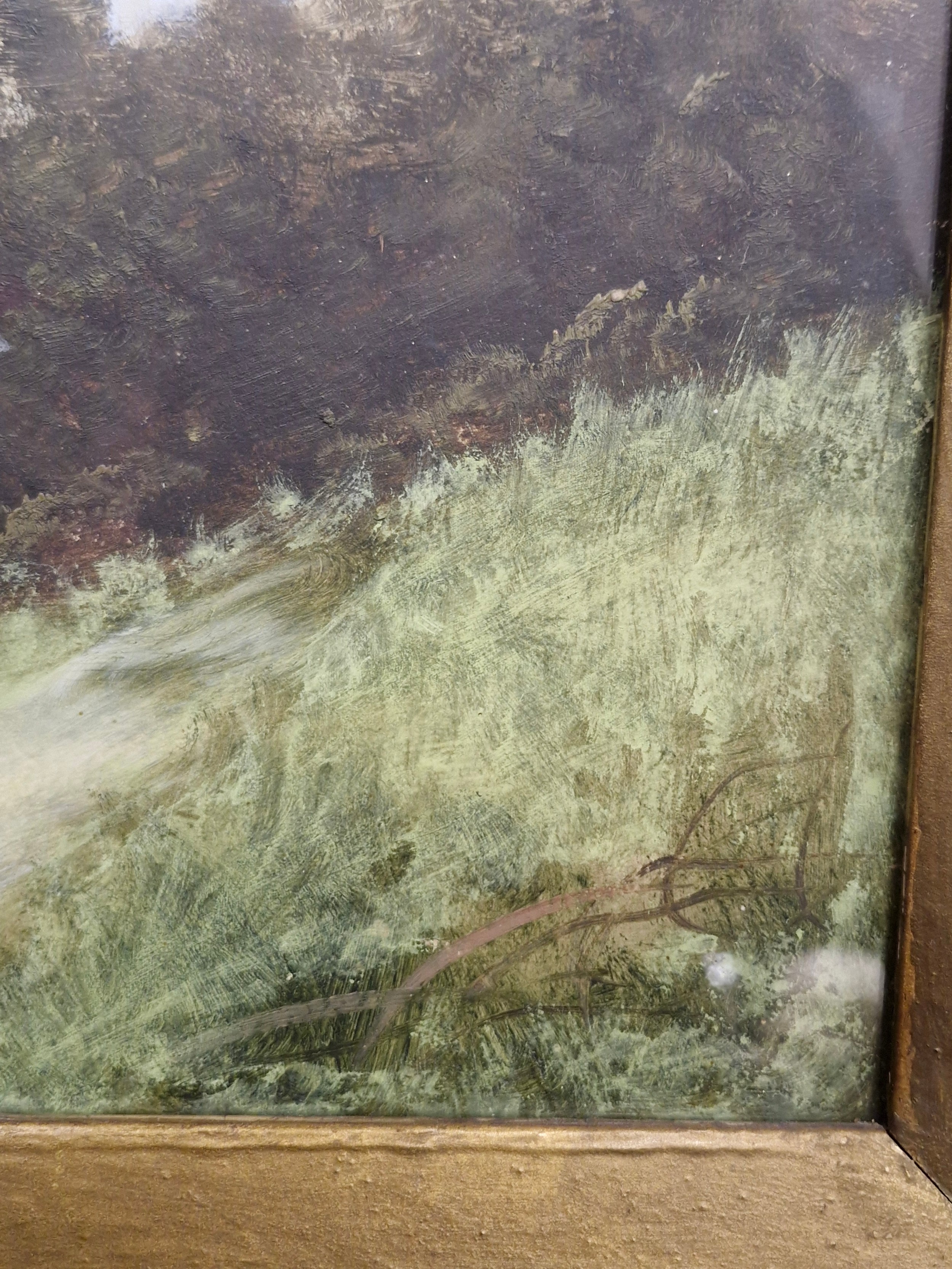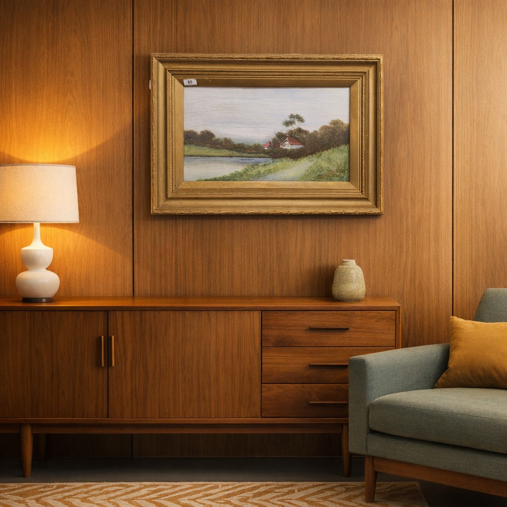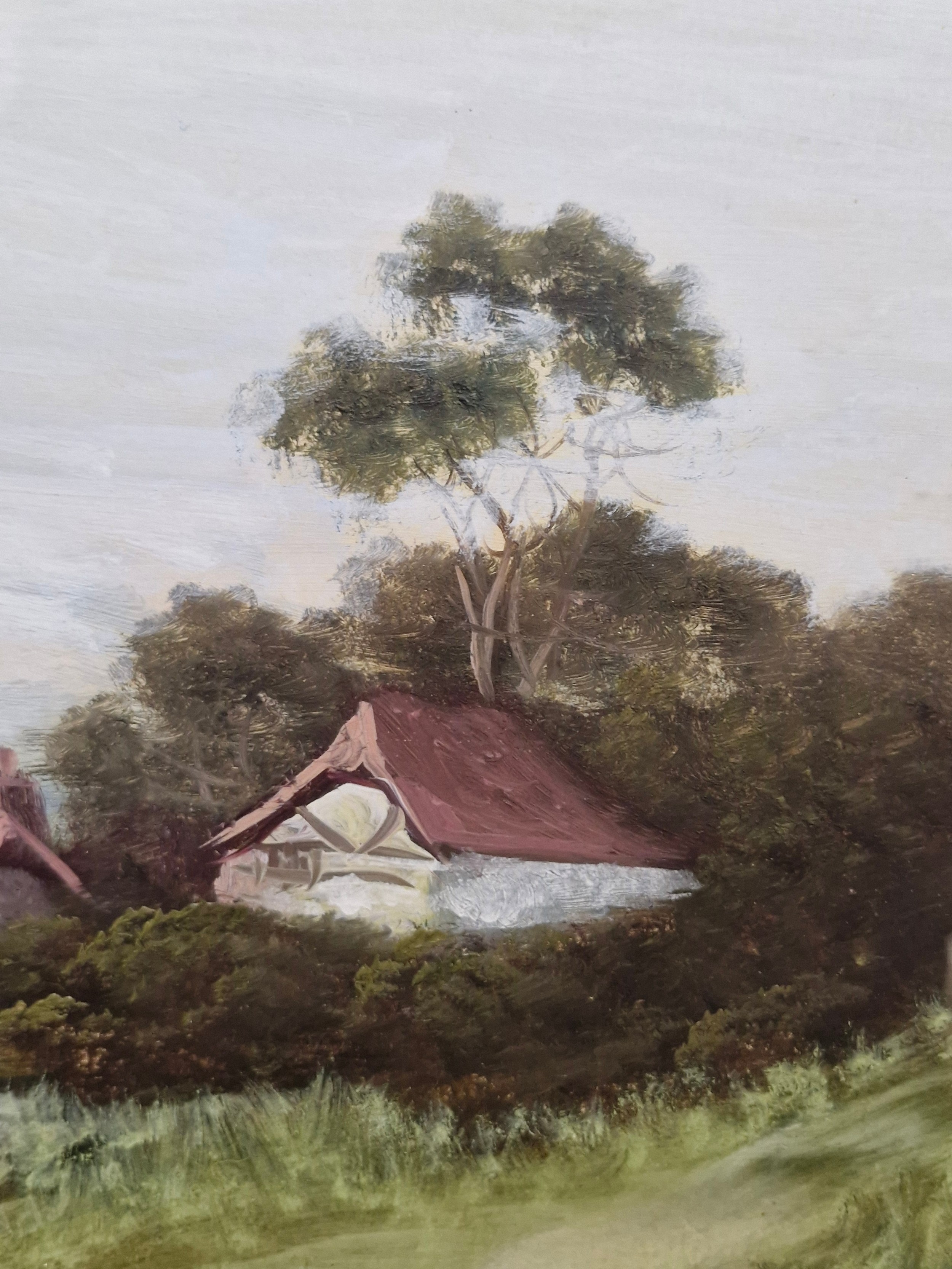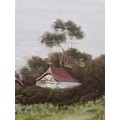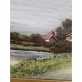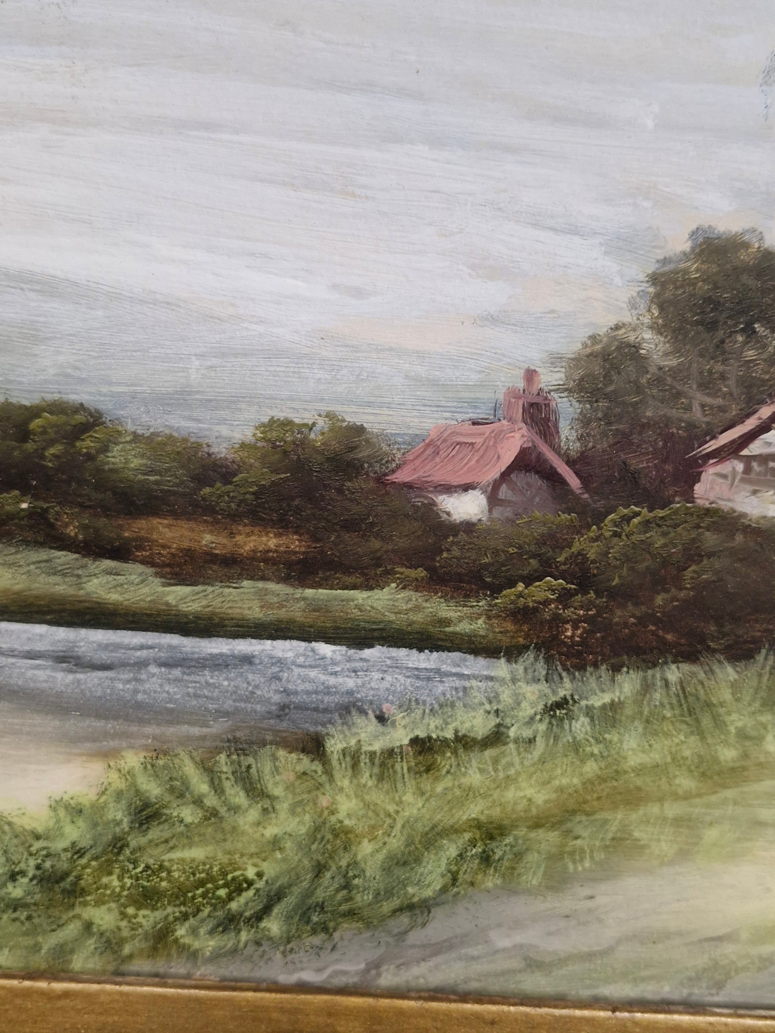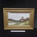 Star Lot: A charming early 20th century gouache on board painting featuring a landscape scene with riverside cottage. Rendered in confident impressionistic brush strokes. Housed in a antique gilt frame behind glass.